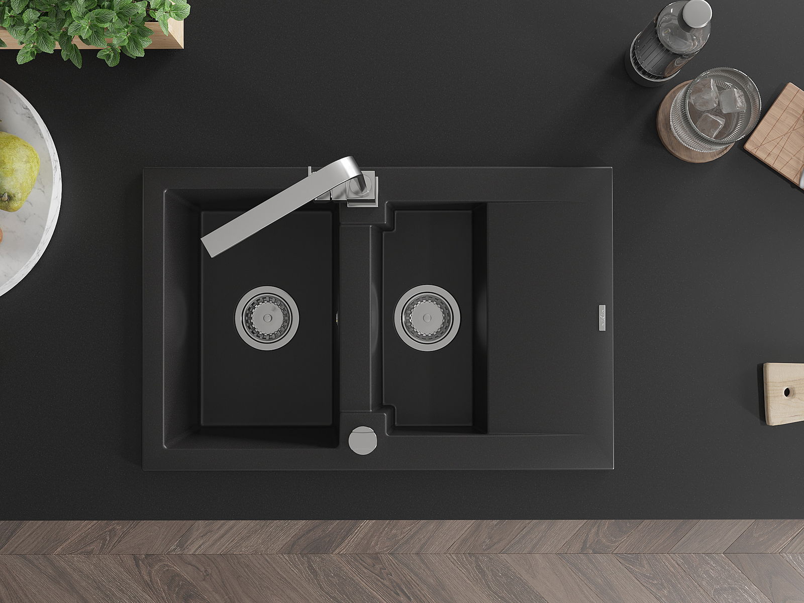 Mexen Gaspar zlewozmywak granitowy 1,5-komorowy z ociekaczem i baterią kuchenną Rita, czarny - 6507-77-670300-00