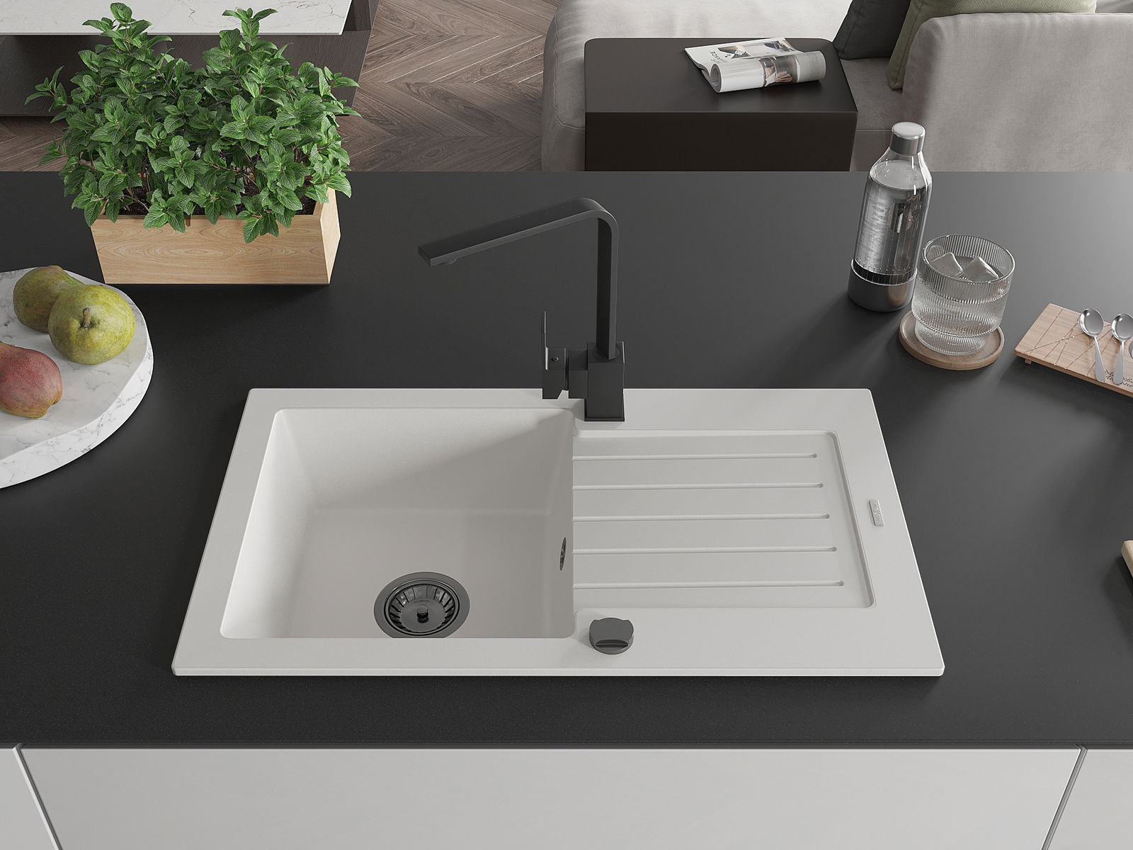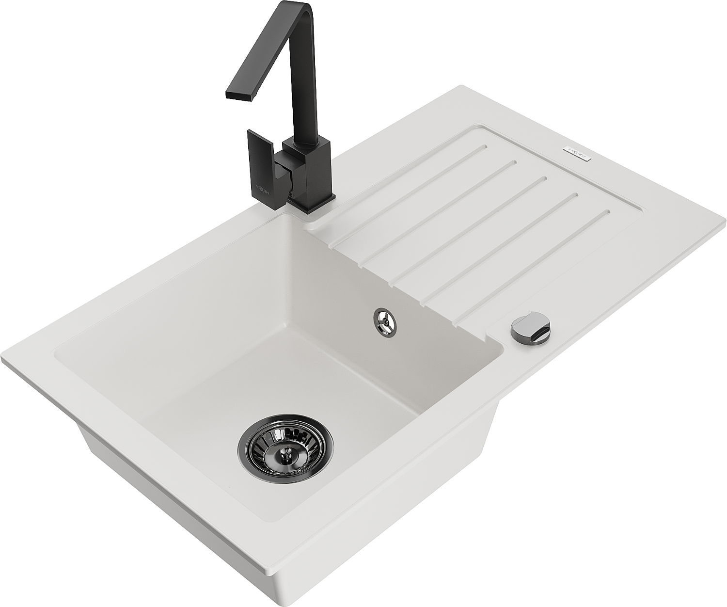 Mexen Pablo zlewozmywak granitowy 1-komorowy z ociekaczem i baterią kuchenną Rita, biały - 6510-20-670300-70