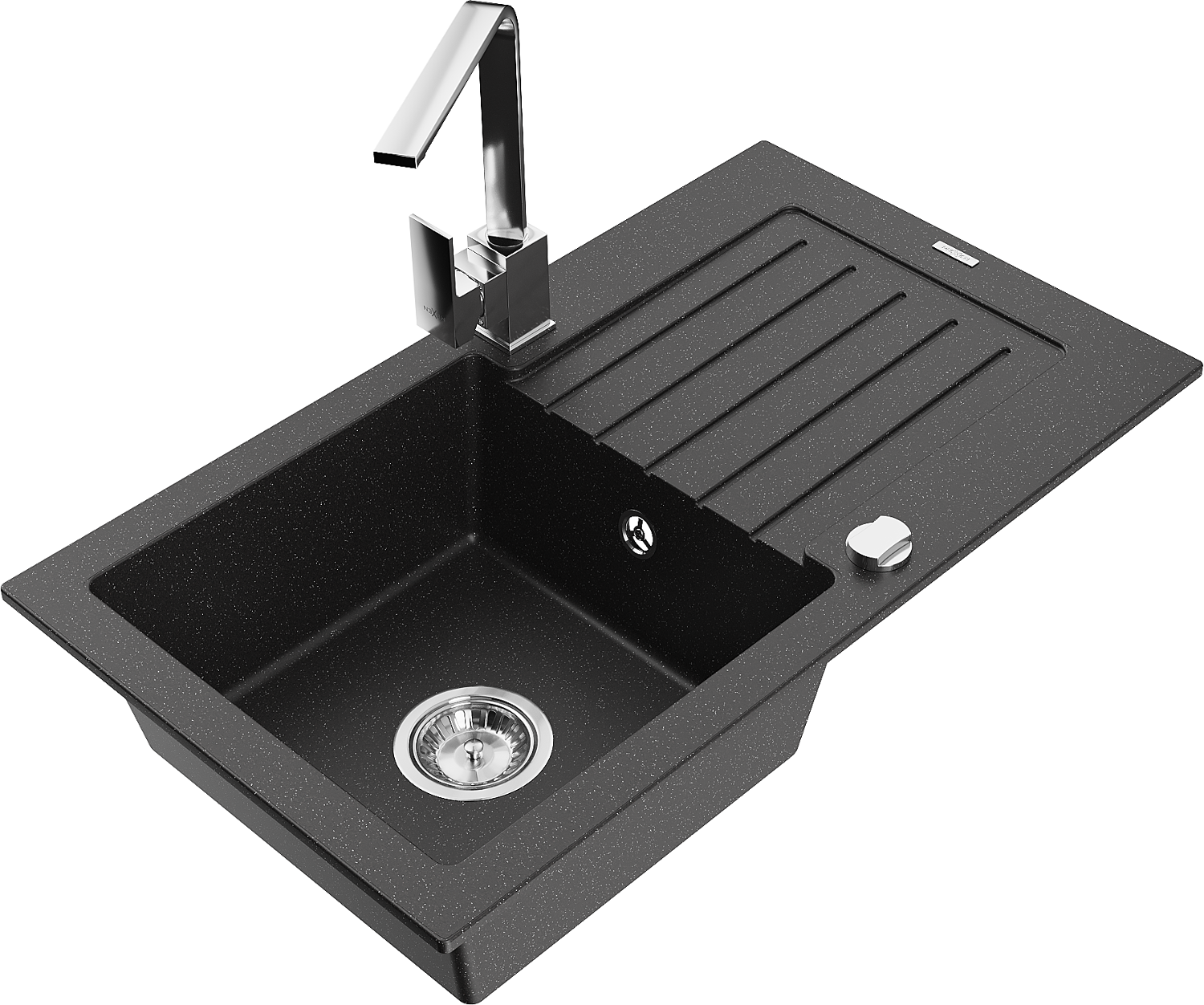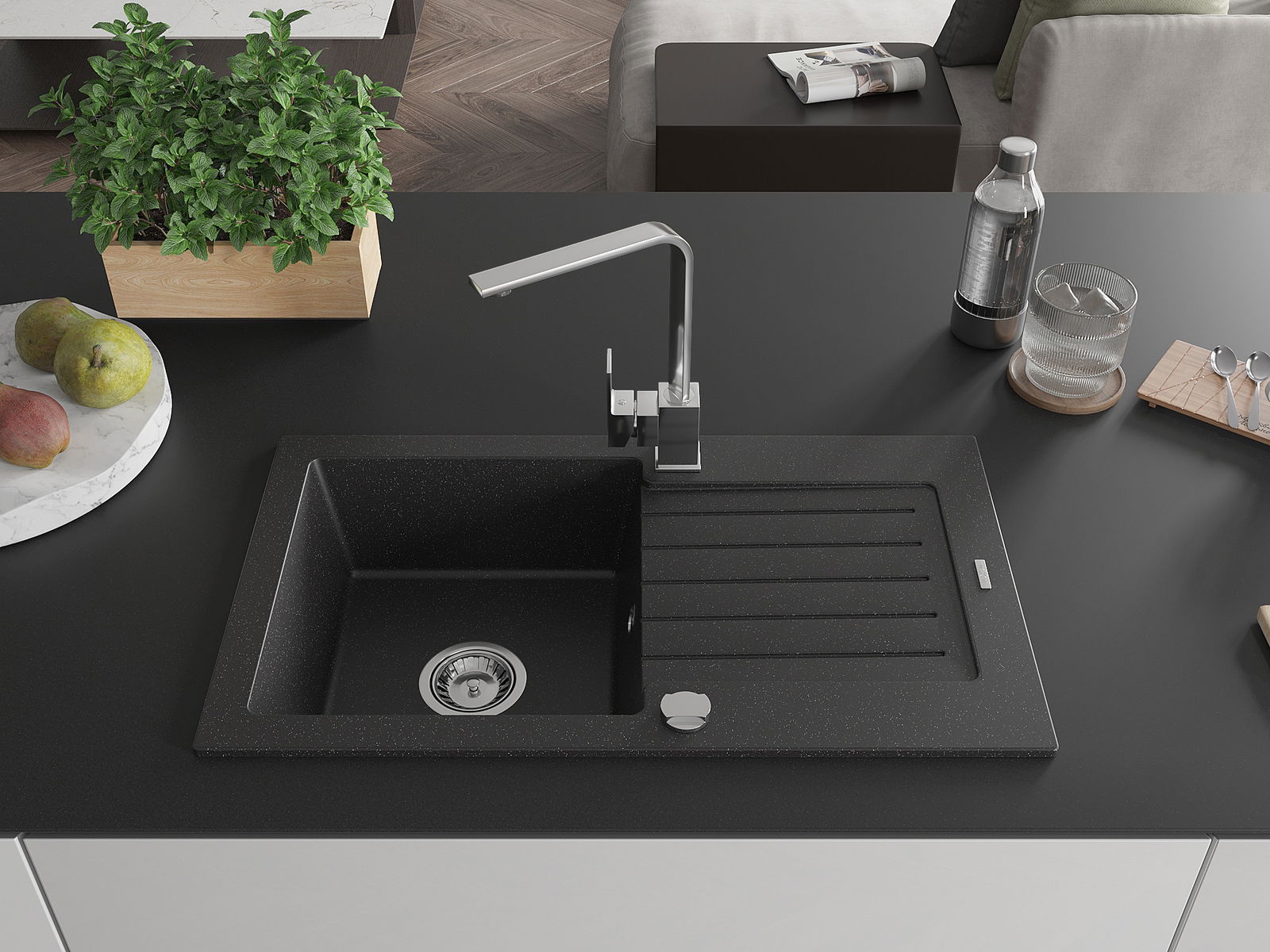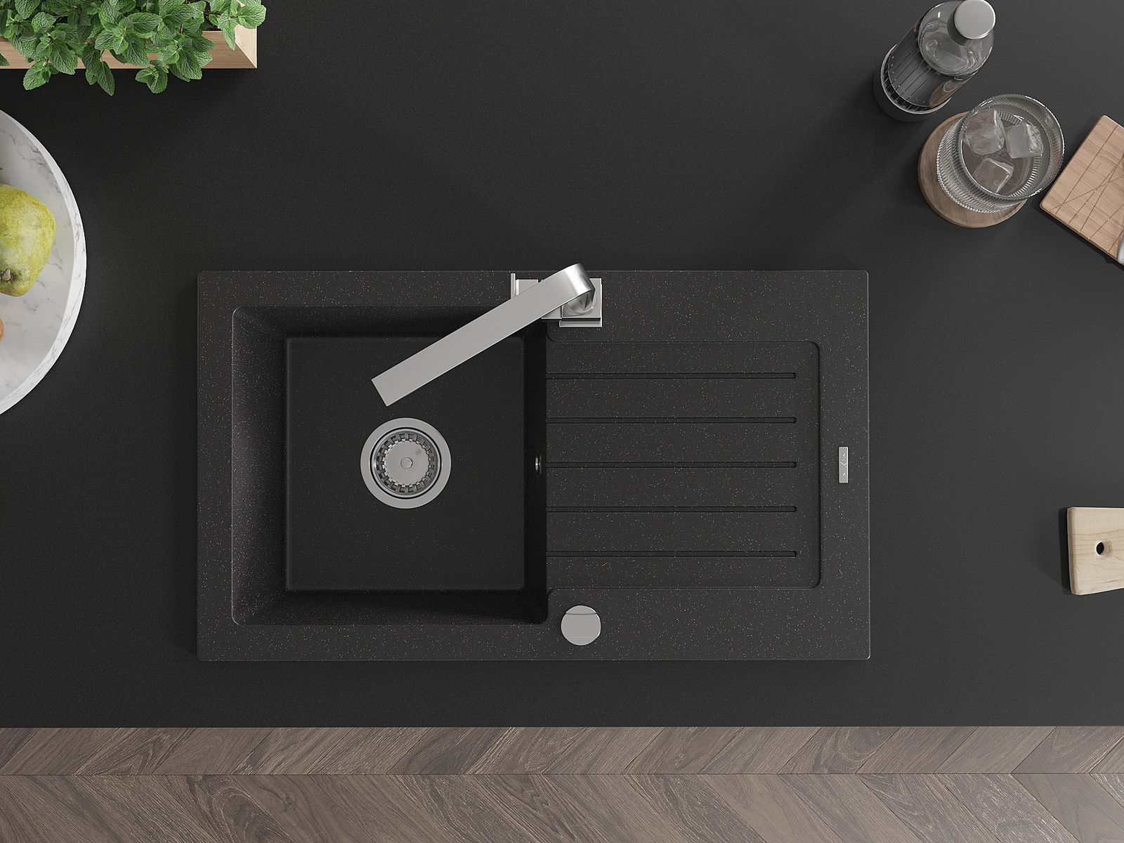 Mexen Pablo zlewozmywak granitowy 1-komorowy z ociekaczem i baterią kuchenną Rita, czarny/srebrny metalik- 6510-73-670300-00