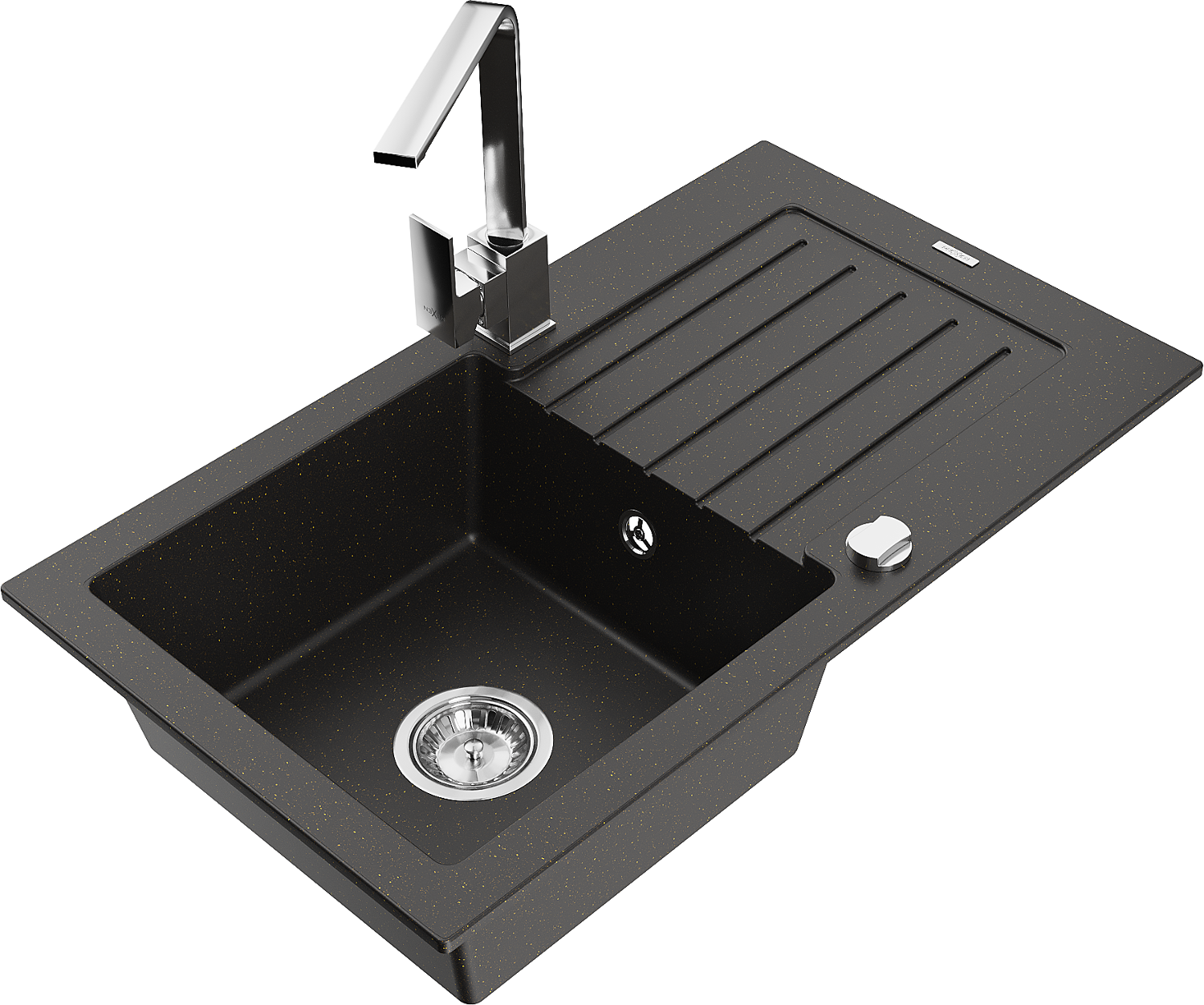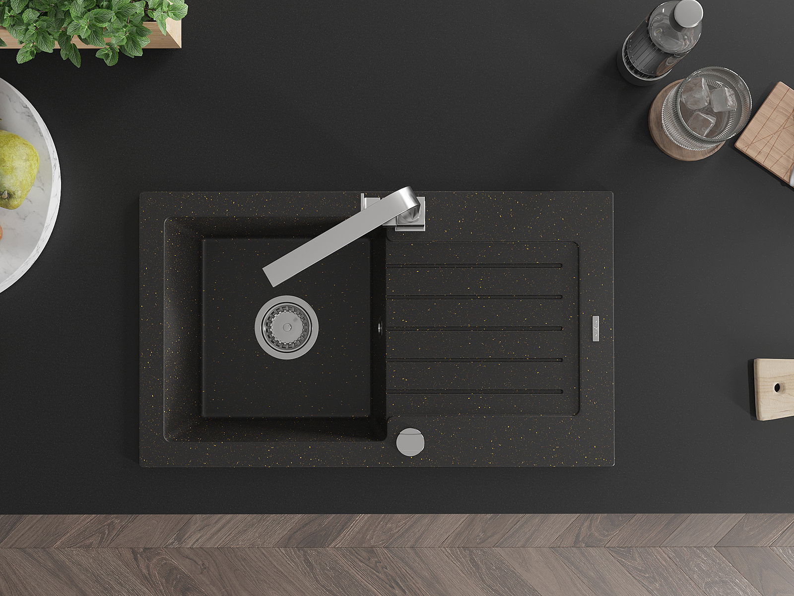 Mexen Pablo zlewozmywak granitowy 1-komorowy z ociekaczem i baterią kuchenną Rita, czarny/złoty metalik- 6510-75-670300-00