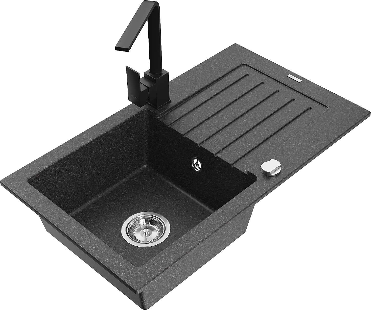 Mexen Pablo zlewozmywak granitowy 1-komorowy z ociekaczem i baterią kuchenną Rita, czarny nakrapiany- 6510-76-670300-70