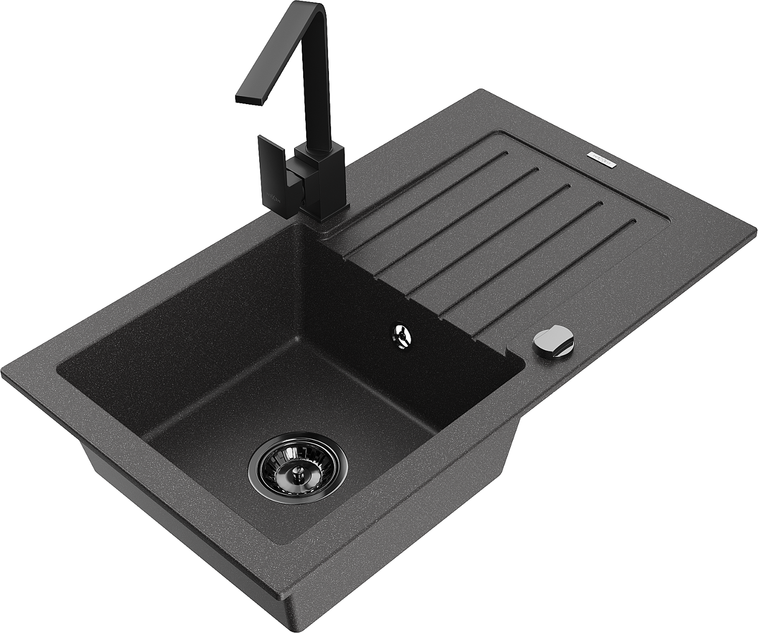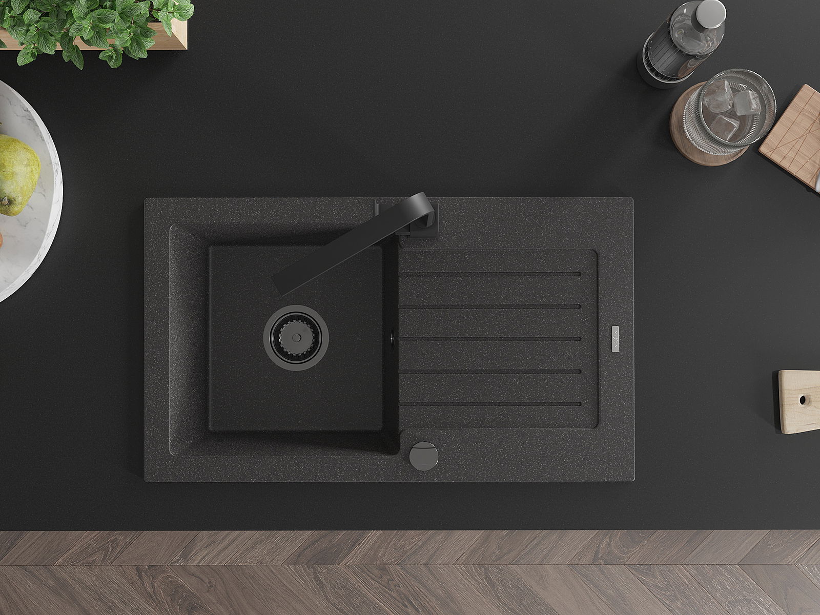 Mexen Pablo zlewozmywak granitowy 1-komorowy z ociekaczem i baterią kuchenną Rita, czarny nakrapiany- 6510-76-670300-70-B