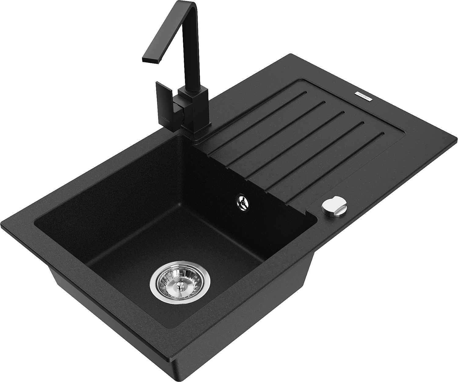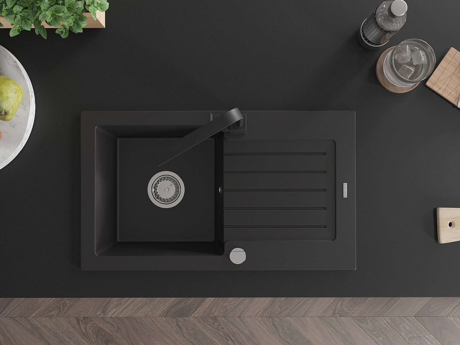 Mexen Pablo zlewozmywak granitowy 1-komorowy z ociekaczem i baterią kuchenną Rita, czarny - 6510-77-670300-70