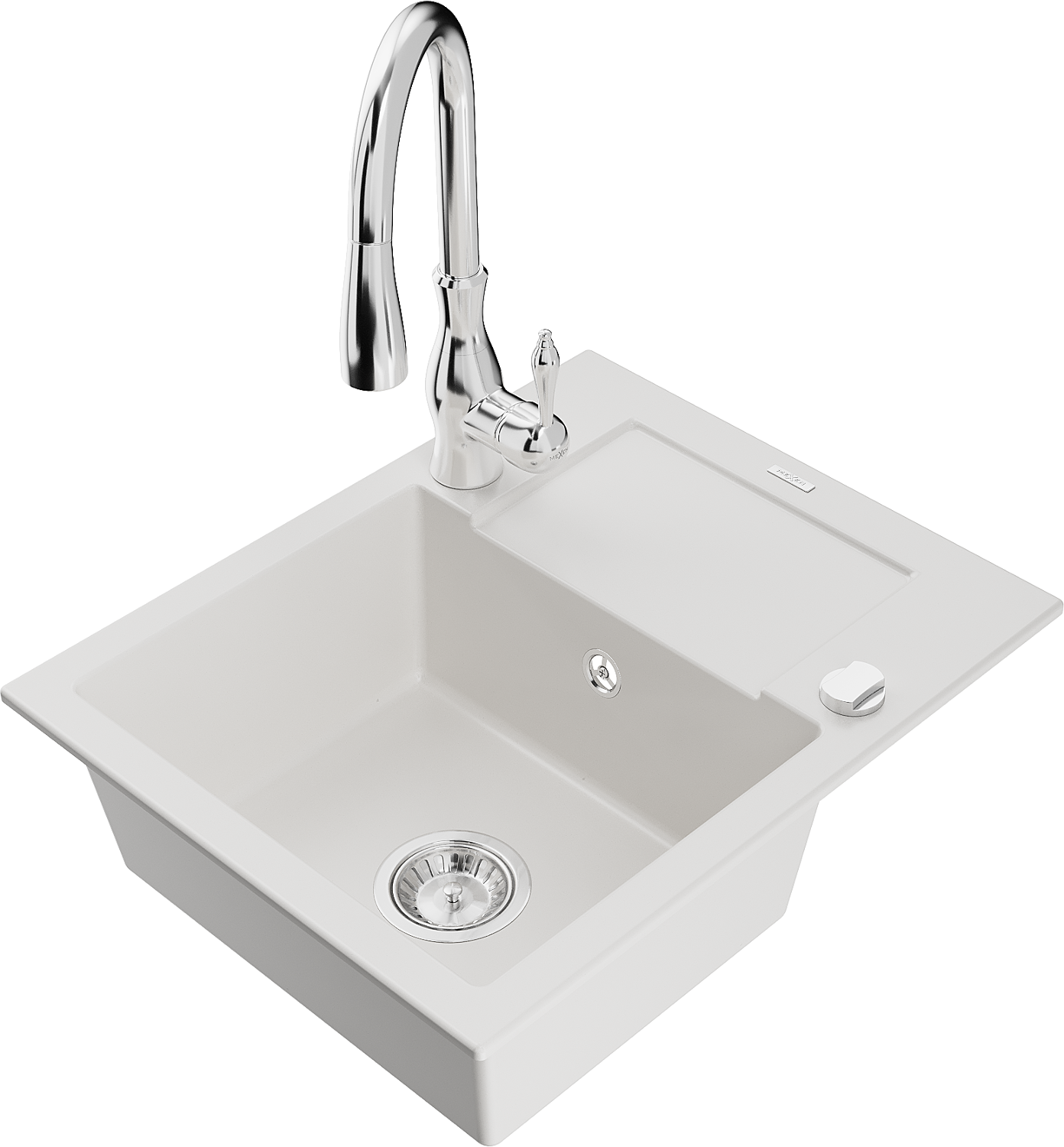 Mexen Enzo zlewozmywak granitowy 1-komorowy z ociekaczem i baterią kuchenną Savita, biały - 6506-20-672601-00