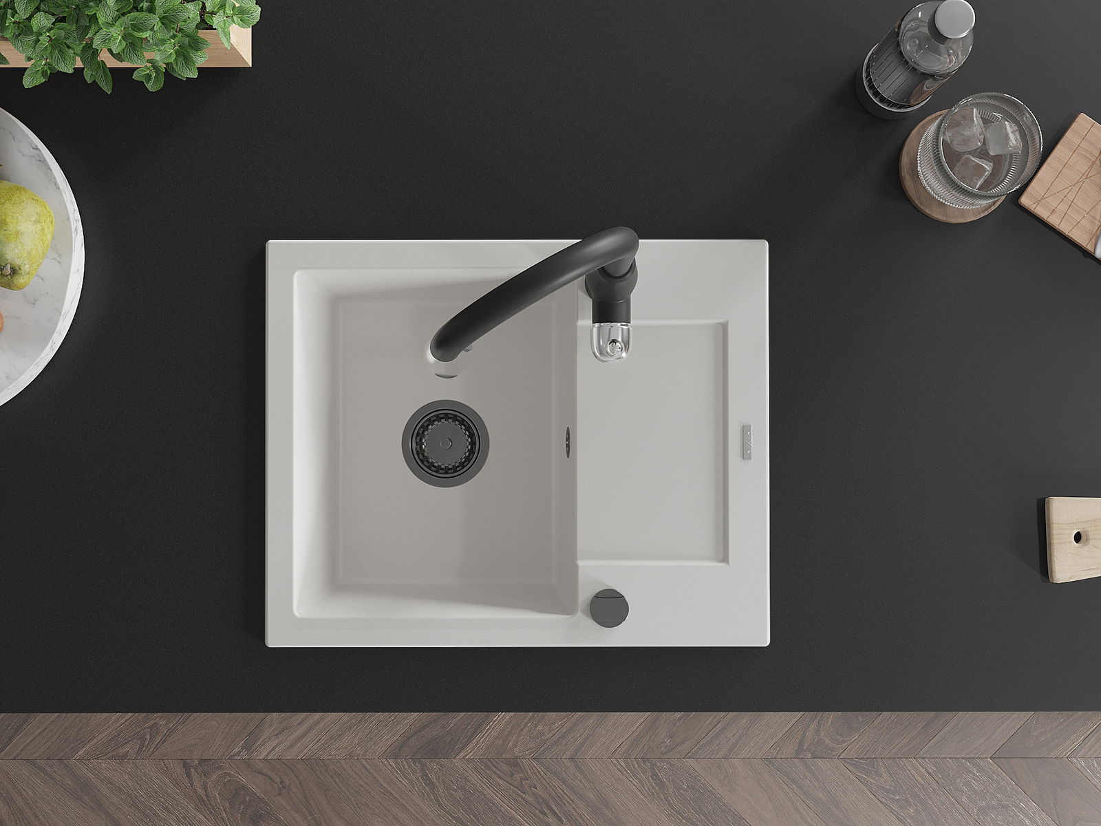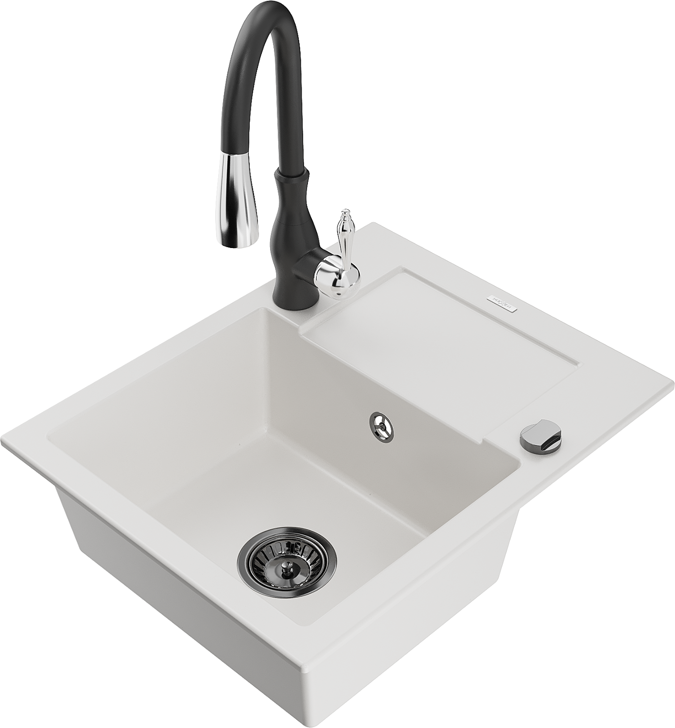 Mexen Enzo zlewozmywak granitowy 1-komorowy z ociekaczem i baterią kuchenną Savita, biały - 6506-20-672601-70