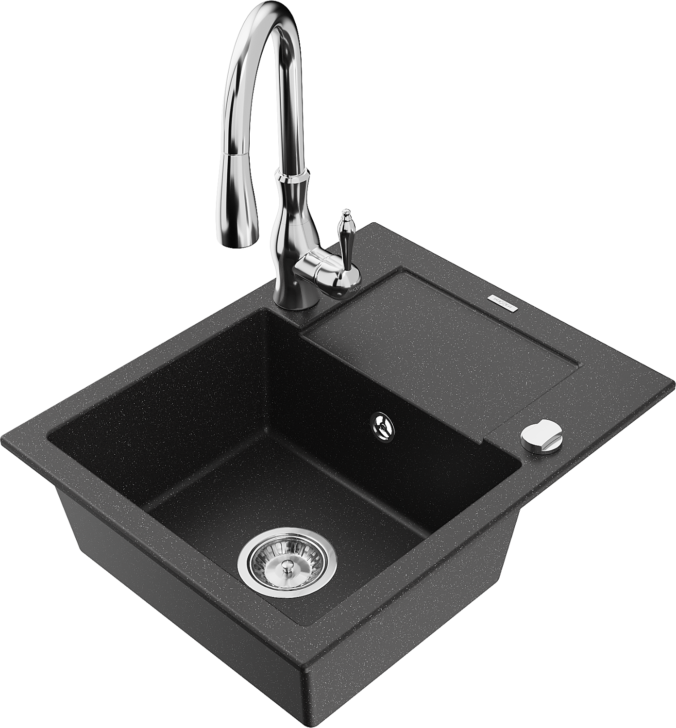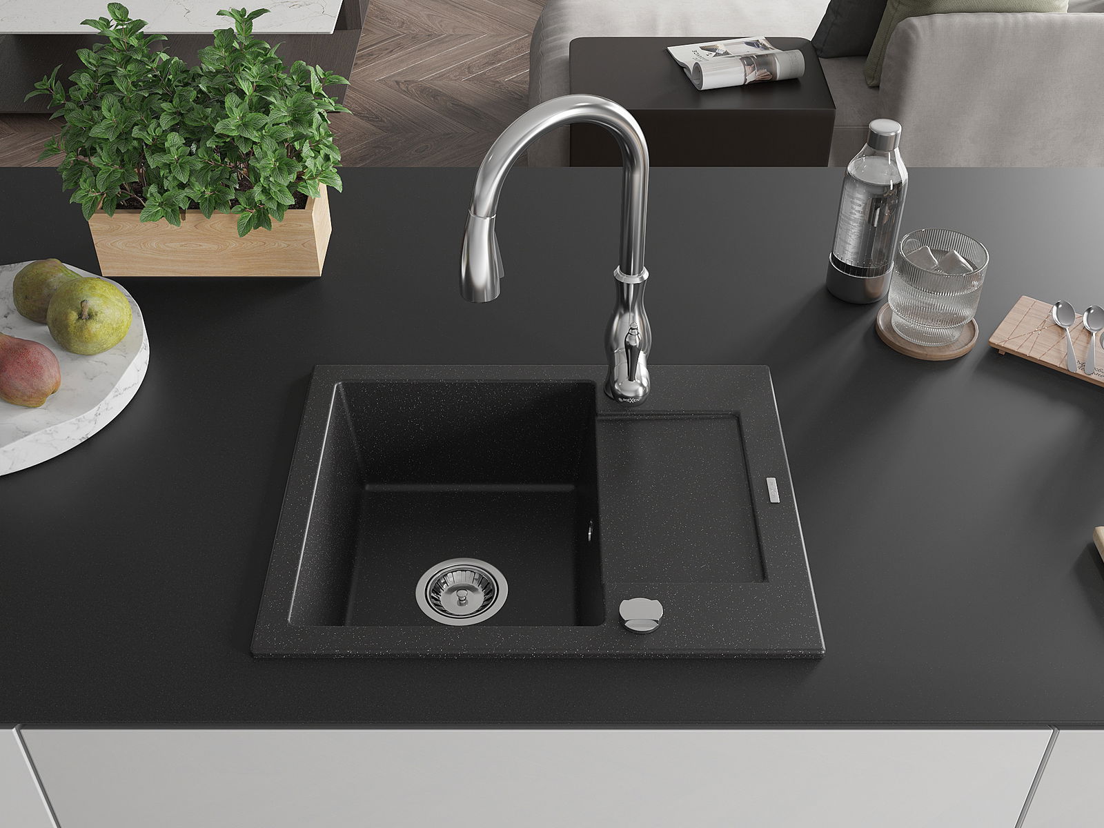 Mexen Enzo zlewozmywak granitowy 1-komorowy z ociekaczem i baterią kuchenną Savita, czarny/srebrny metalik - 6506-73-672601-00