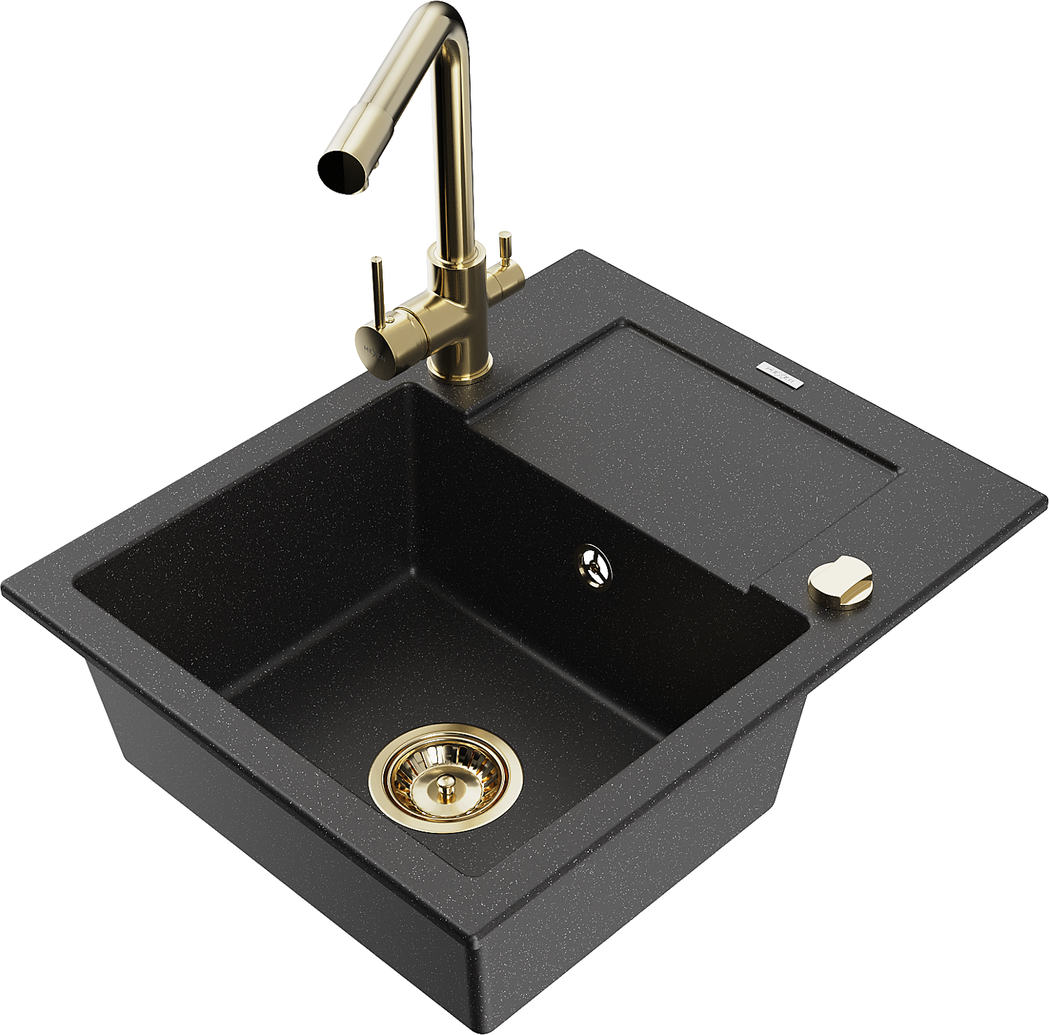 Mexen Enzo zlewozmywak granitowy 1-komorowy z ociekaczem i baterią kuchenną Duero, czarny/srebrny metalik - 6506-73-671600-50