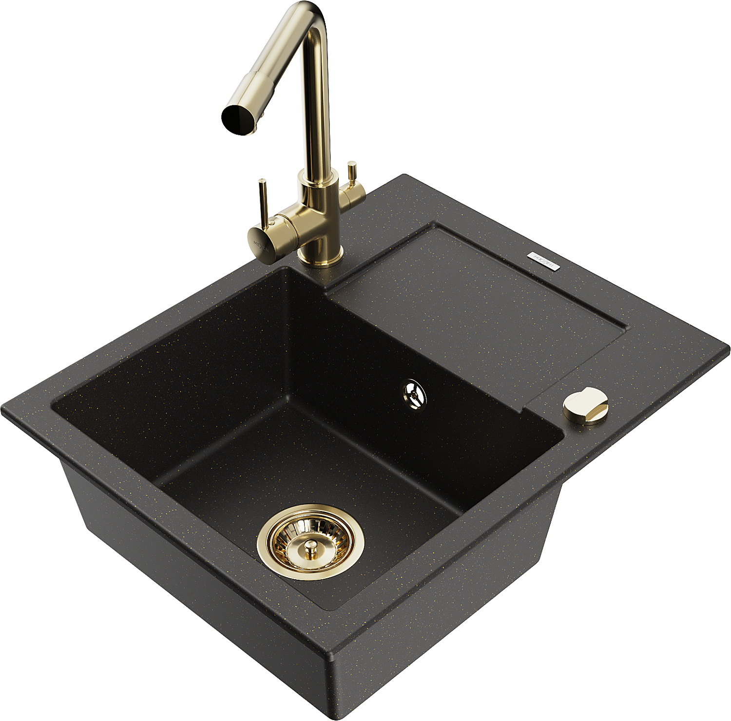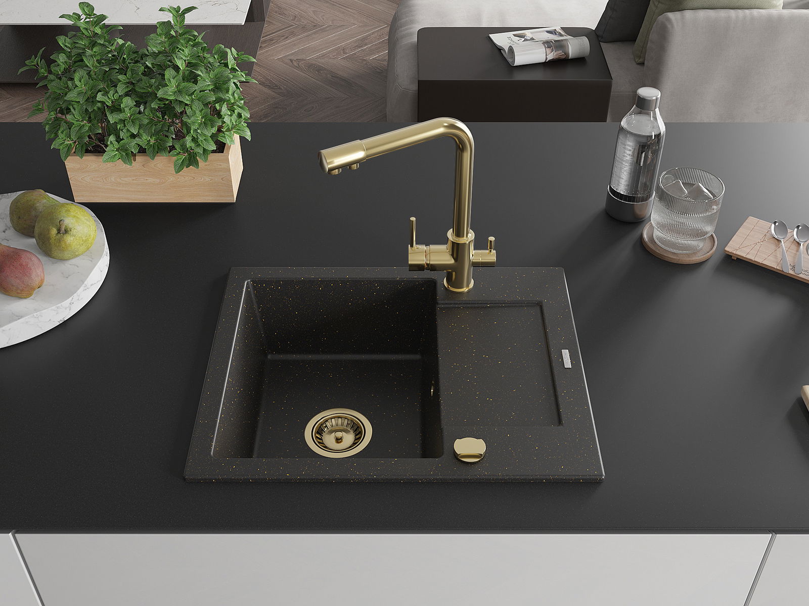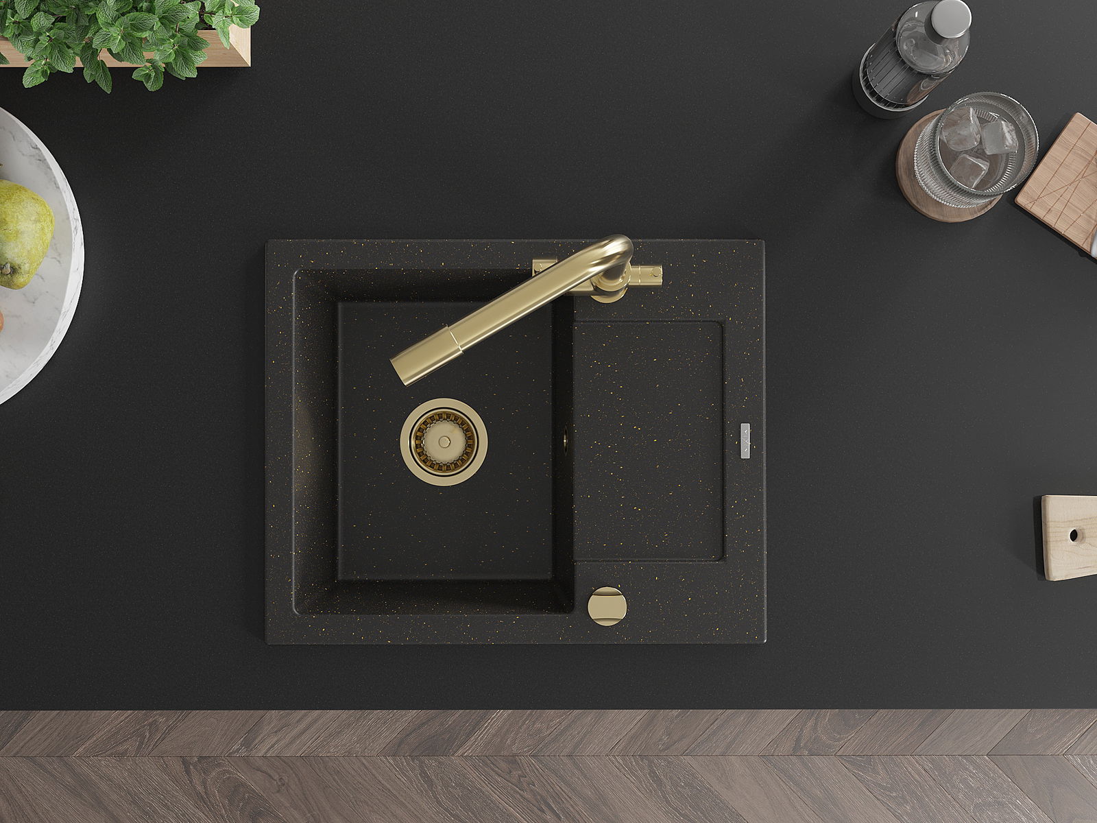 Mexen Enzo zlewozmywak granitowy 1-komorowy z ociekaczem i baterią kuchenną Duero, czarny/złoty metalik - 6506-75-671600-50