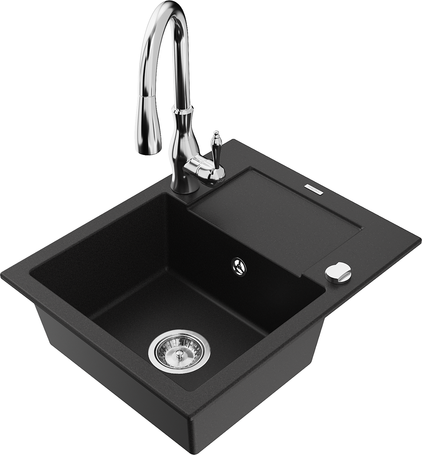Mexen Enzo zlewozmywak granitowy 1-komorowy z ociekaczem i baterią kuchenną Savita, czarny - 6506-77-672601-00