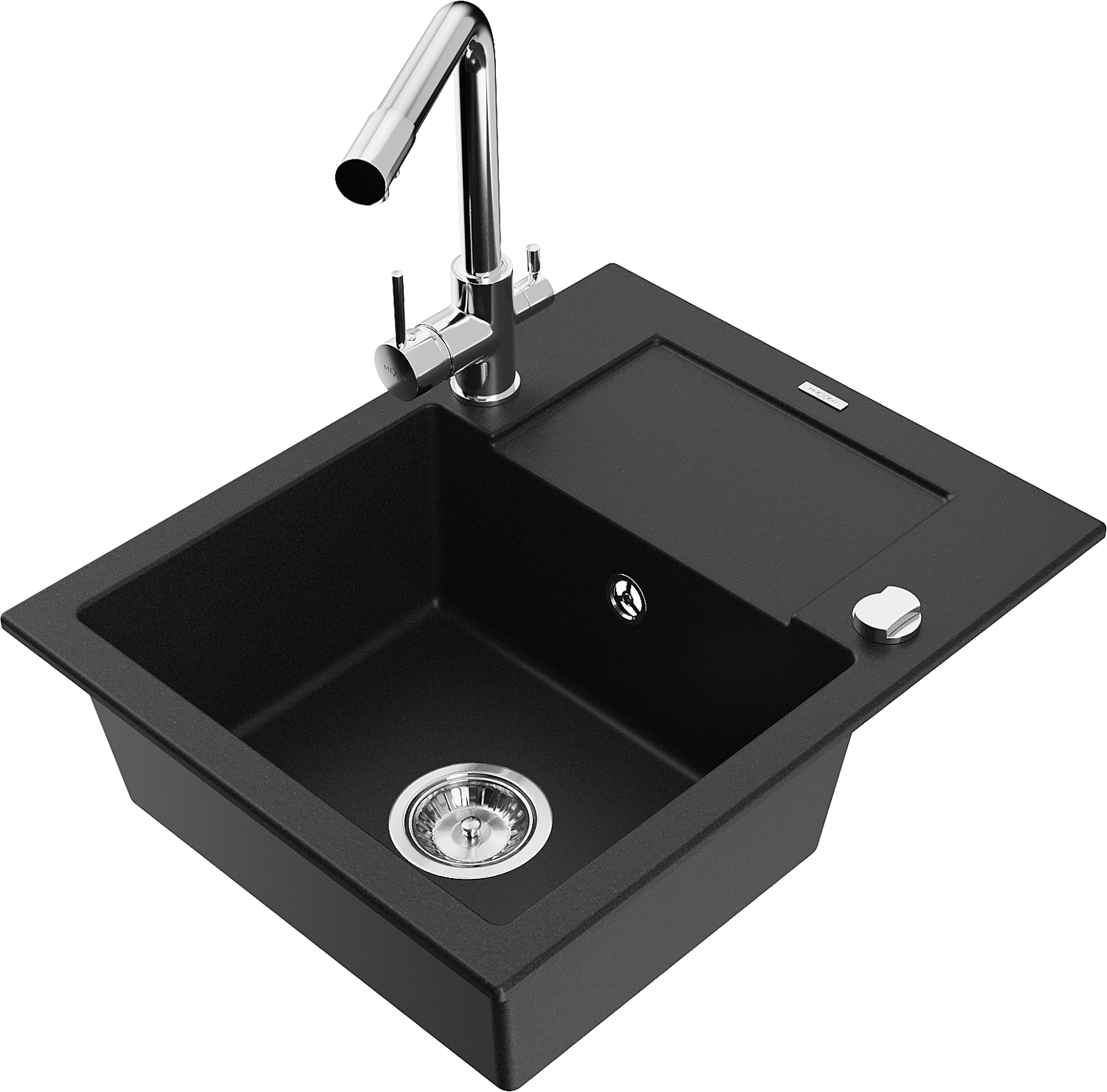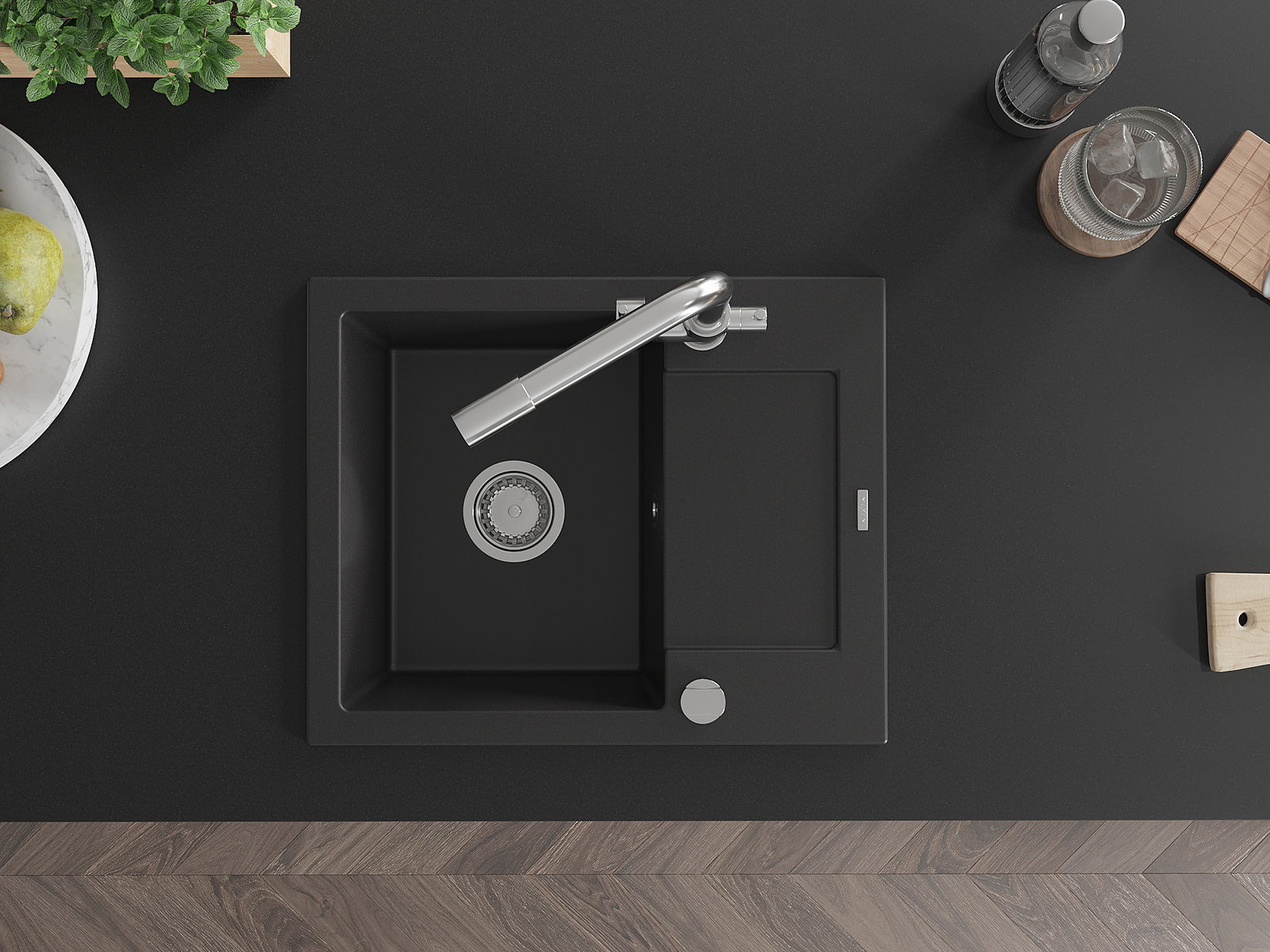 Mexen Enzo zlewozmywak granitowy 1-komorowy z ociekaczem i baterią kuchenną Duero, czarny - 6506-77-671600-00