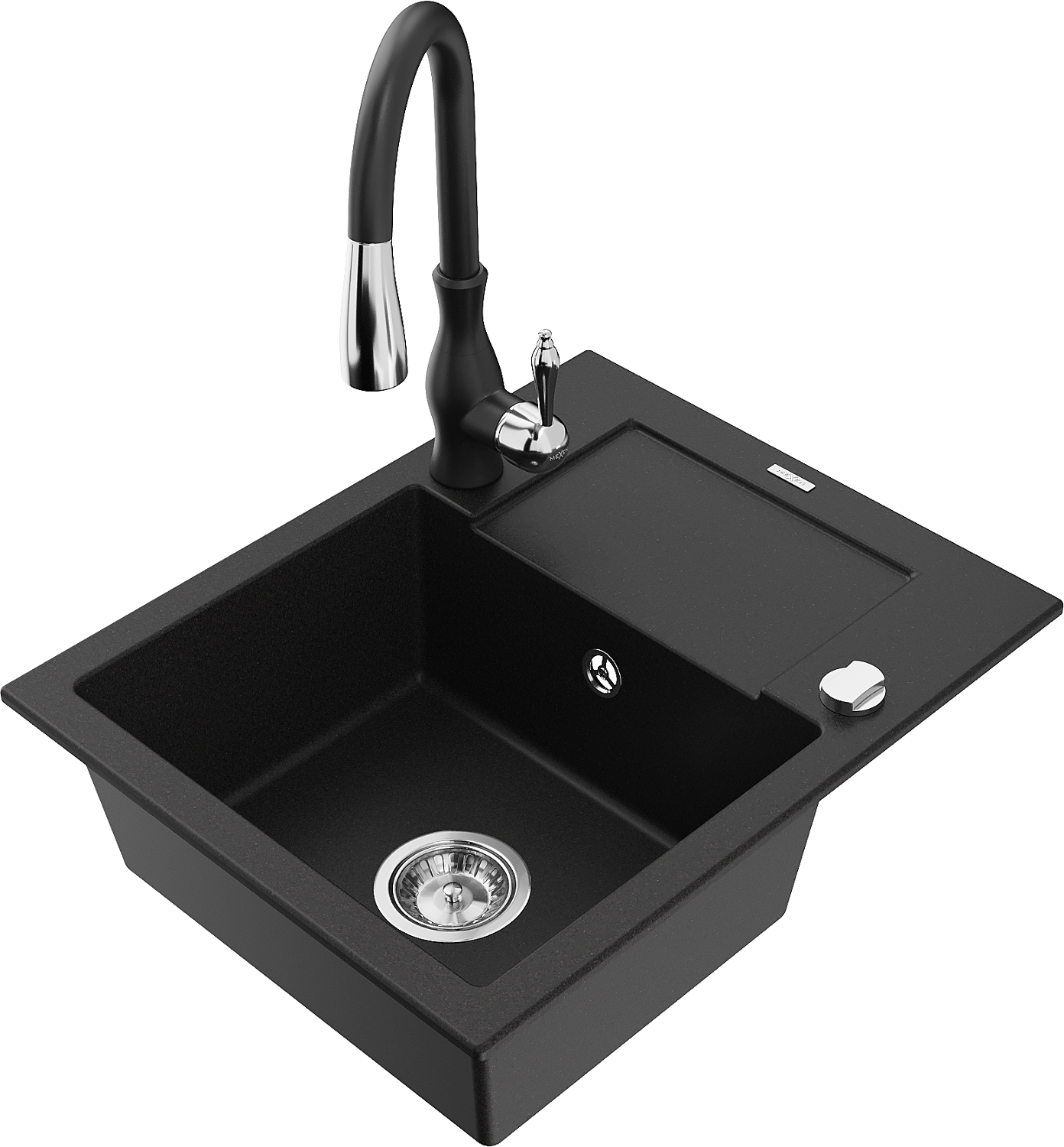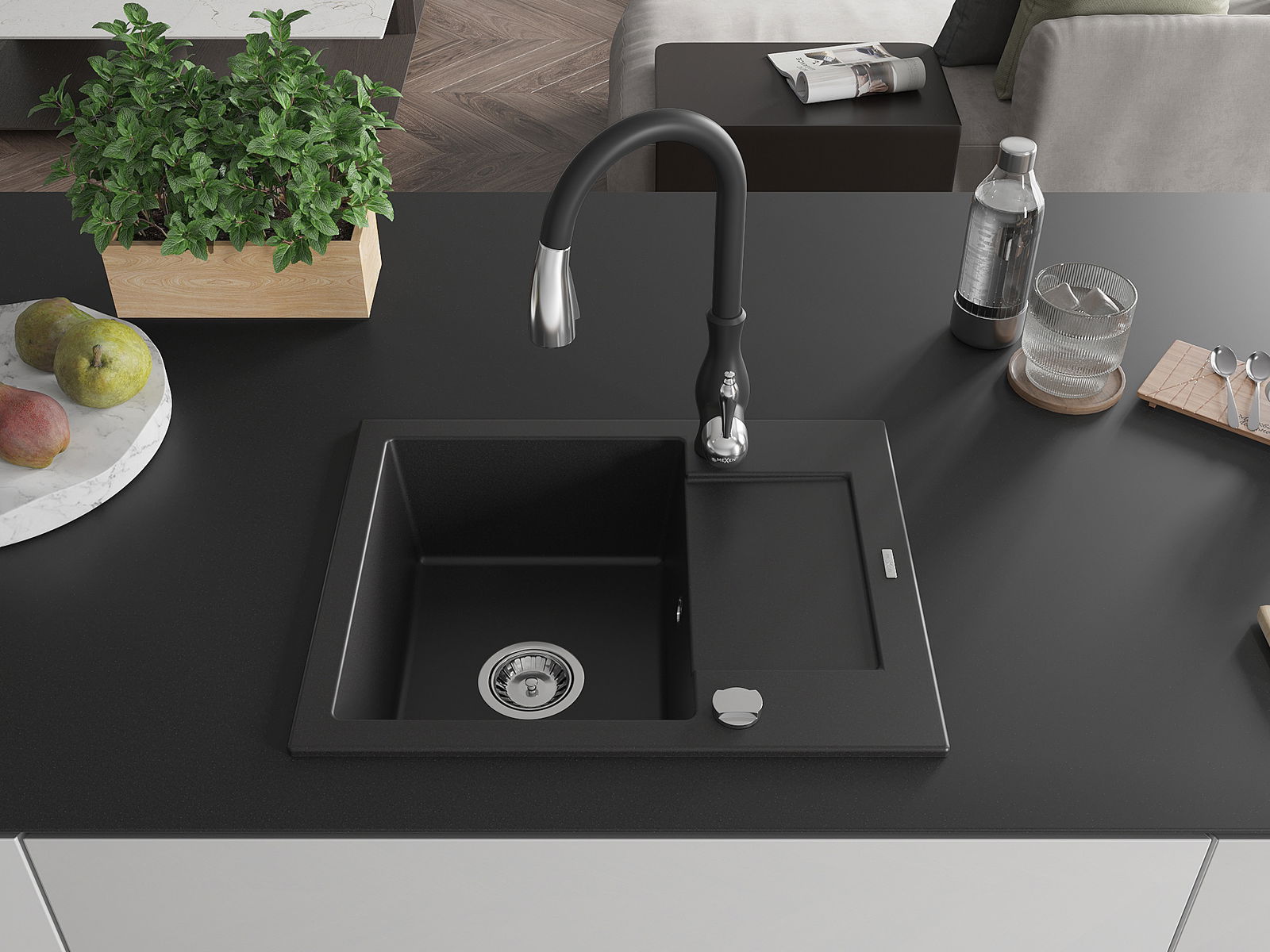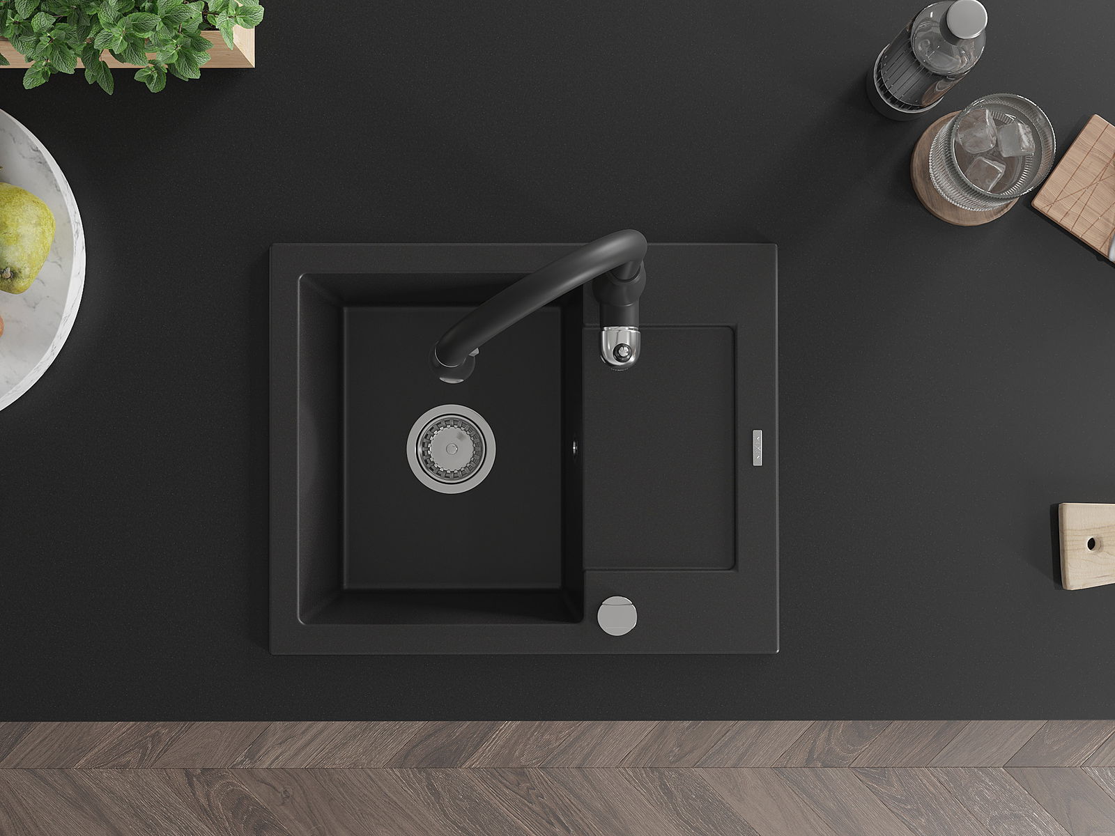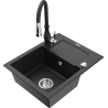 Mexen Enzo zlewozmywak granitowy 1-komorowy z ociekaczem i baterią kuchenną Savita, czarny - 6506-77-672601-70