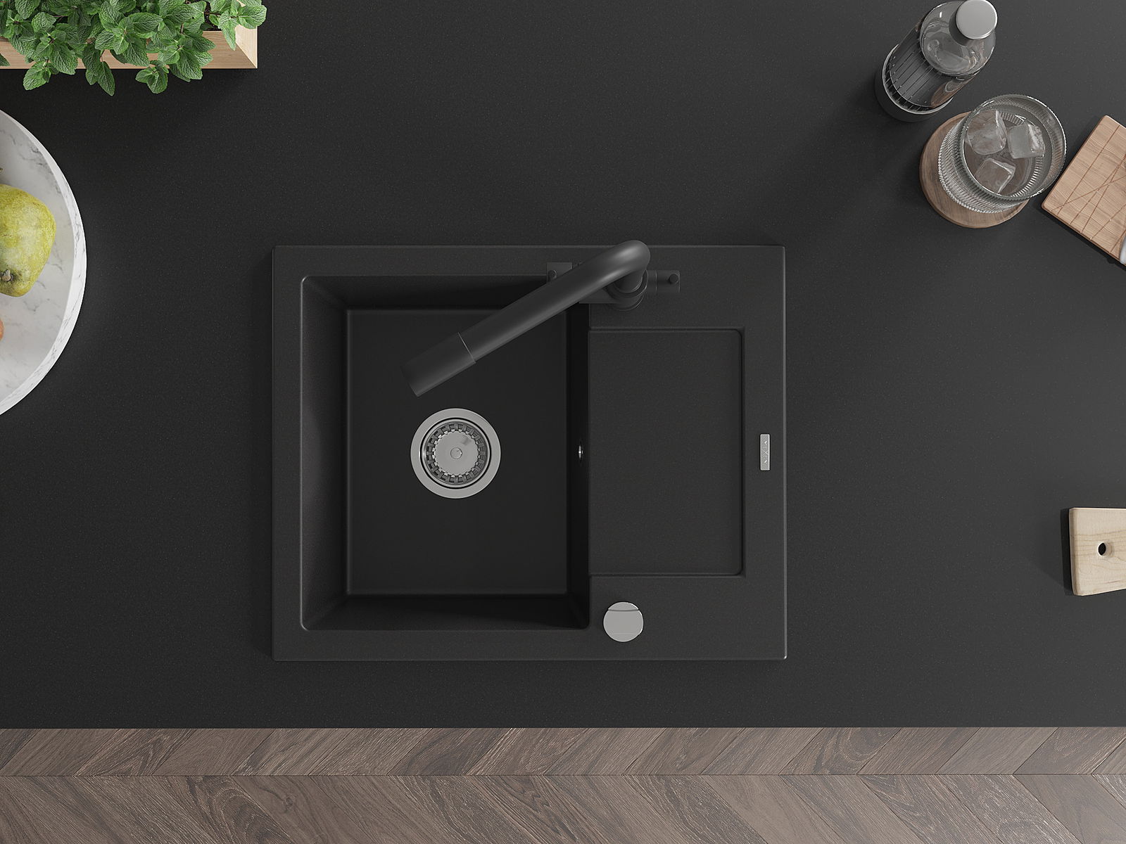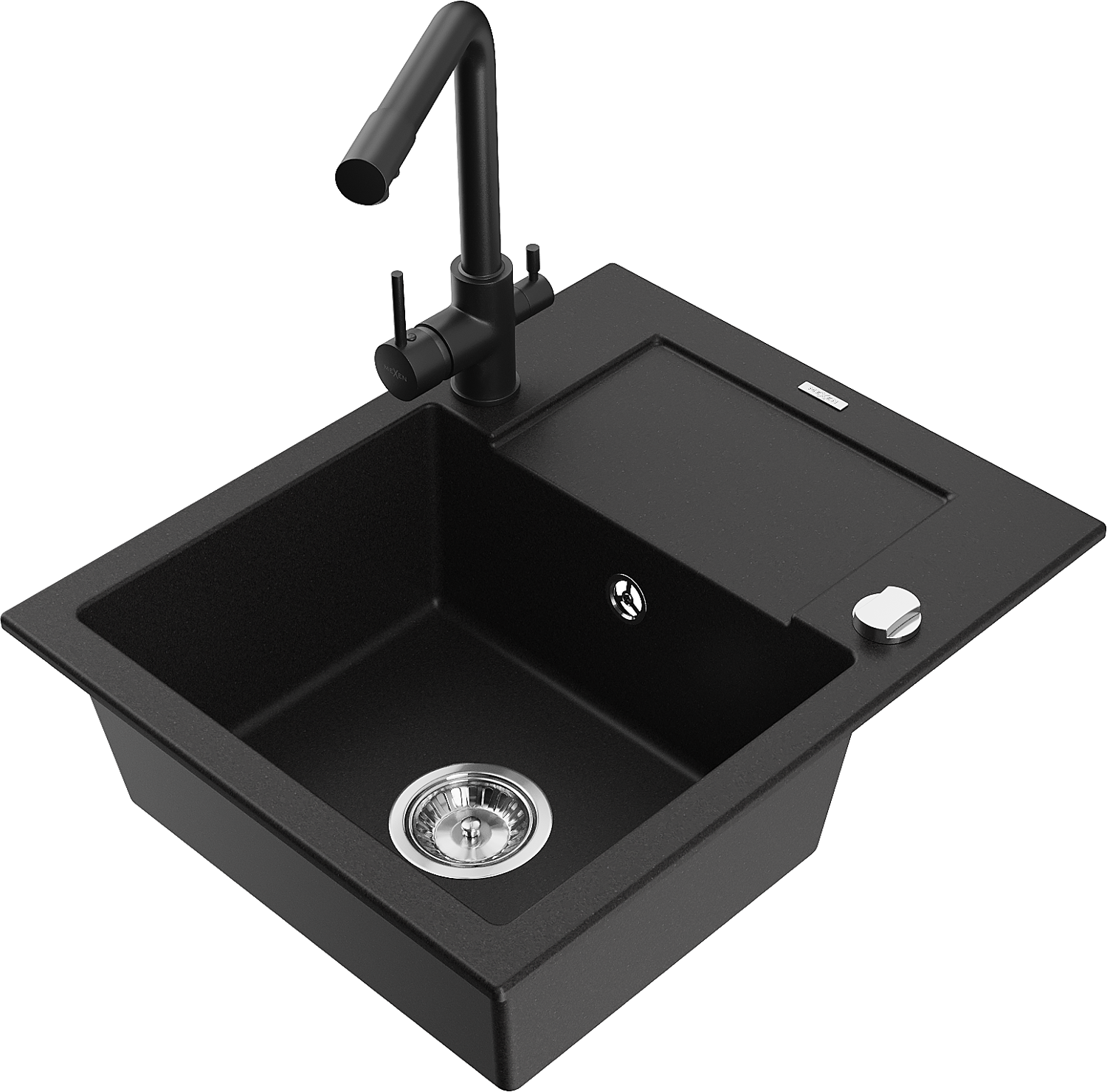 Mexen Enzo zlewozmywak granitowy 1-komorowy z ociekaczem i baterią kuchenną Duero, czarny - 6506-77-671600-70