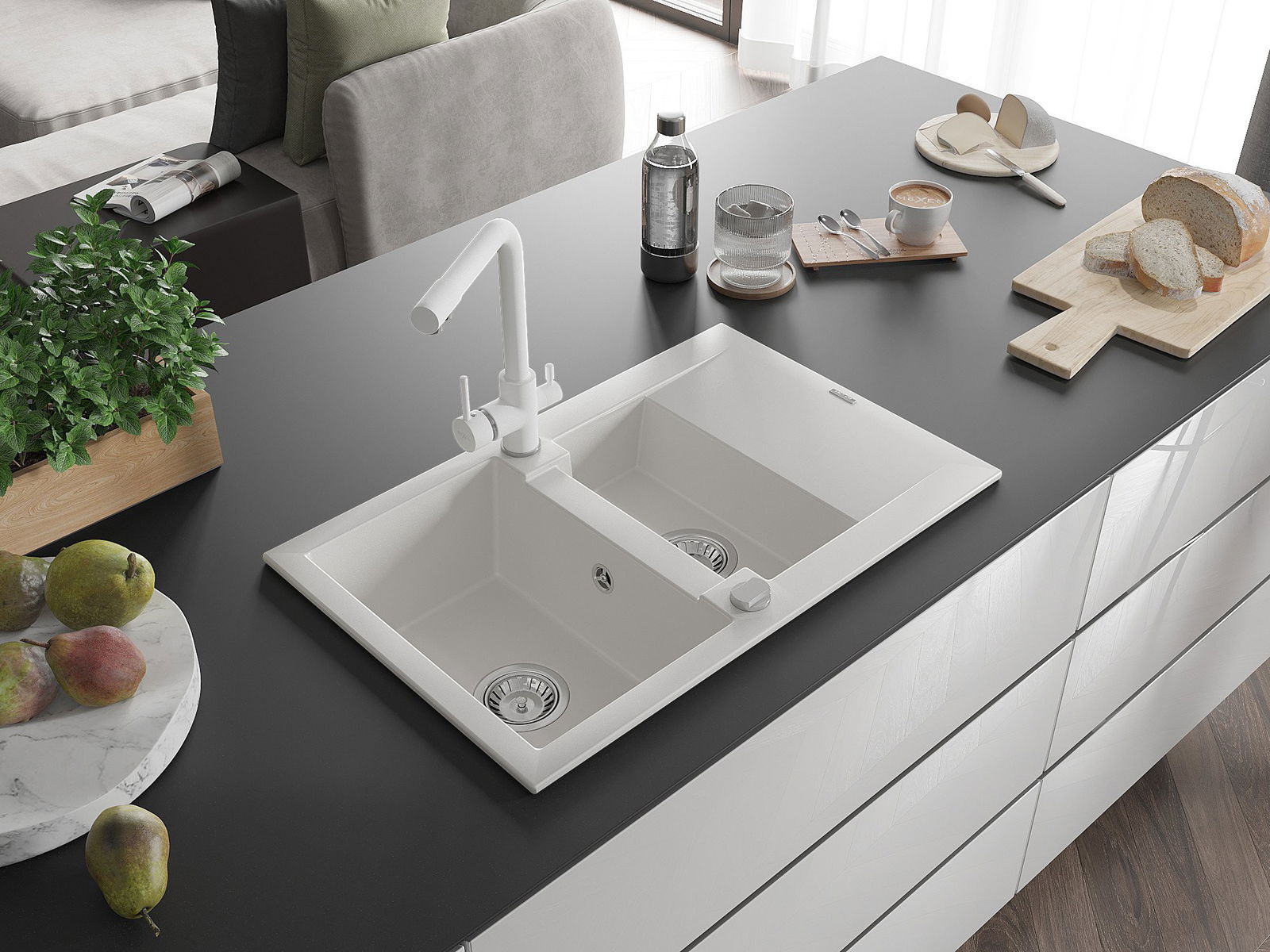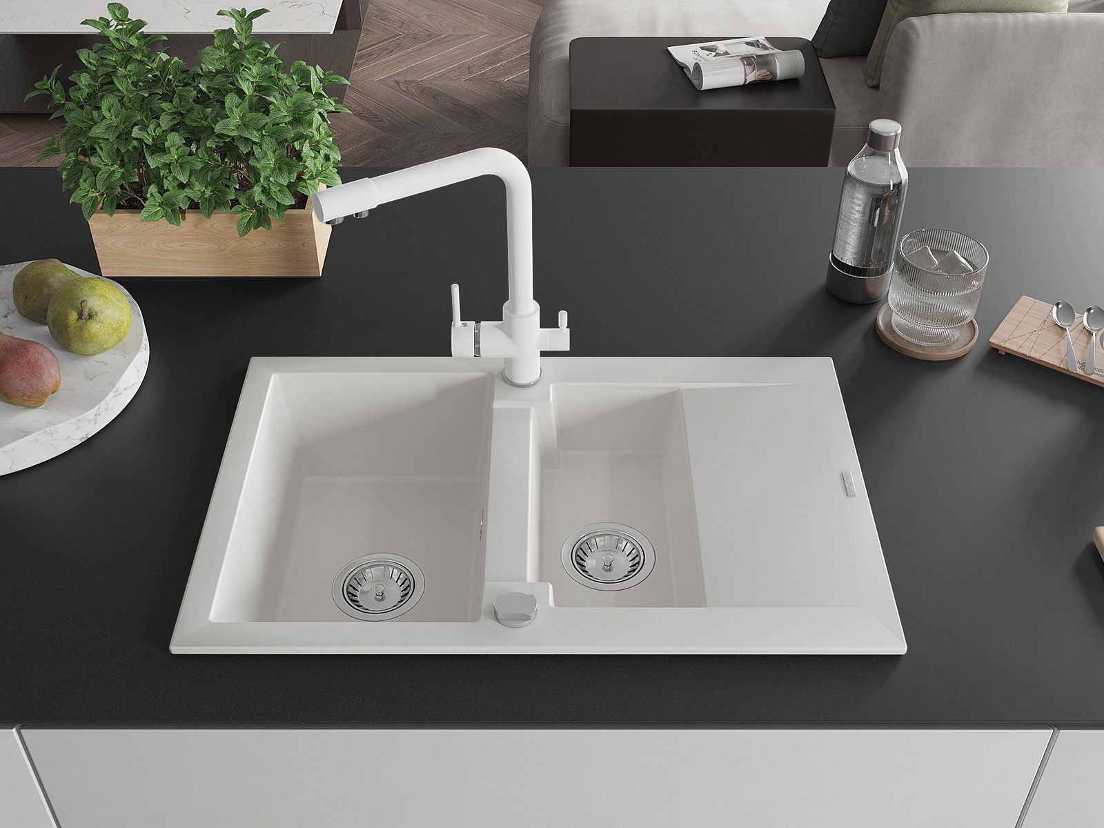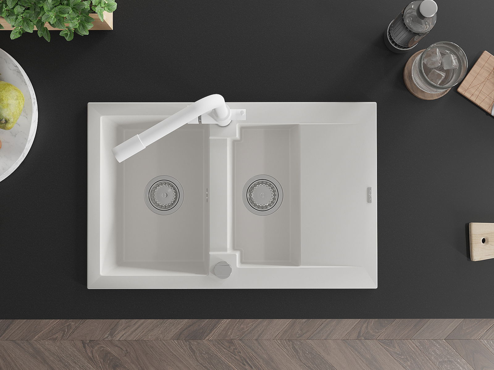Mexen Gaspar zlewozmywak granitowy 1,5-komorowy z ociekaczem i baterią kuchenną Duero, biały - 6507-20-671600-20