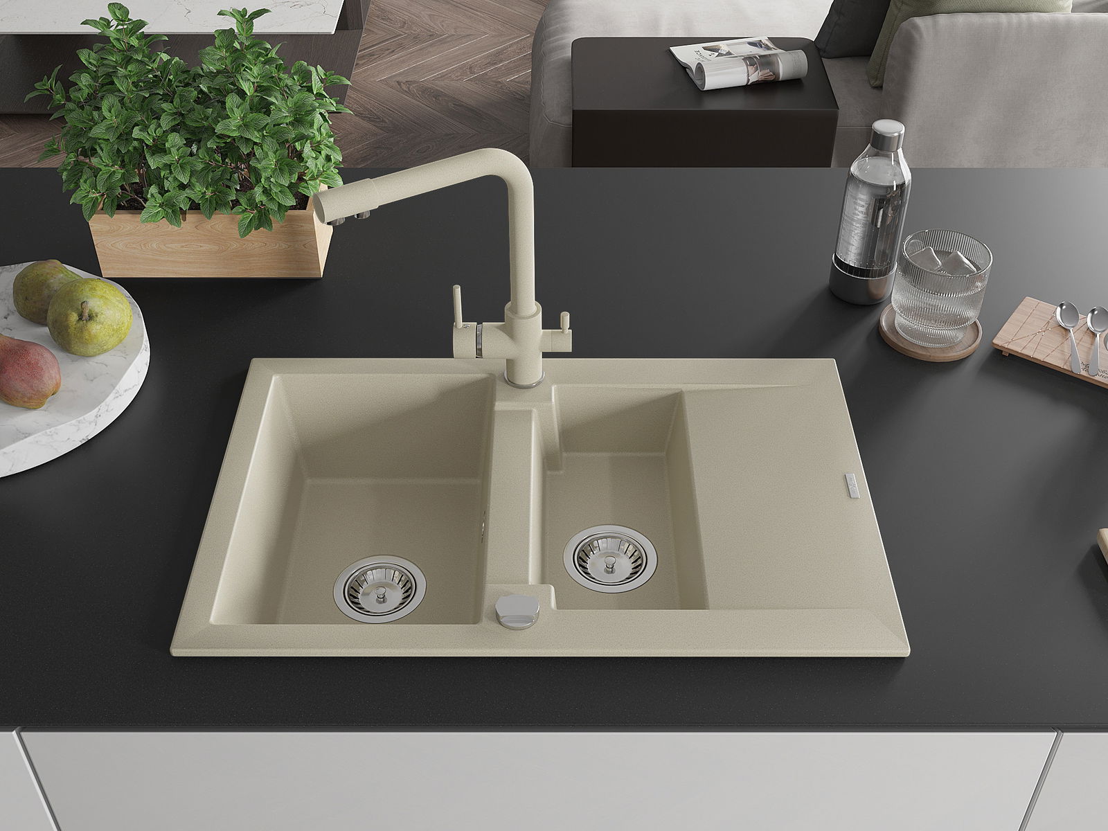 Mexen Gaspar zlewozmywak granitowy 1,5-komorowy z ociekaczem i baterią kuchenną Duero, beżowy - 6507-69-671600-69