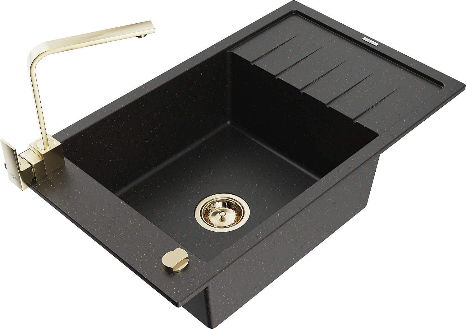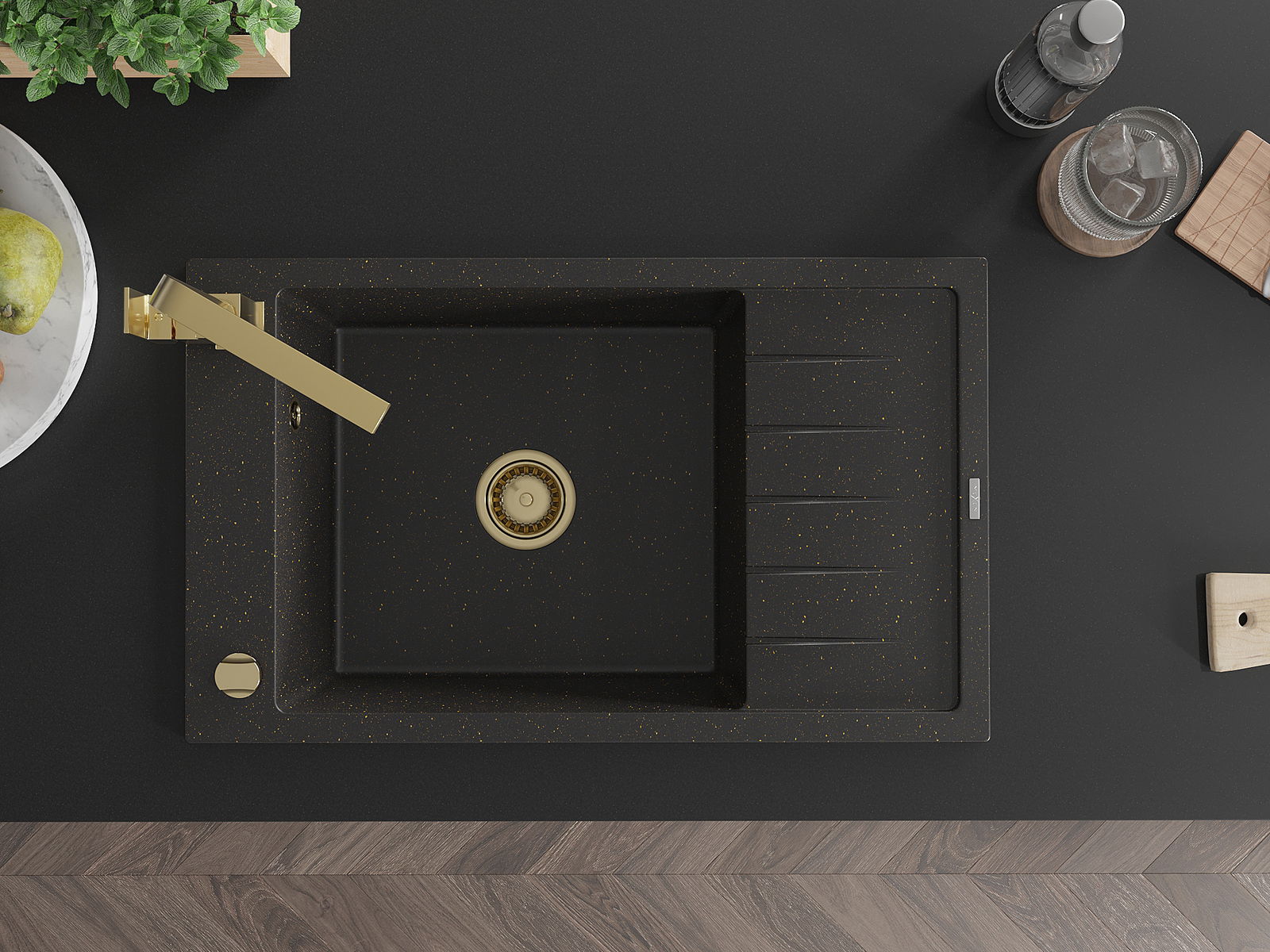 Mexen Elias zlewozmywak granitowy 1-komorowy z ociekaczem i baterią kuchenną Rita, czarny/złoty metalik - 6511-75-670300-50