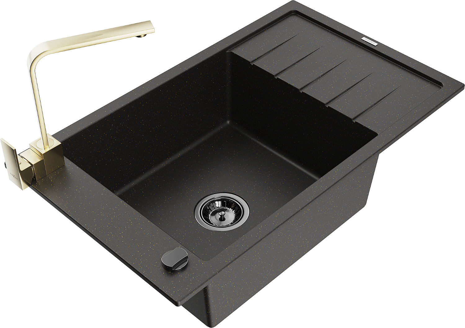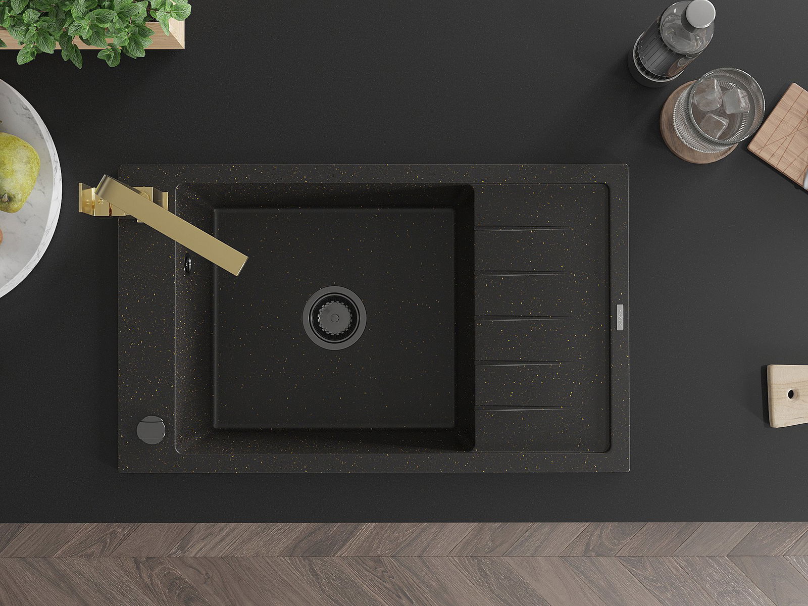 Mexen Elias zlewozmywak granitowy 1-komorowy z ociekaczem i baterią kuchenną Rita, czarny/złoty metalik - 6511-75-670300-50-B