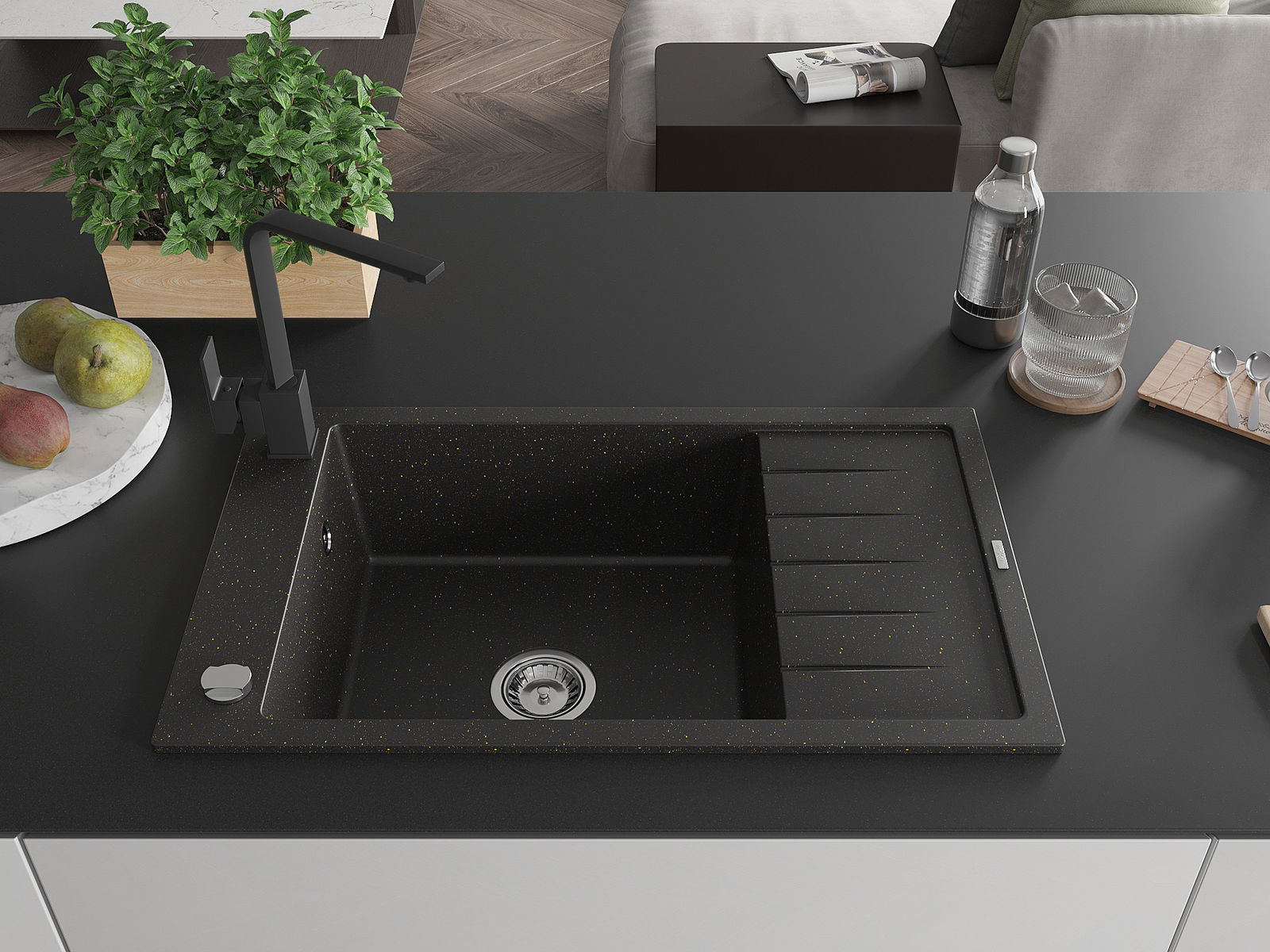 Mexen Elias zlewozmywak granitowy 1-komorowy z ociekaczem i baterią kuchenną Rita, czarny/złoty metalik - 6511-75-670300-70