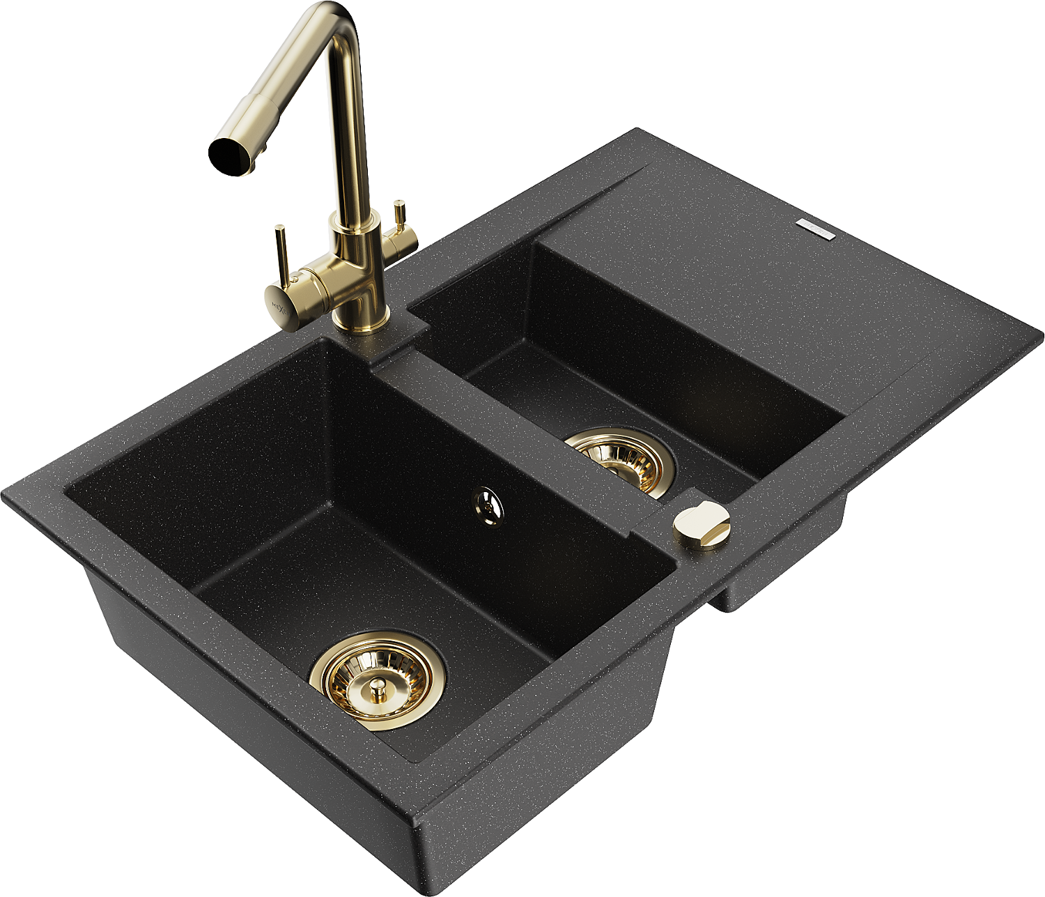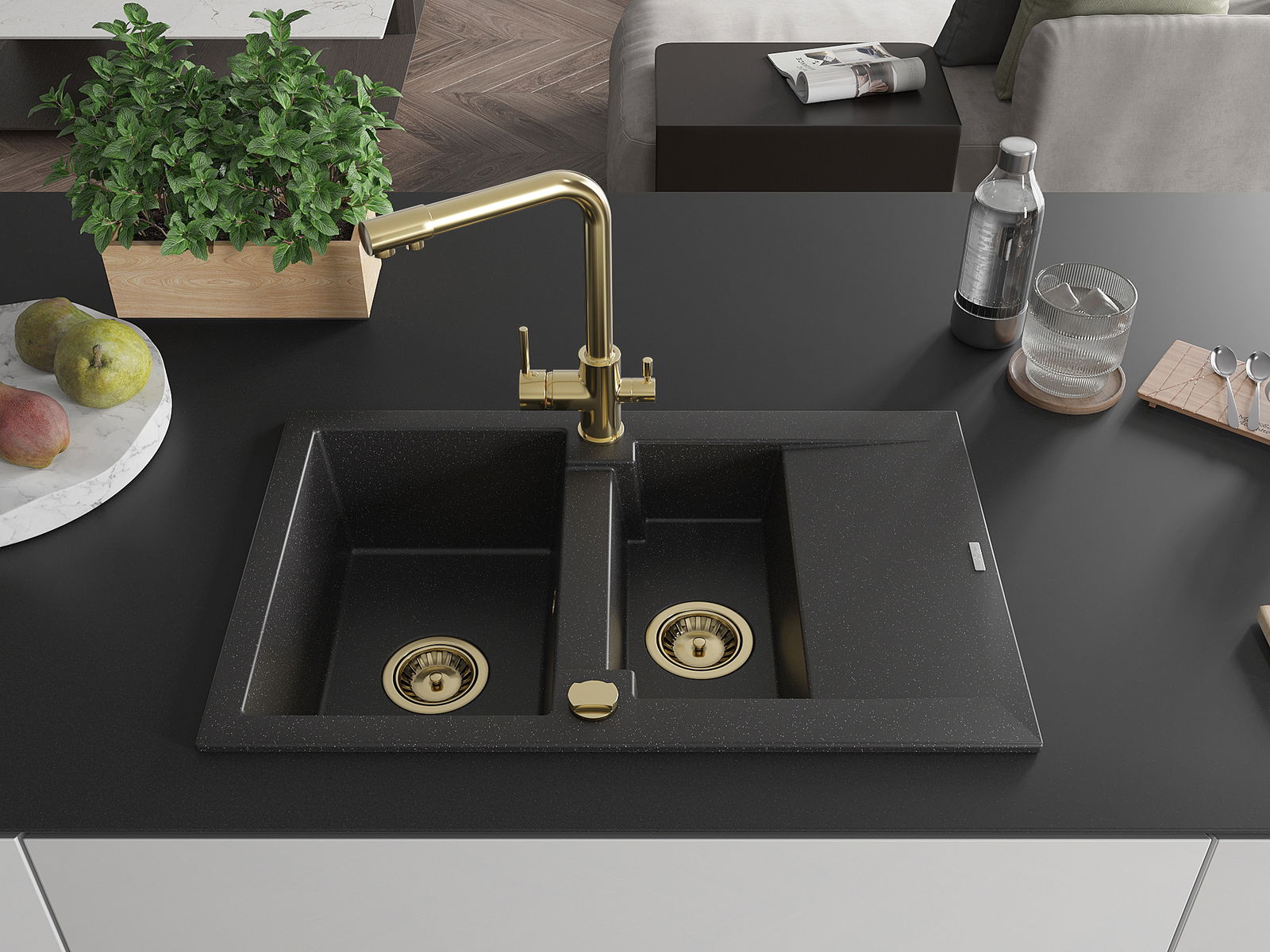 Mexen Gaspar zlewozmywak granitowy 1,5-komorowy z ociekaczem i baterią kuchenną Duero, czarny/srebrny - 6507-73-671600-50