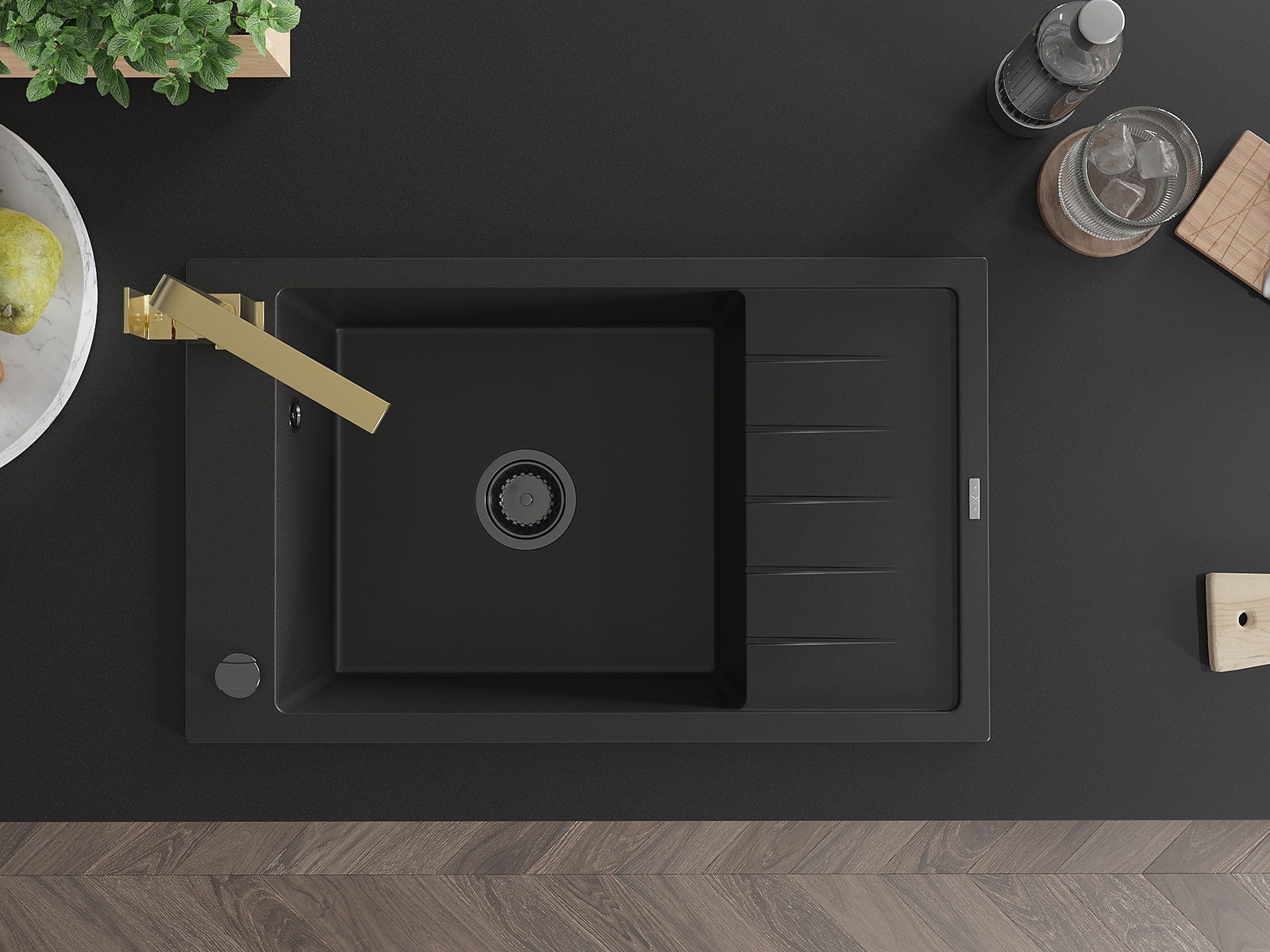 Mexen Elias zlewozmywak granitowy 1-komorowy z ociekaczem i baterią kuchenną Rita, czarny - 6511-77-670300-50-B