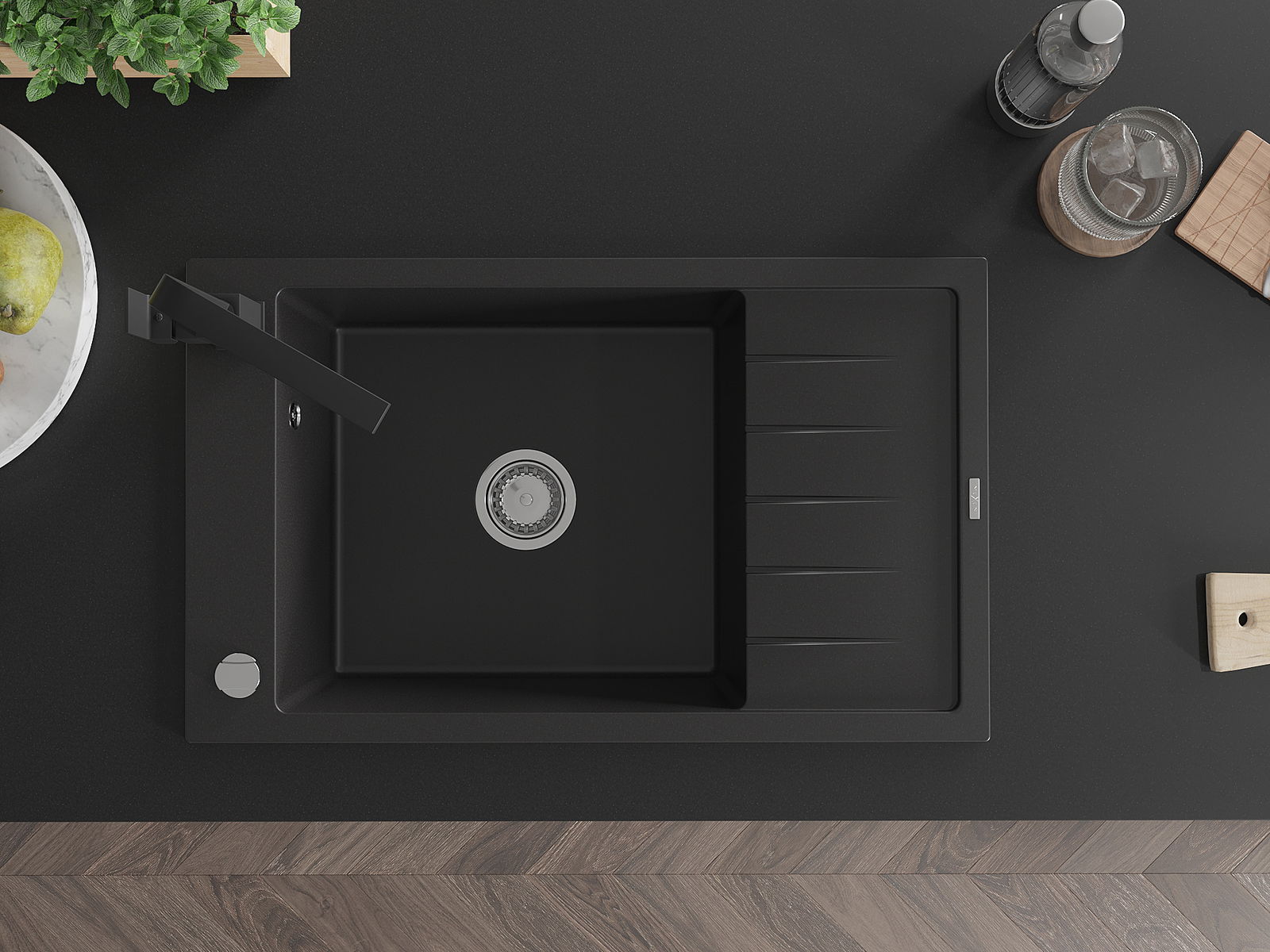 Mexen Elias zlewozmywak granitowy 1-komorowy z ociekaczem i baterią kuchenną Rita, czarny - 6511-77-670300-70