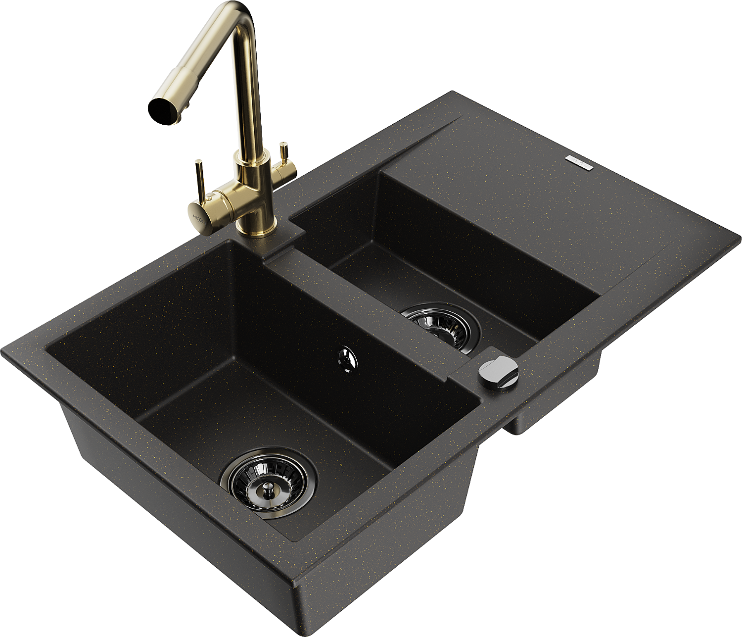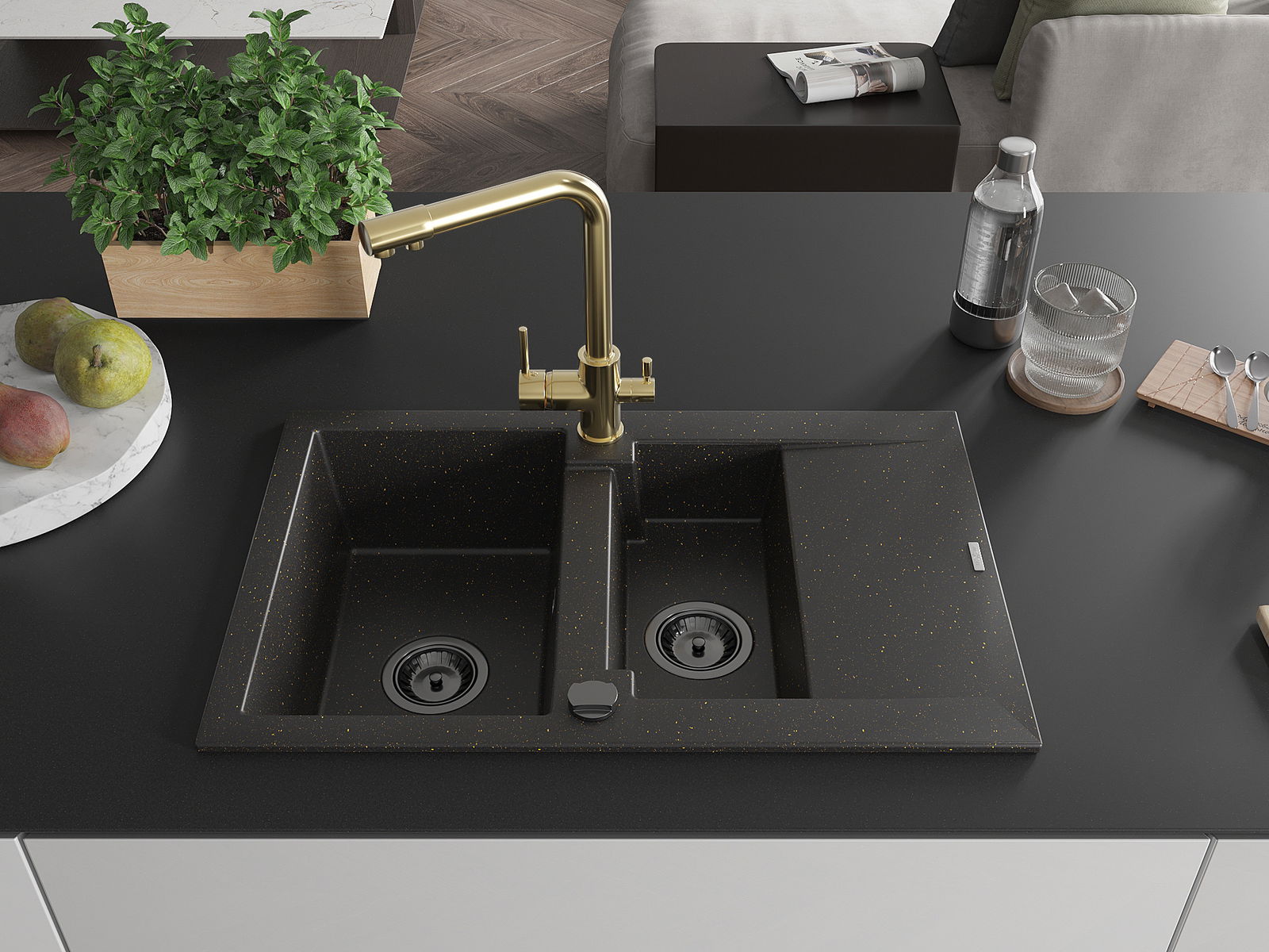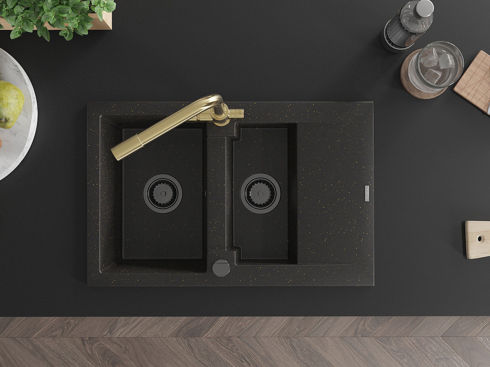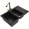 Mexen Gaspar zlewozmywak granitowy 1,5-komorowy z ociekaczem i baterią kuchenną Duero, czarny/złoty - 6507-75-671600-50-B