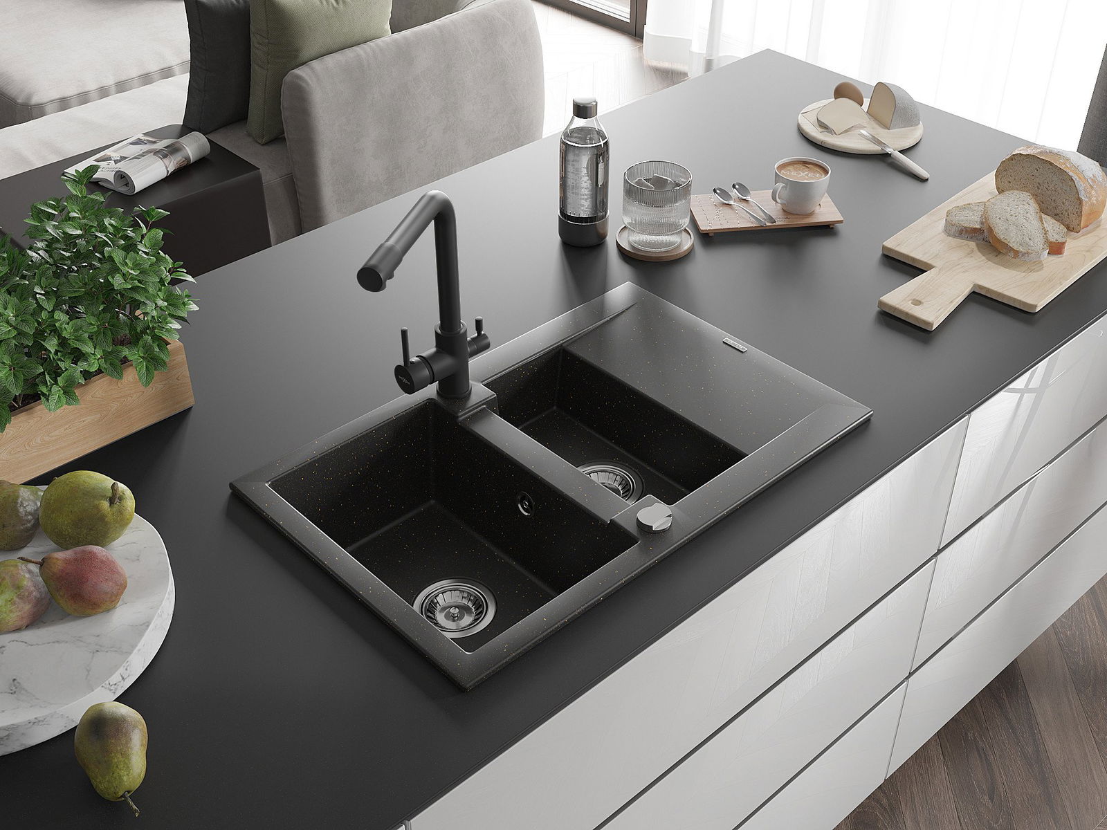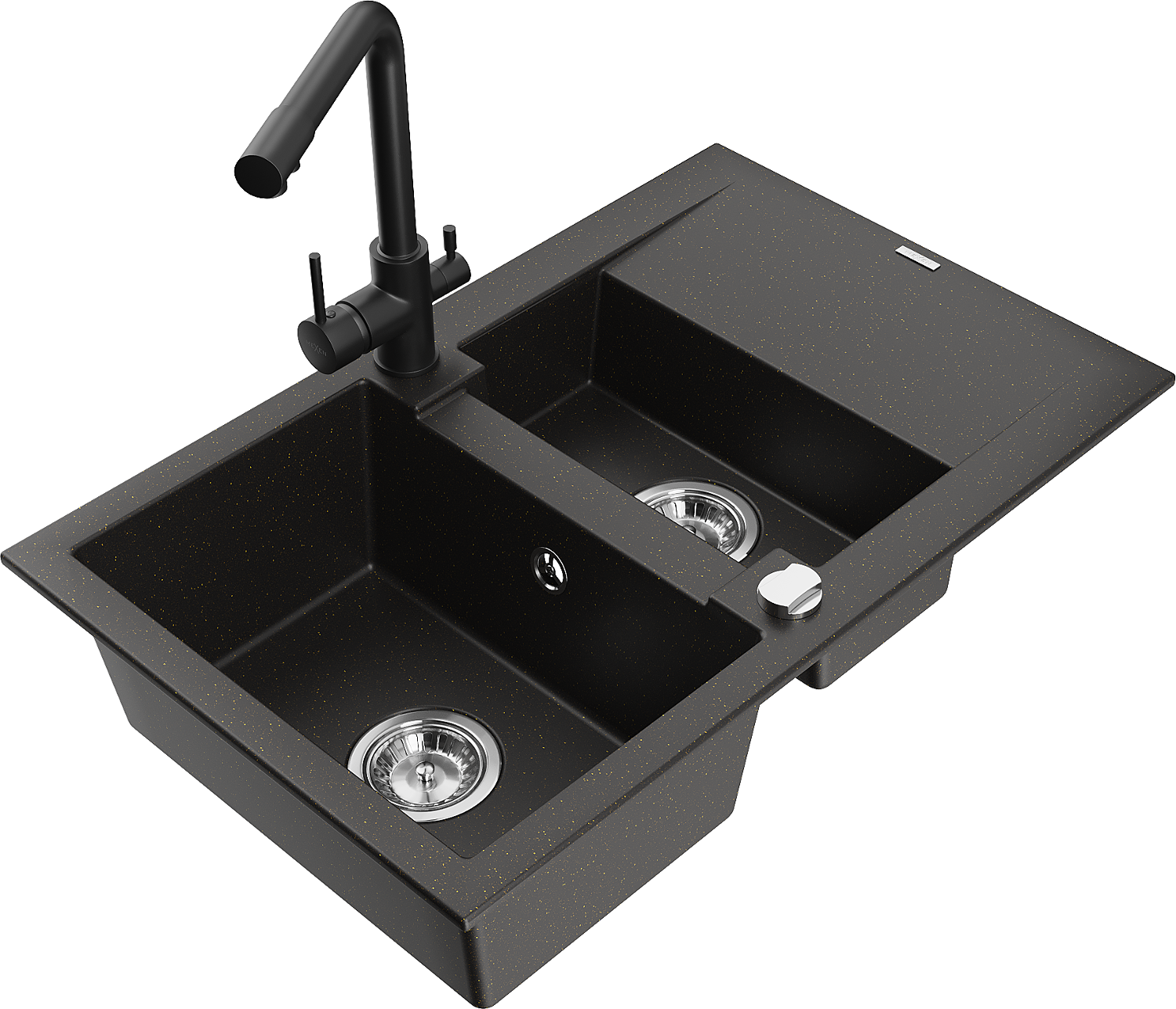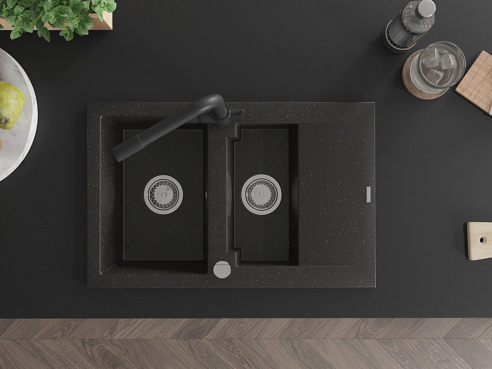 Mexen Gaspar zlewozmywak granitowy 1,5-komorowy z ociekaczem i baterią kuchenną Duero, czarny/złoty - 6507-75-671600-70