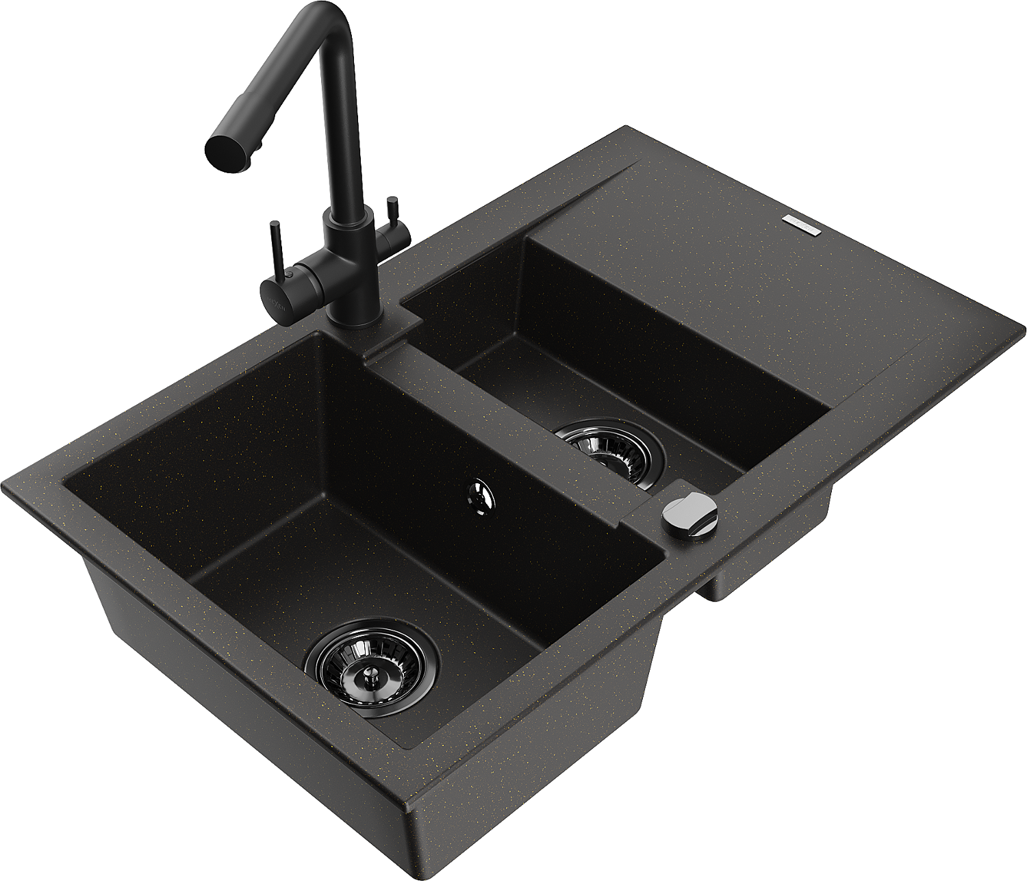 Mexen Gaspar zlewozmywak granitowy 1,5-komorowy z ociekaczem i baterią kuchenną Duero, czarny/złoty - 6507-75-671600-70-B