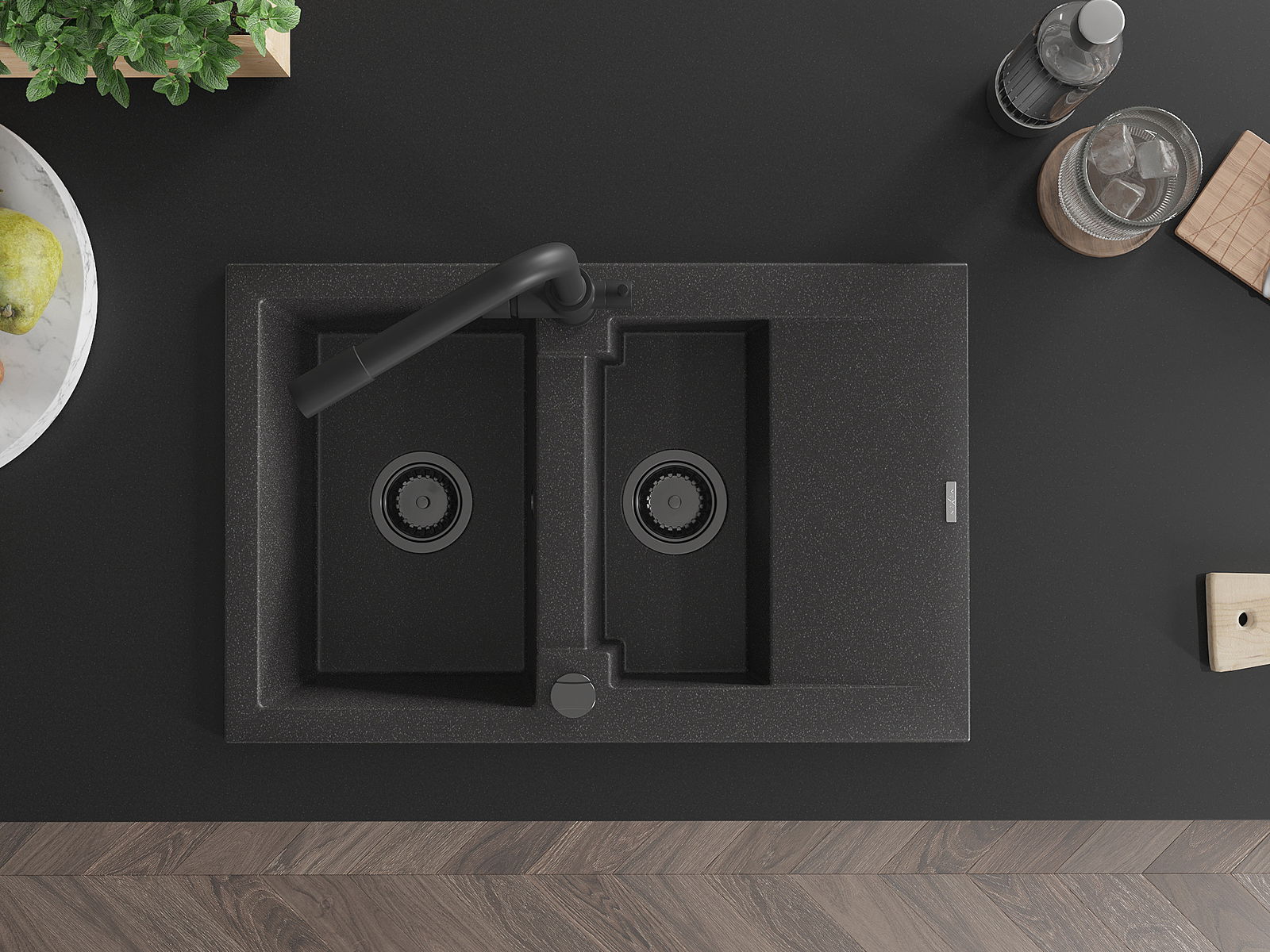 Mexen Gaspar zlewozmywak granitowy 1,5-komorowy z ociekaczem i baterią kuchenną Duero, czarny nakrapiany - 6507-76-671600-70-B