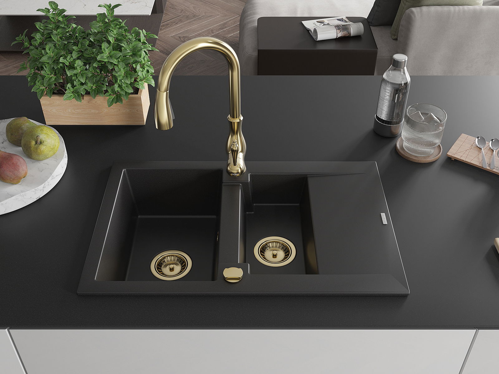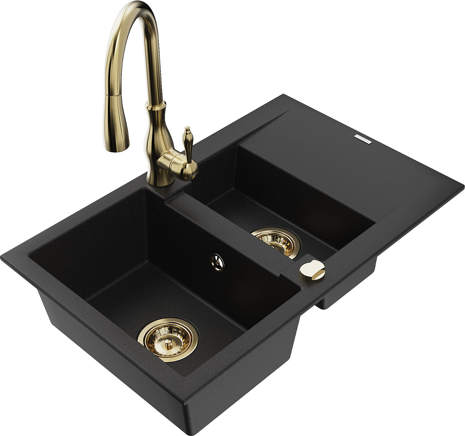 Mexen Gaspar zlewozmywak granitowy 1,5-komorowy z ociekaczem i baterią kuchenną Savita, czarny - 6507-77-672601-50