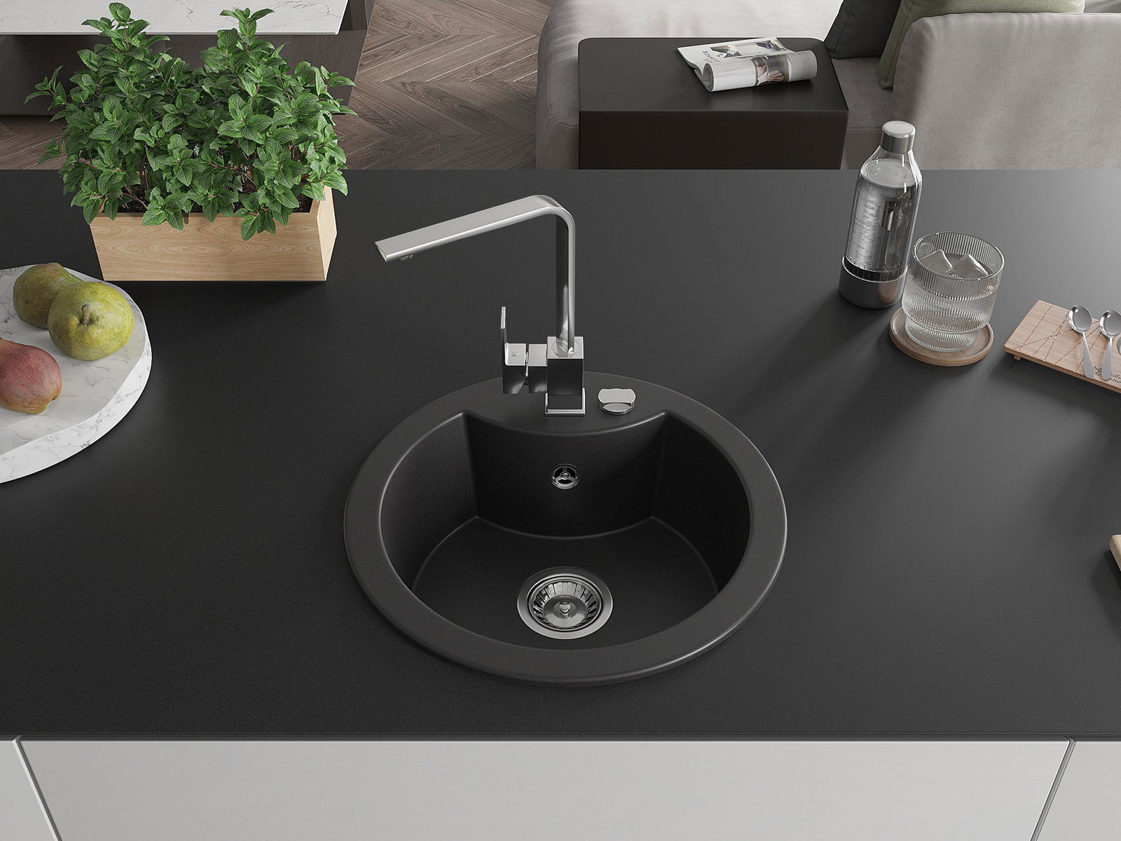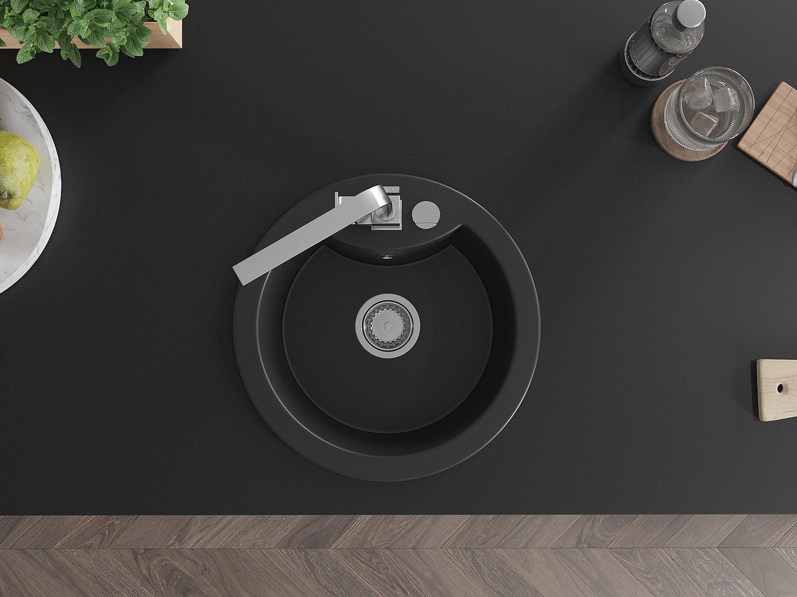 Zlew posiada podfrezowany otwór o średnicy 35 mm do samodzielnego wybicia. Można go wykorzystać m.in. do montażu dozownika na płyn, który wyeliminuje obecność plastikowych butelek w kuchni i nada jej eleganckiego wykończenia.