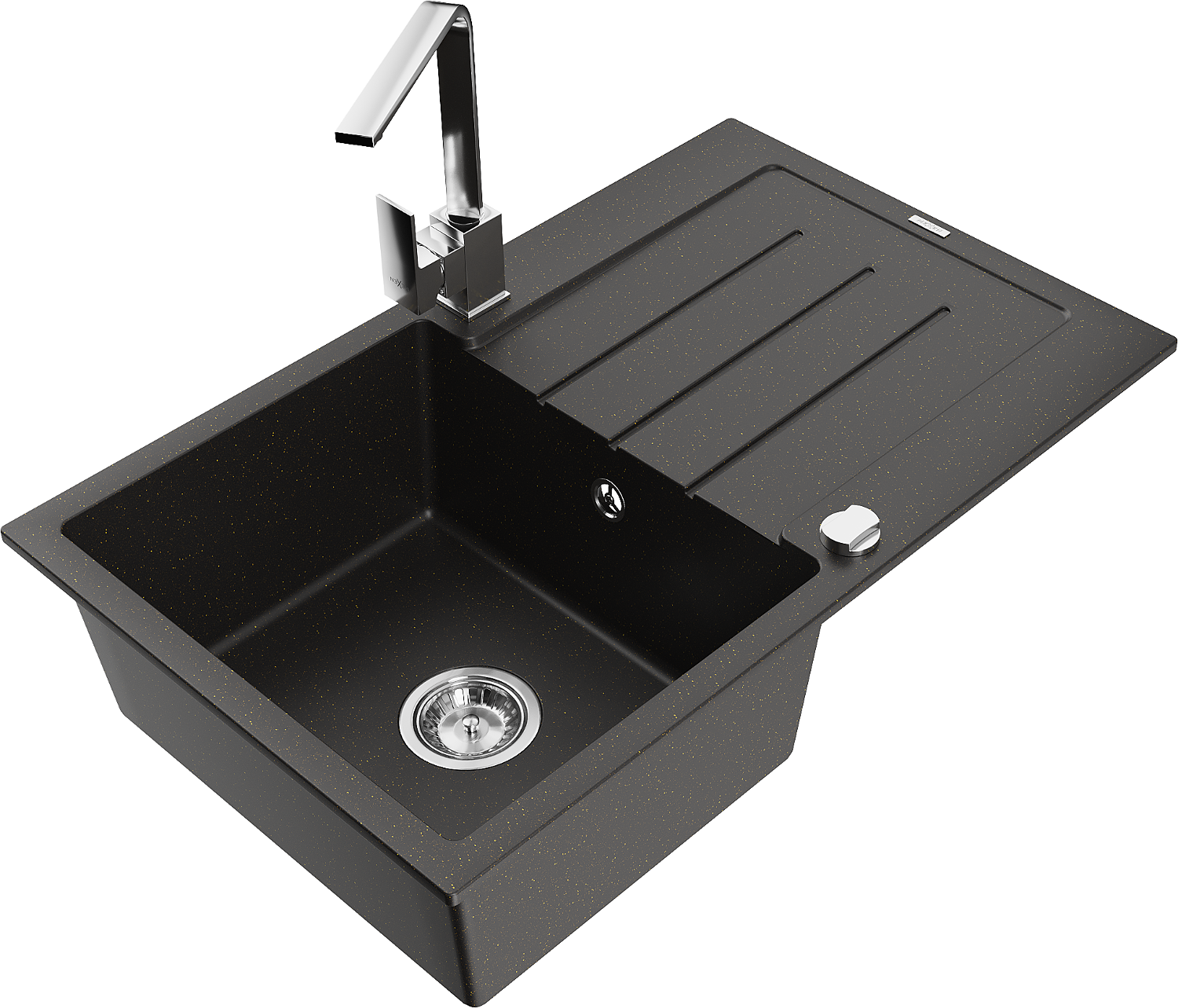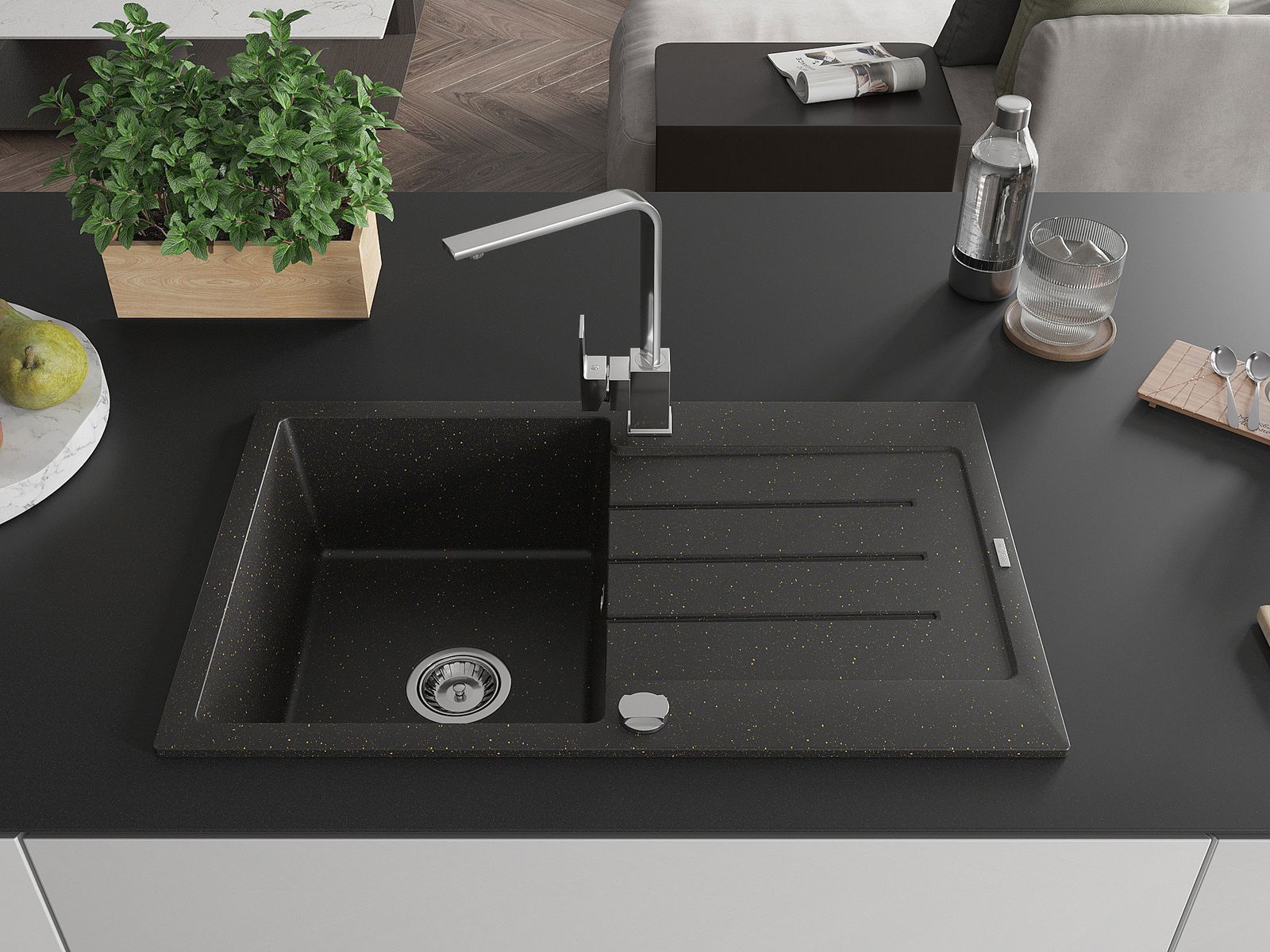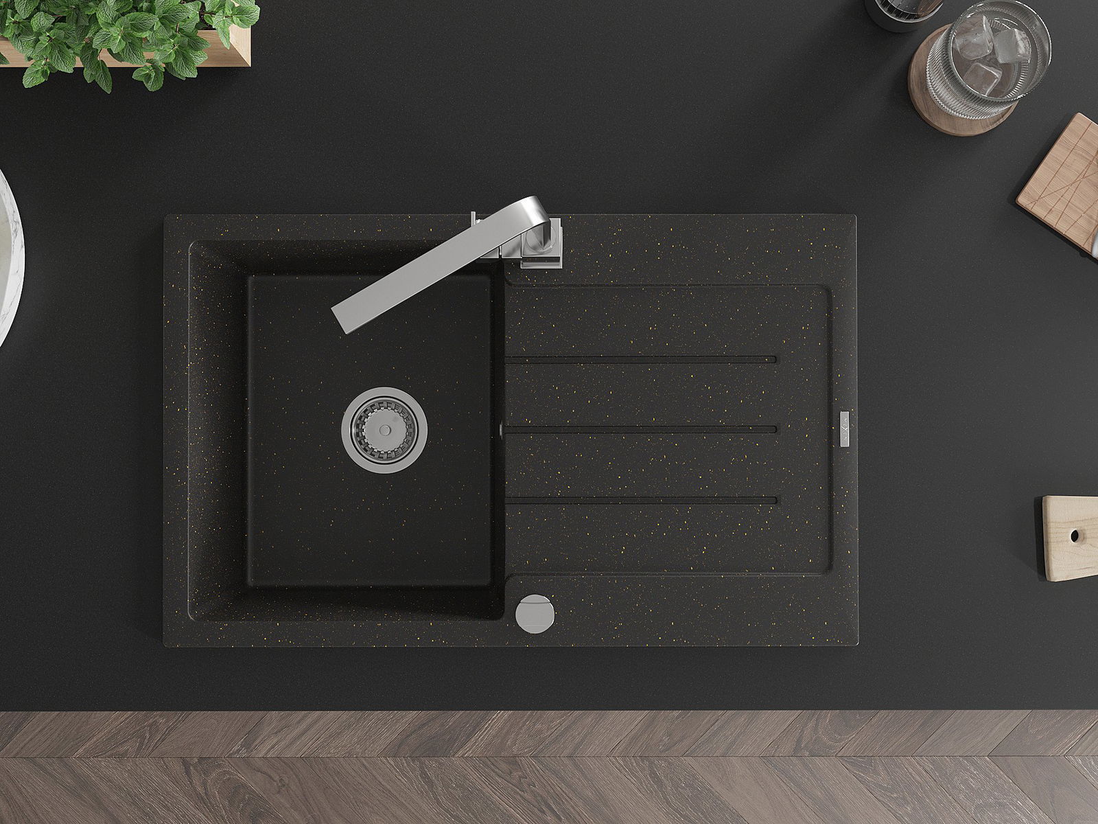 Mexen Bruno zlewozmywak granitowy 1-komorowy z ociekaczem i baterią kuchenną Rita, czarny/złoty metalik - 6513-75-670300-00