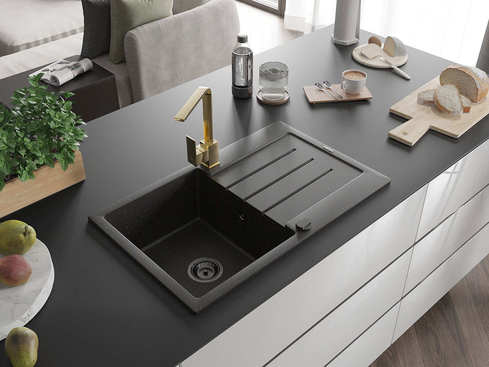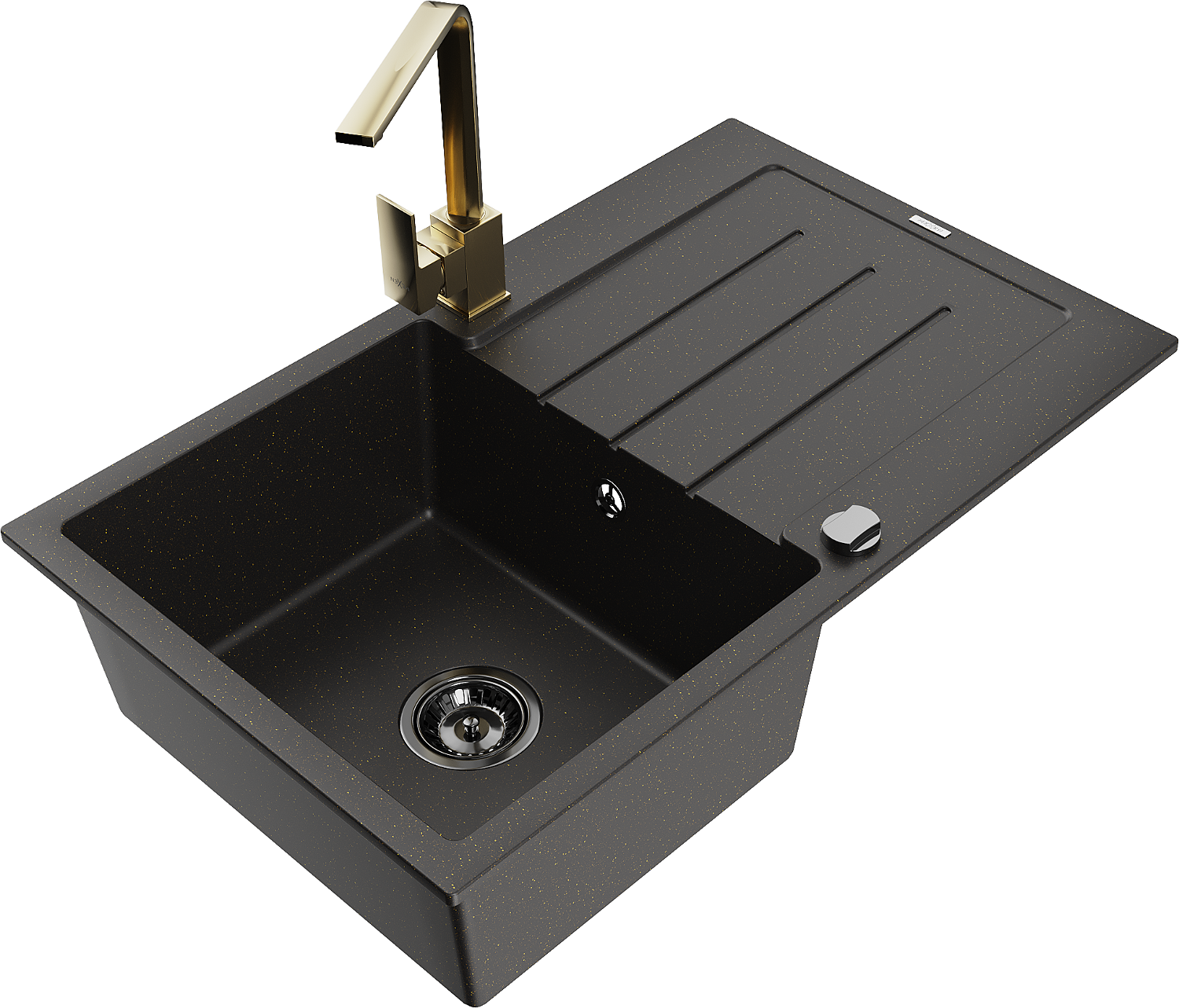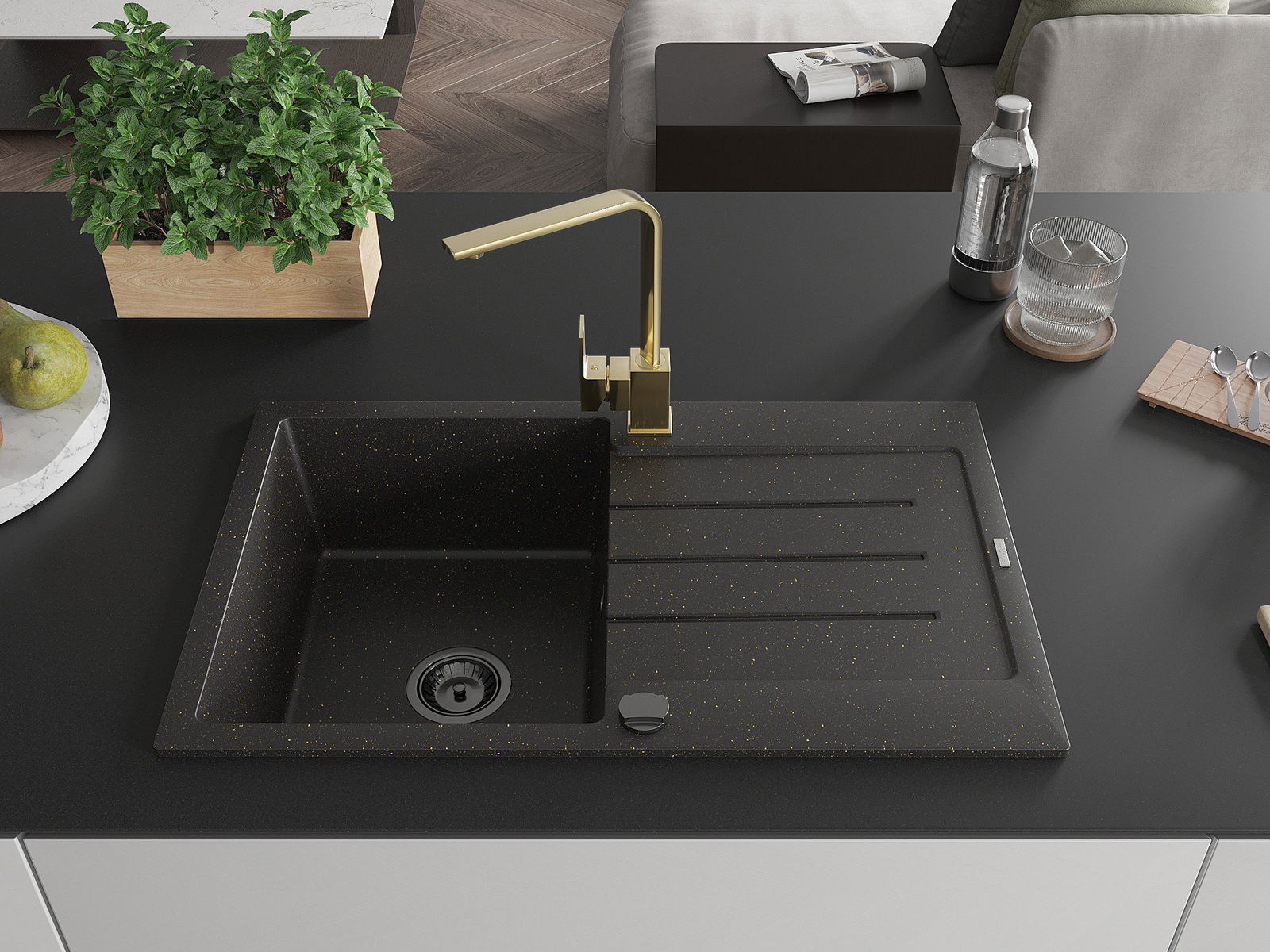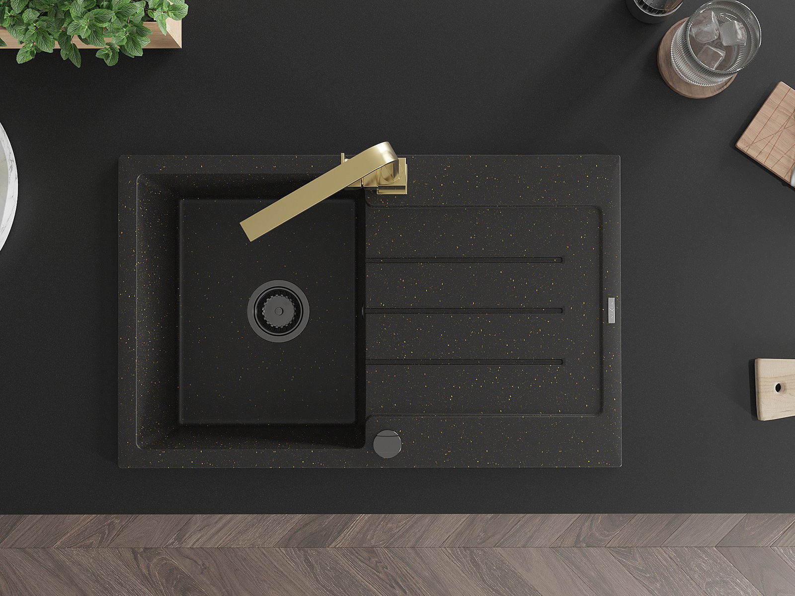 Mexen Bruno zlewozmywak granitowy 1-komorowy z ociekaczem i baterią kuchenną Rita, czarny/złoty metalik - 6513-75-670300-50-B