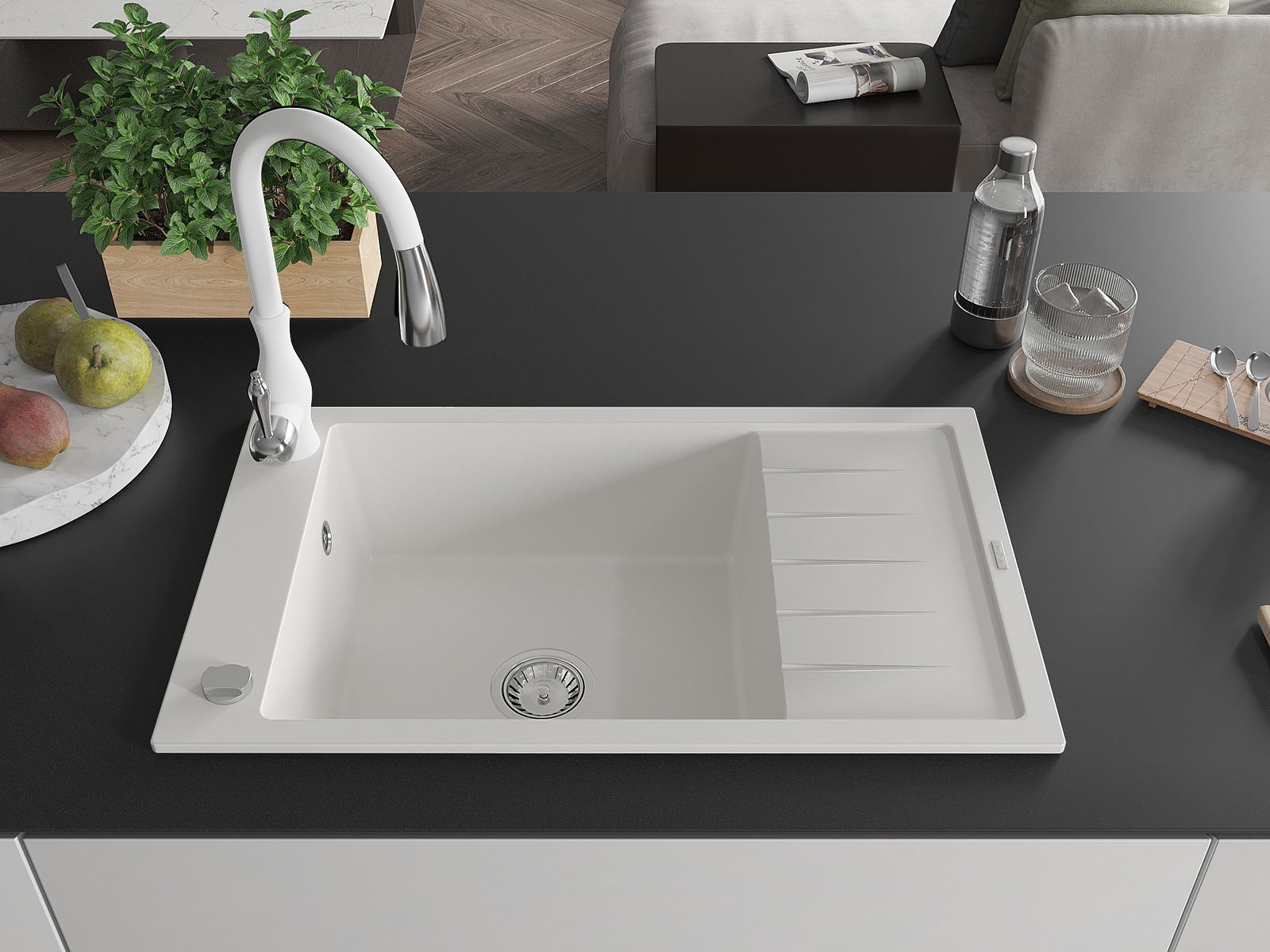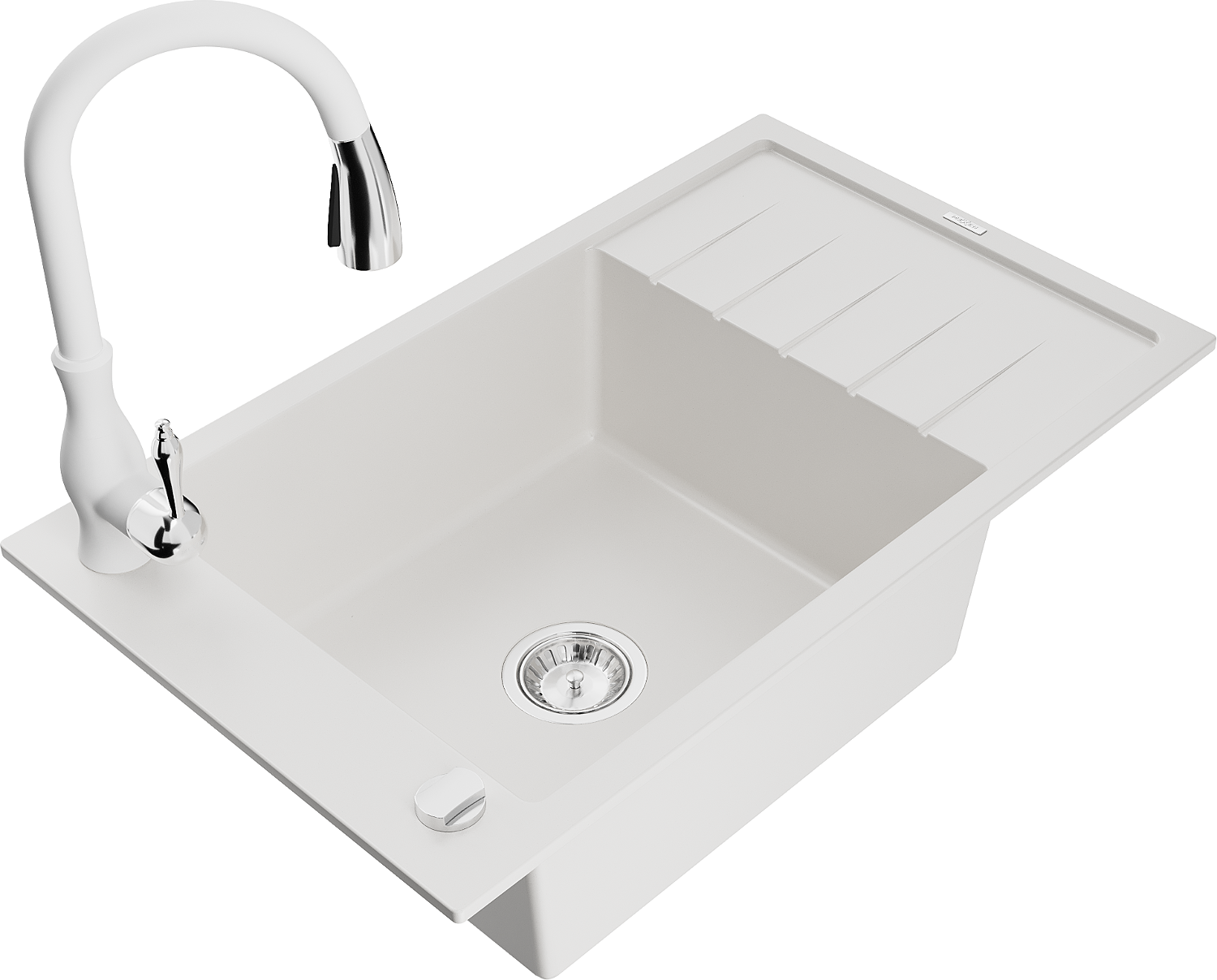 Mexen Elias zlewozmywak granitowy 1-komorowy z ociekaczem i baterią kuchenną Savita, biały - 6511-20-672601-20