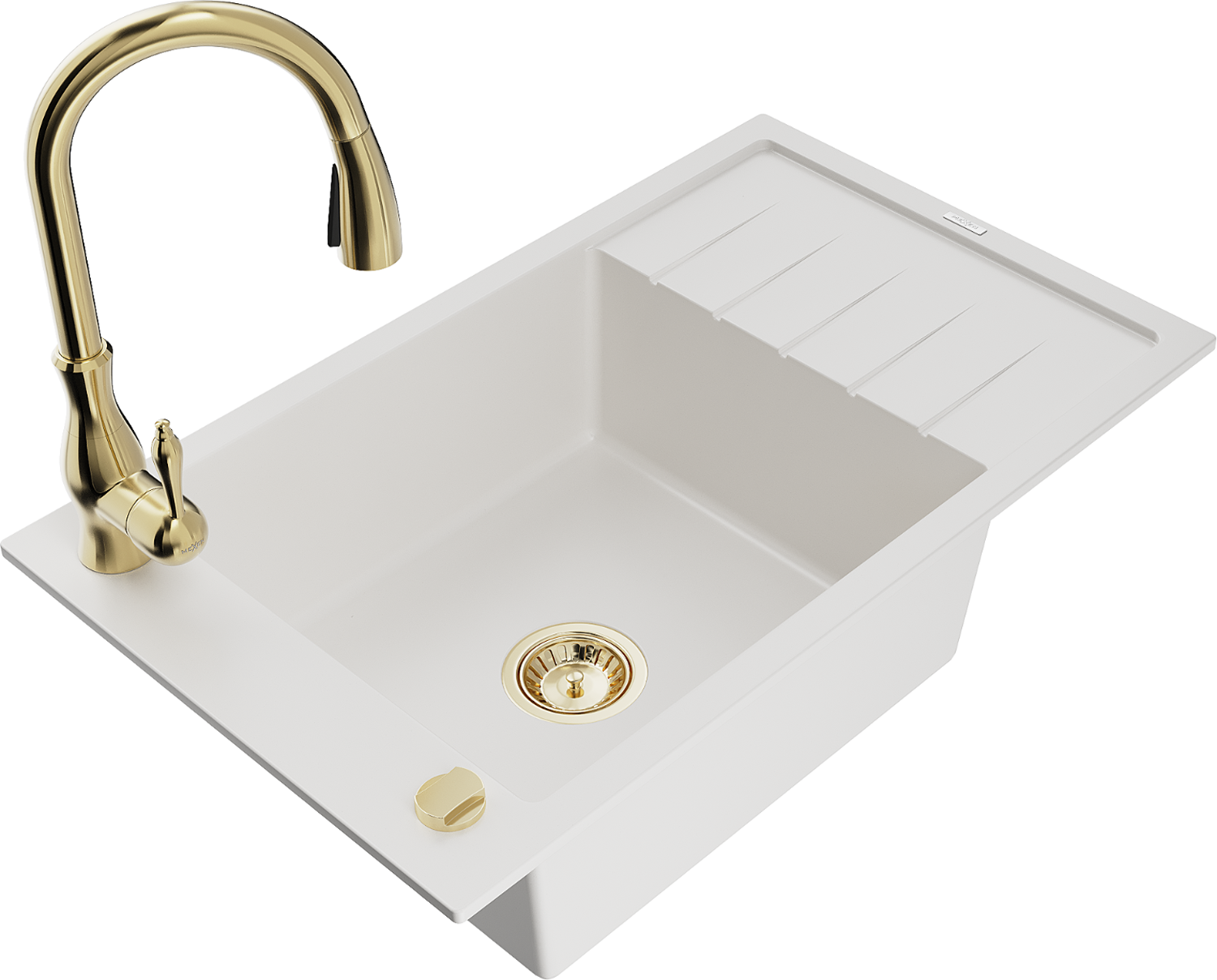 Mexen Elias zlewozmywak granitowy 1-komorowy z ociekaczem i baterią kuchenną Savita, biały - 6511-20-672601-50