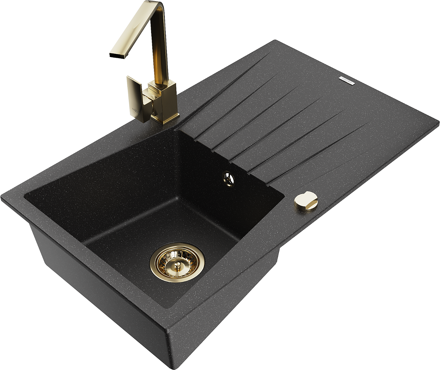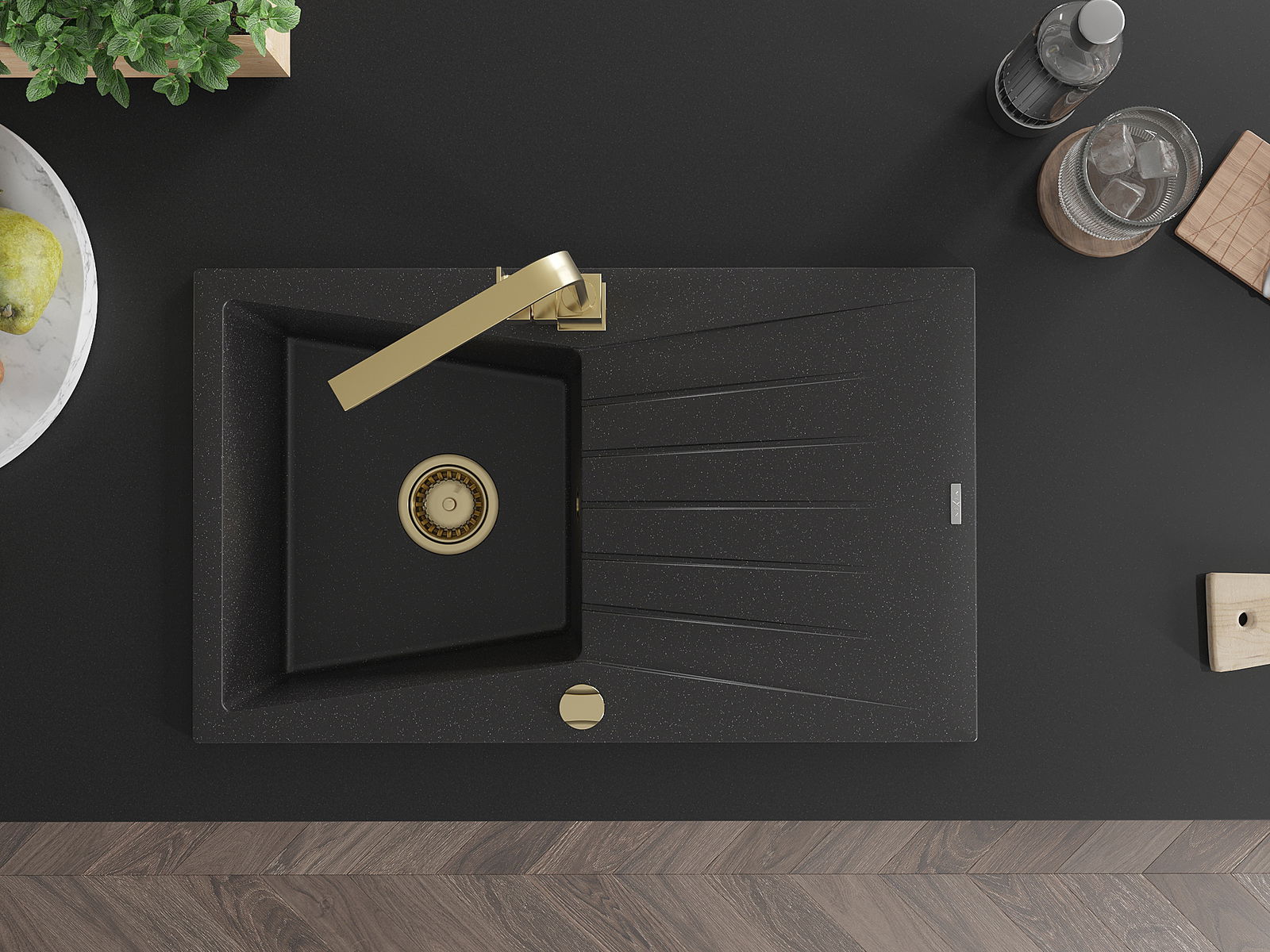 Mexen Cesar zlewozmywak granitowy 1-komorowy z ociekaczem i baterią kuchenną Rita, czarny/srebrny metalik - 6514-73-670300-50