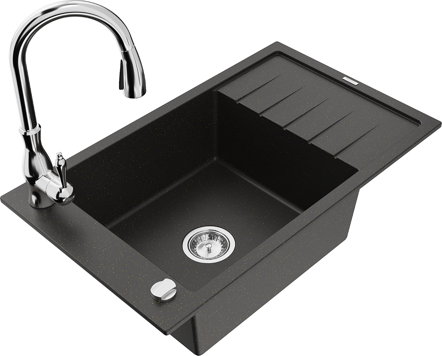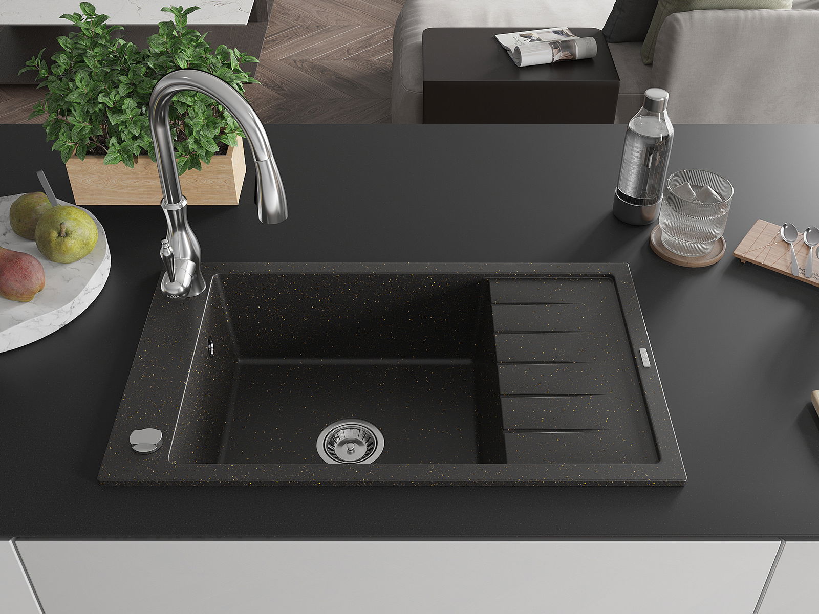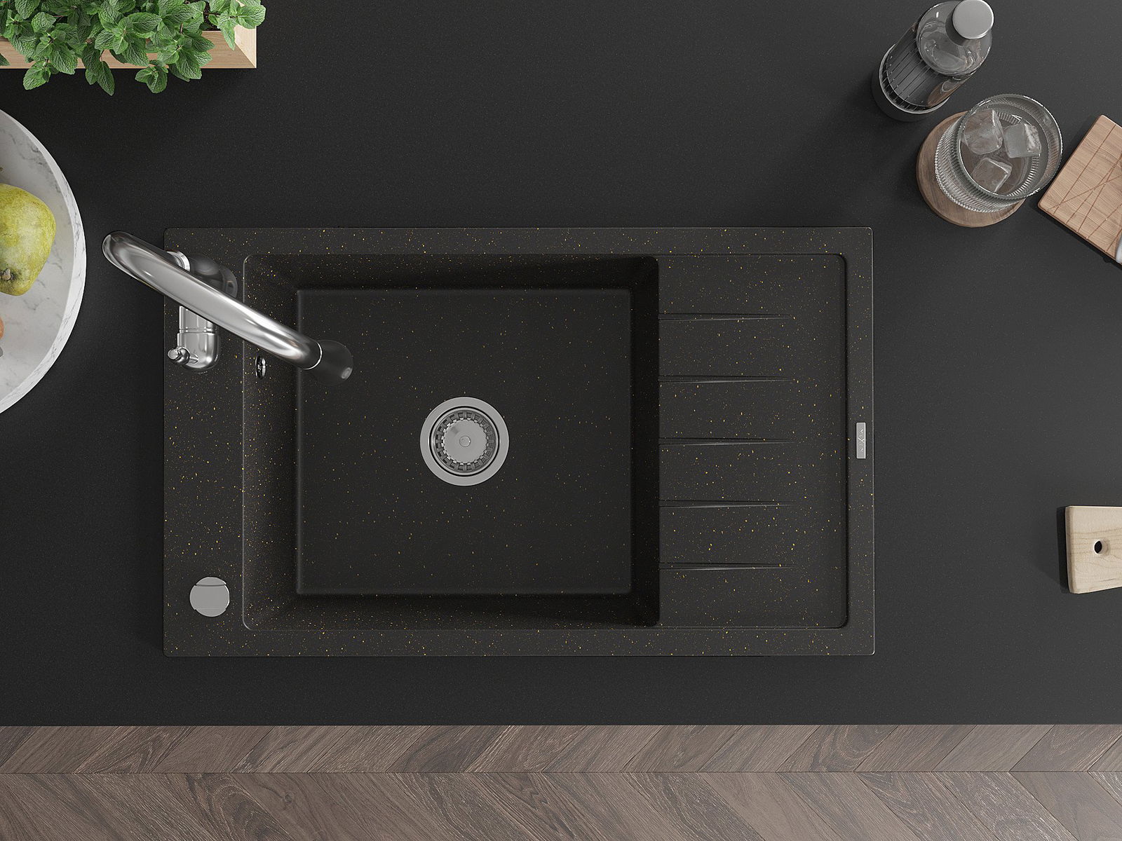 Mexen Elias zlewozmywak granitowy 1-komorowy z ociekaczem i baterią kuchenną Savita, czarny/złoty metalik- 6511-75-672601-00