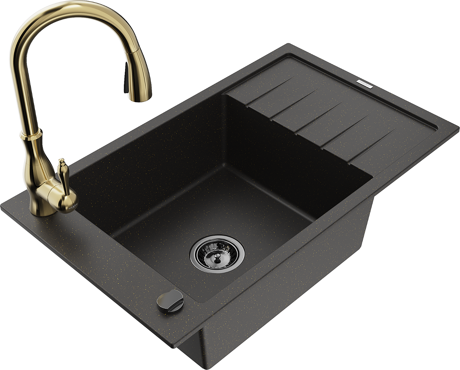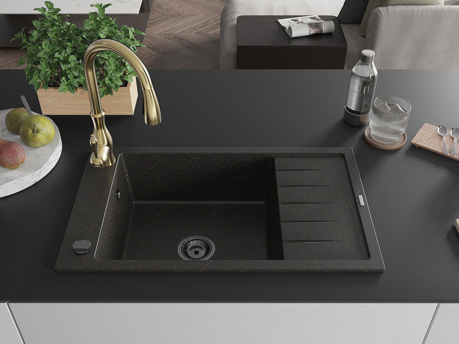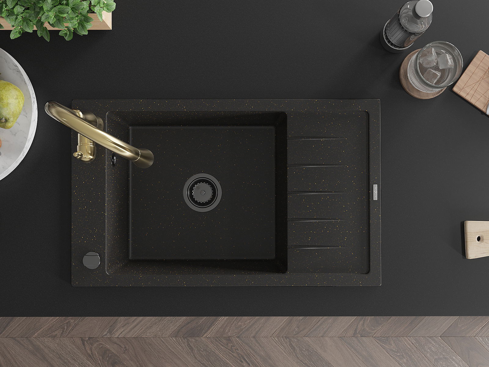 Mexen Elias zlewozmywak granitowy 1-komorowy z ociekaczem i baterią kuchenną Savita, czarny/złoty metalik - 6511-75-672601-50-B
