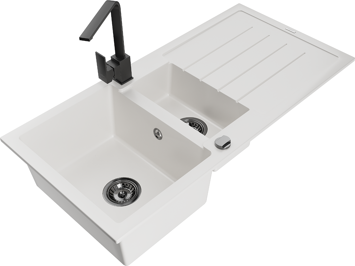 Mexen Andres zlewozmywak granitowy 1,5-komorowy z ociekaczem i baterią kuchenną Rita, biały - 6515-20-670300-70