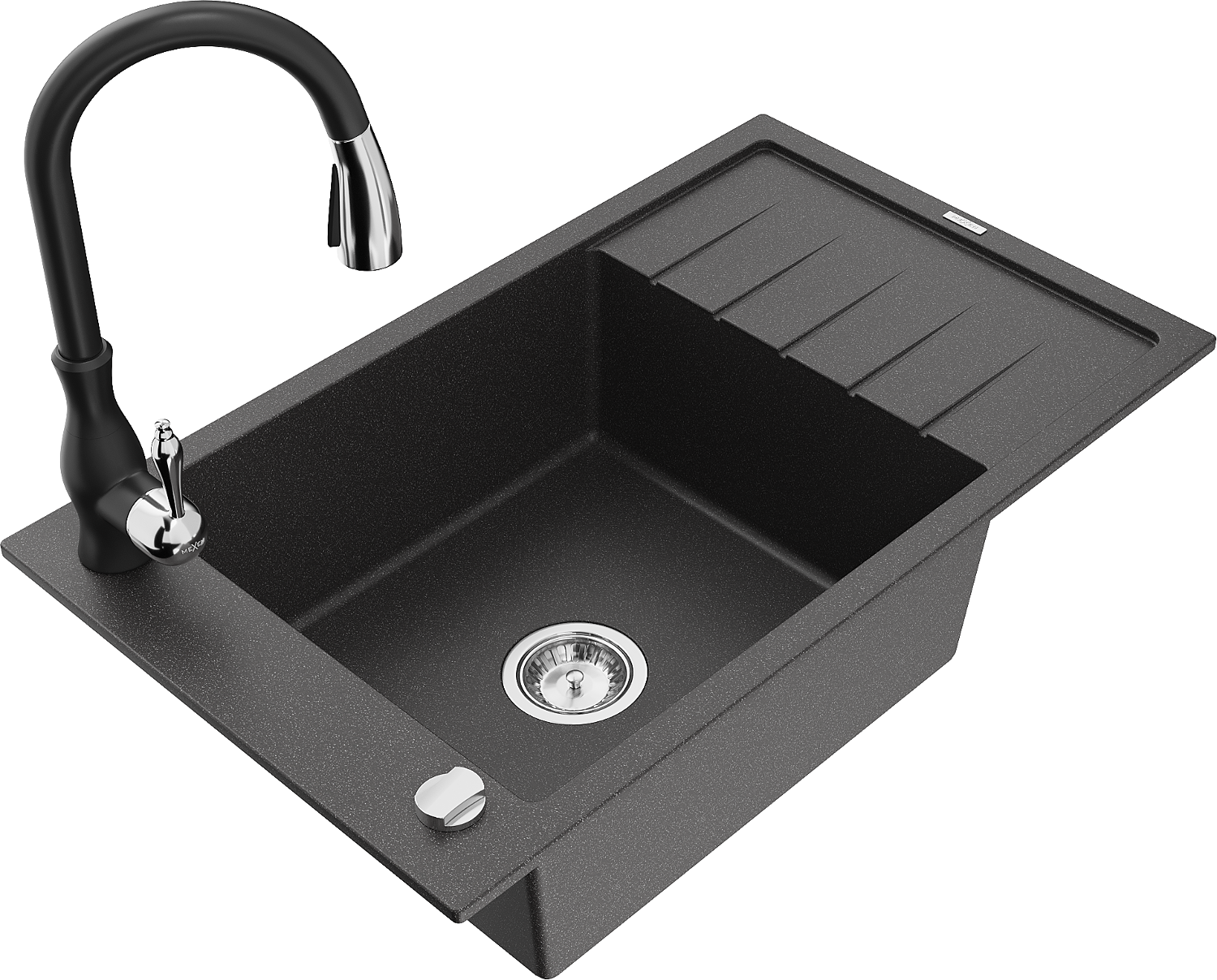 Mexen Elias zlewozmywak granitowy 1-komorowy z ociekaczem i baterią kuchenną Savita, czarny nakrapiany - 6511-76-672601-70