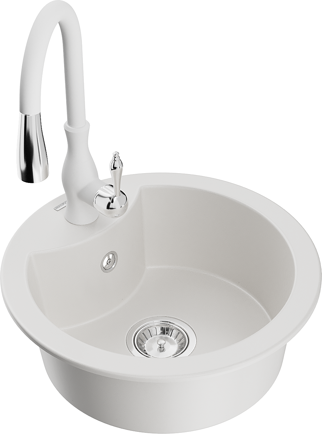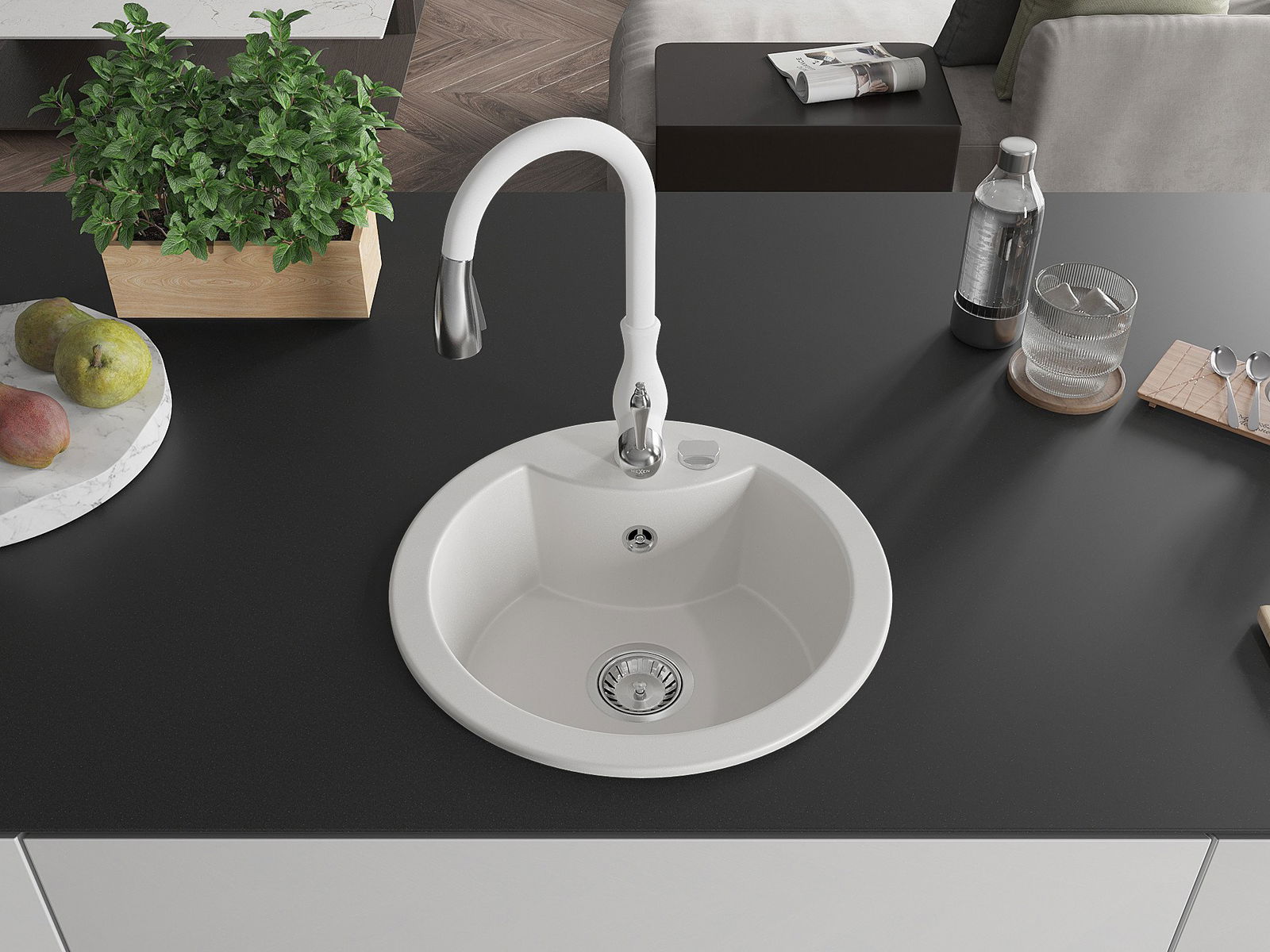 Mexen Diego zlewozmywak granitowy 1-komorowy z baterią kuchenną Savita, biały - 6512-20-672601-20