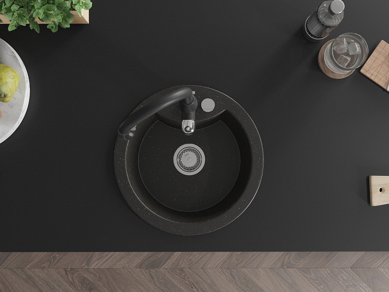 Zlew posiada podfrezowany otwór o średnicy 35 mm do samodzielnego wybicia. Można go wykorzystać m.in. do montażu dozownika na płyn, który wyeliminuje obecność plastikowych butelek w kuchni i nada jej eleganckiego wykończenia.
