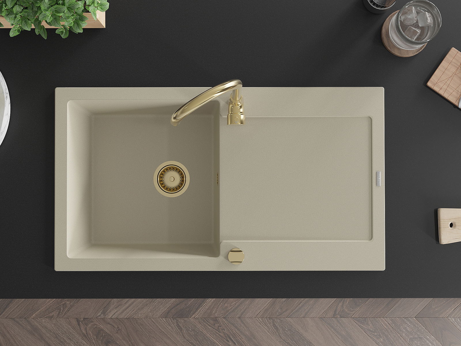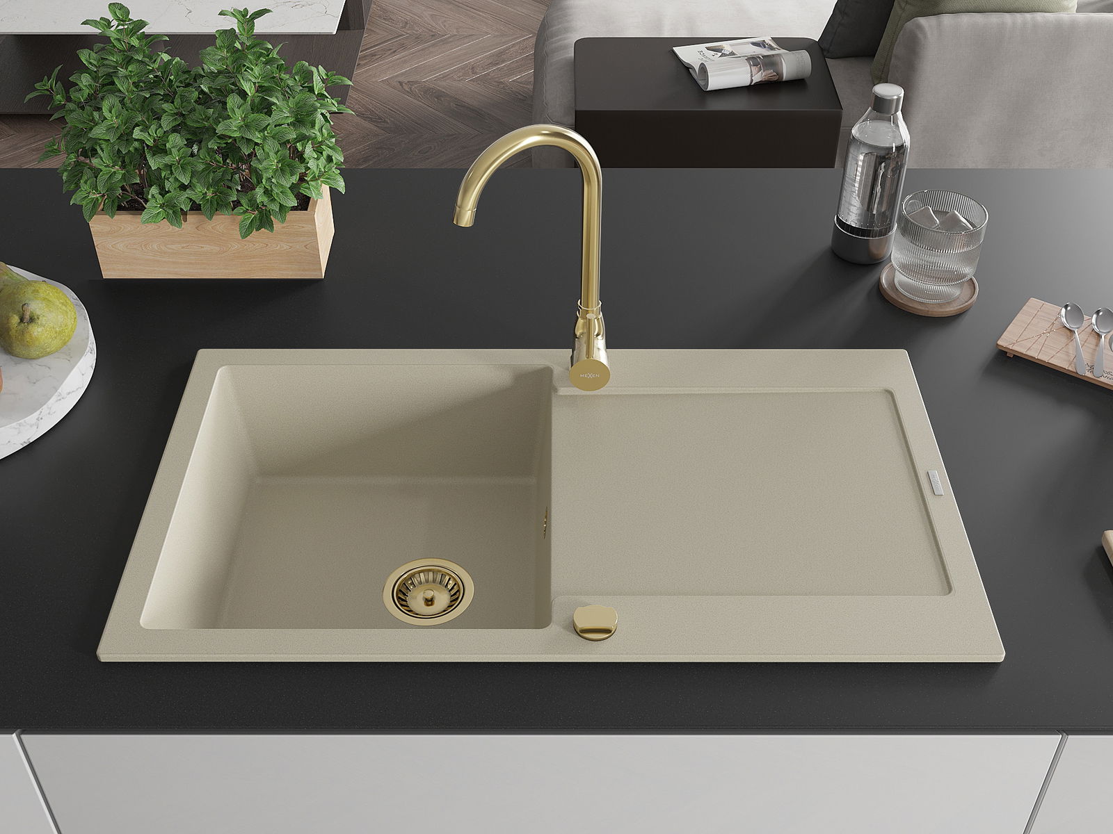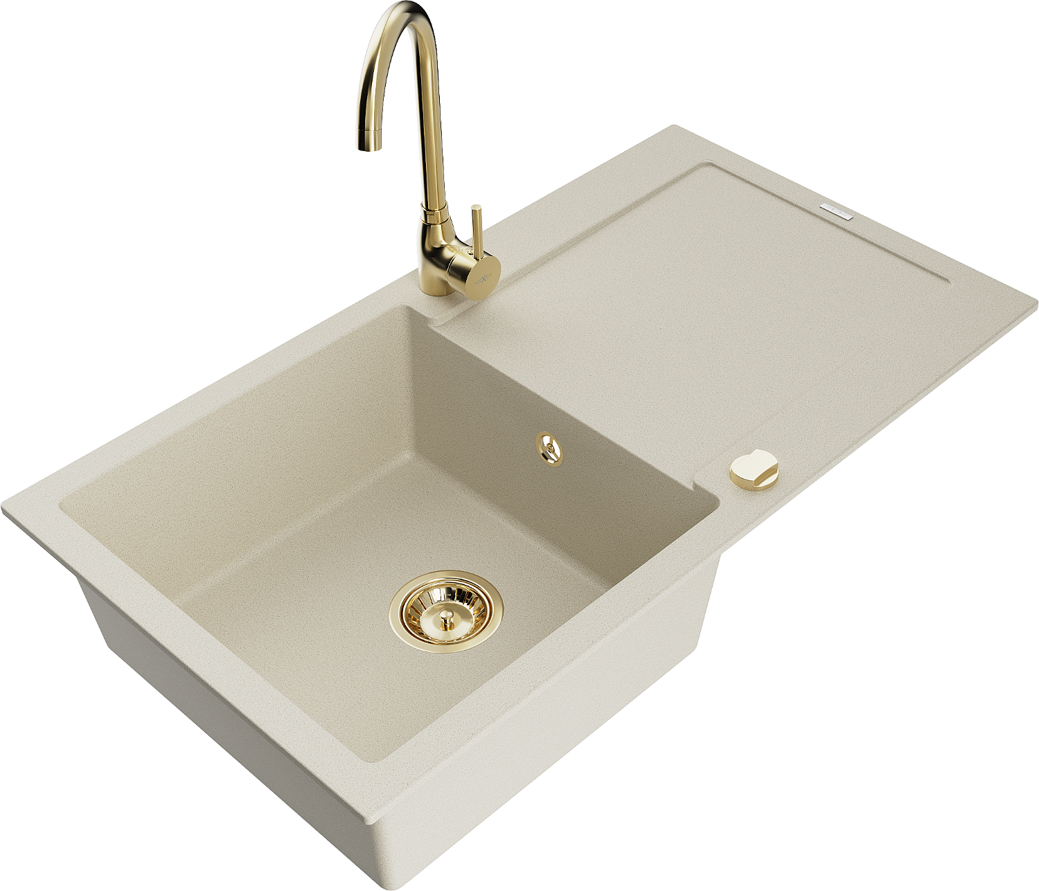 Mexen Leo zlewozmywak granitowy 1-komorowy z ociekaczem i baterią kuchenną Telma, beżowy - 6501-69-670200-50