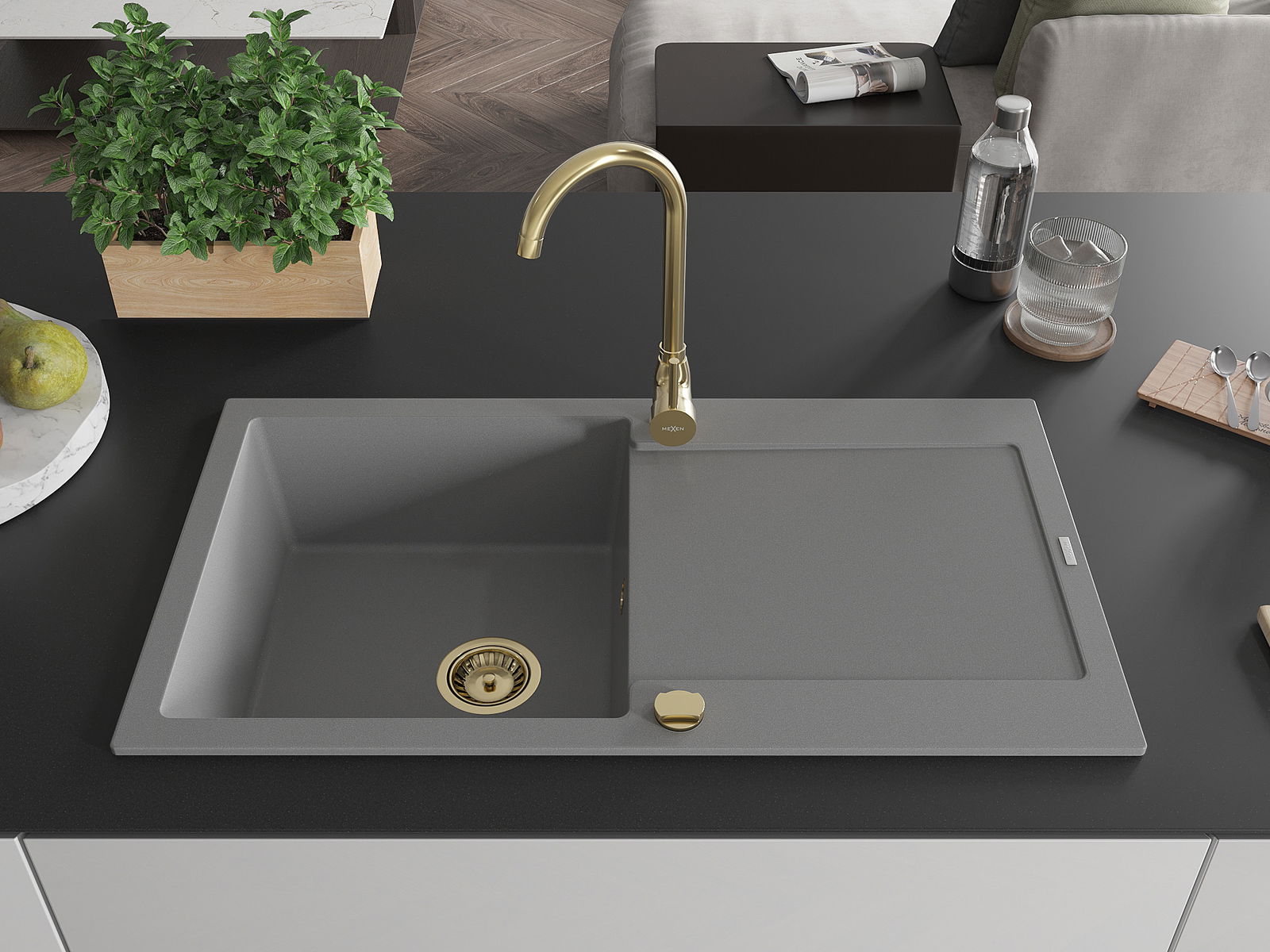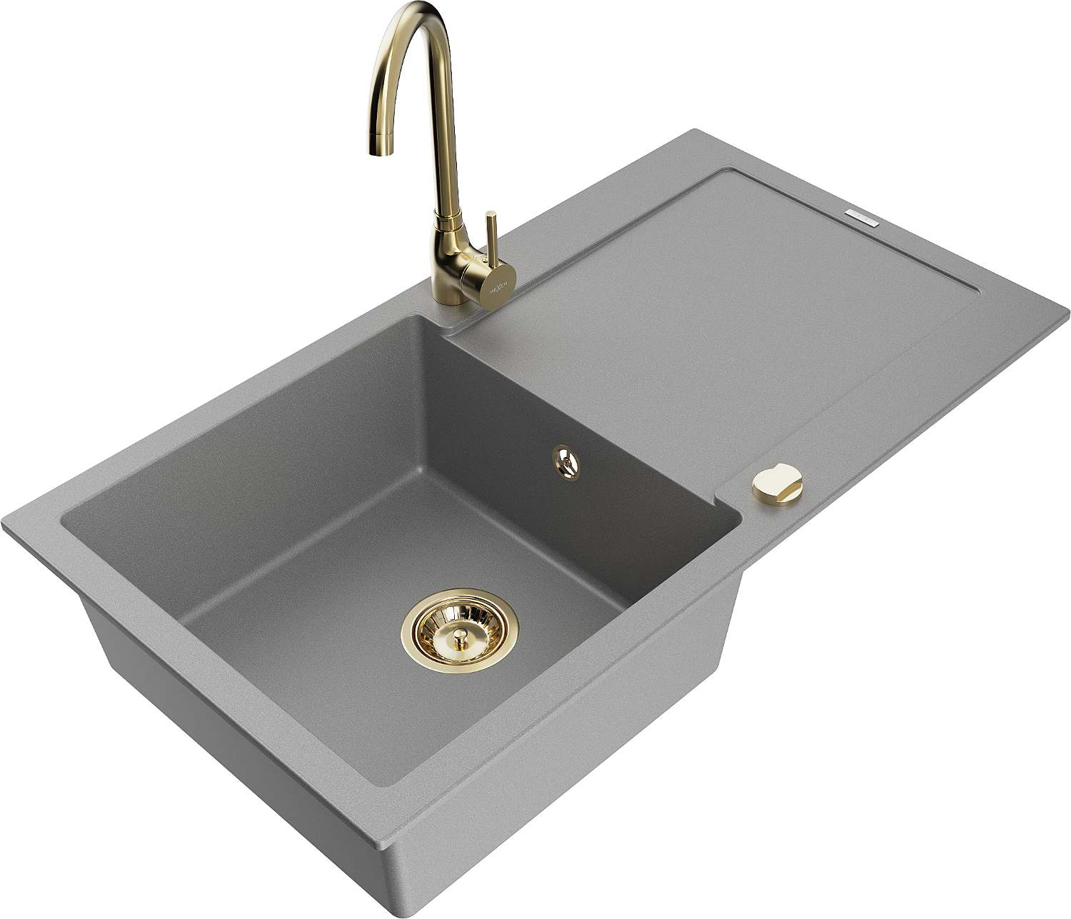 Mexen Leo zlewozmywak granitowy 1-komorowy z ociekaczem i baterią kuchenną Telma, szary - 6501-71-670200-50