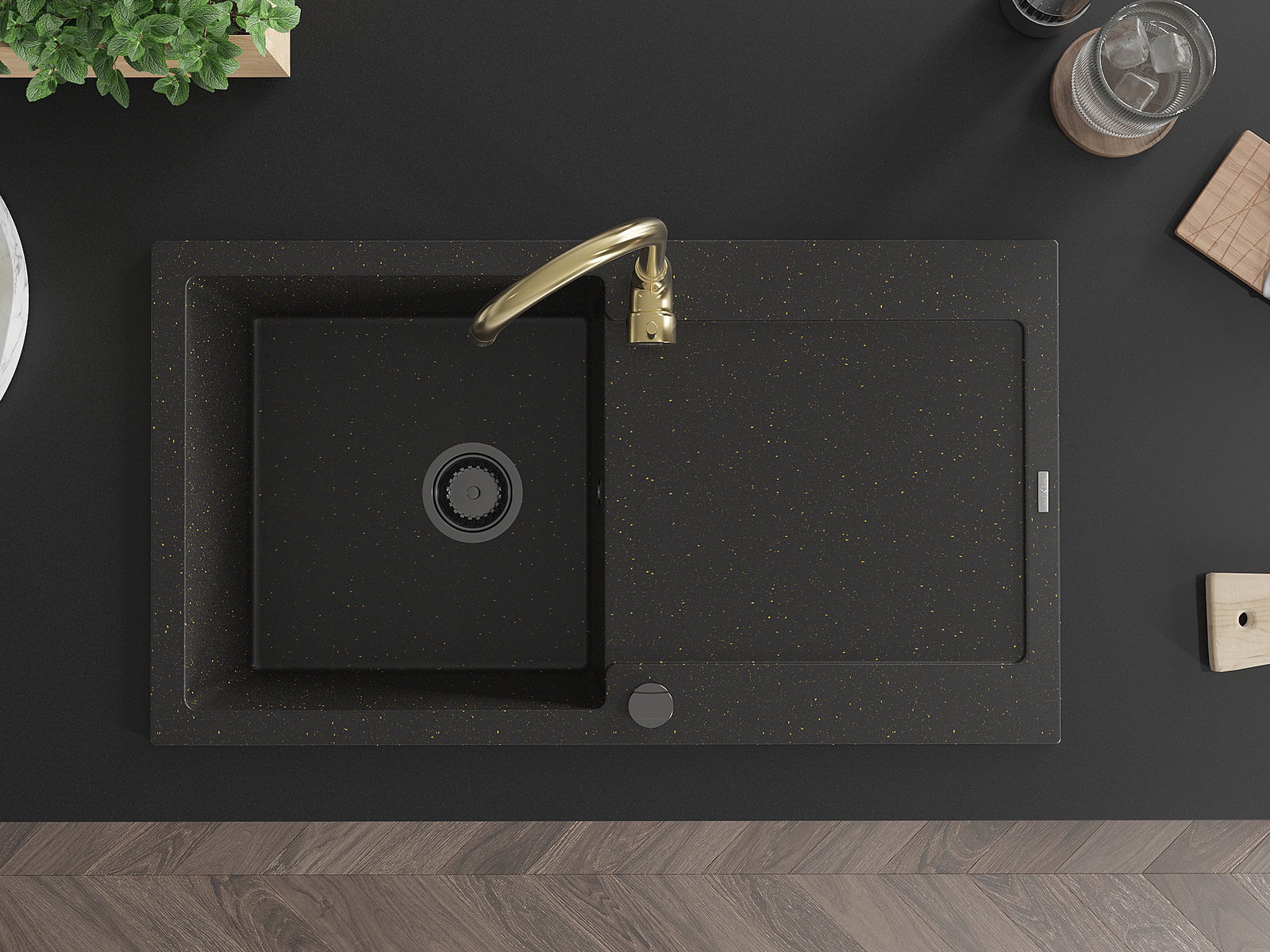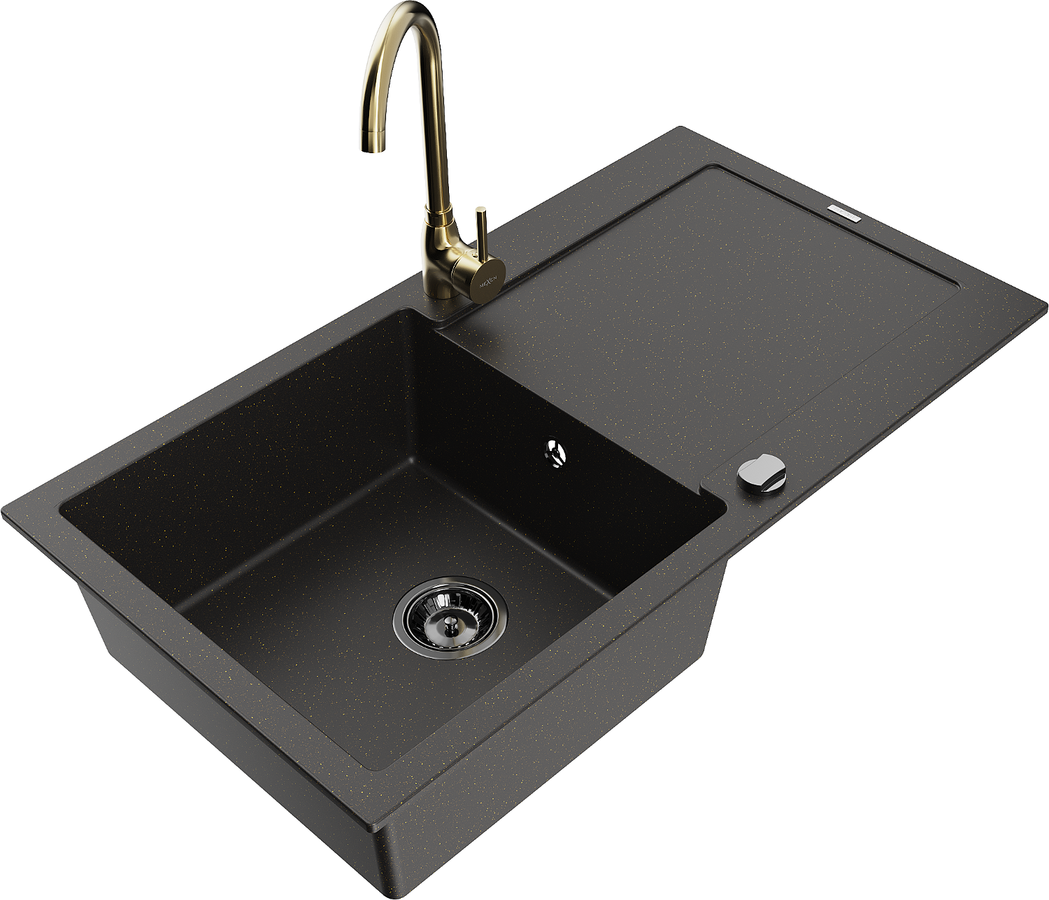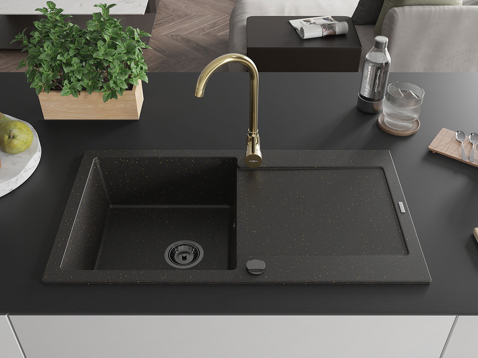Mexen Leo zlewozmywak granitowy 1-komorowy z ociekaczem i baterią kuchenną Telma, czarny/złoty metalik - 6501-75-670200-50-B