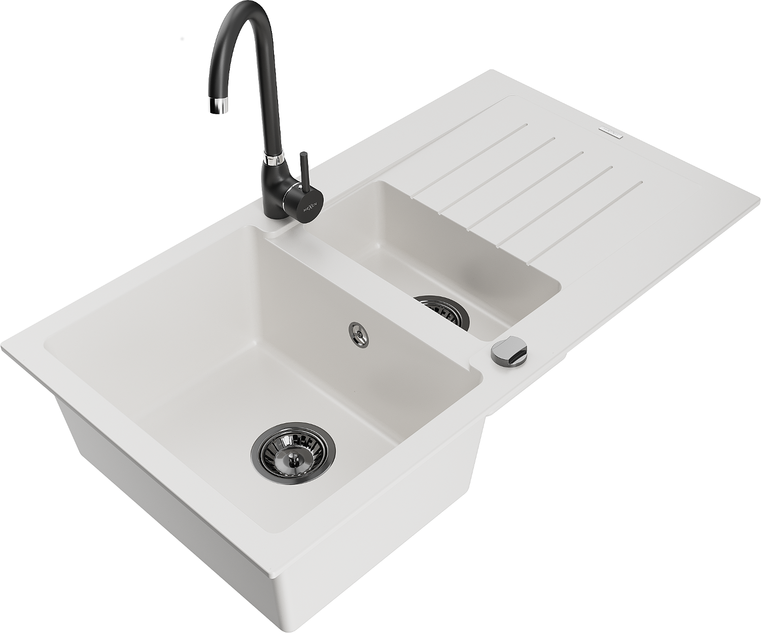 Mexen Matias zlewozmywak granitowy 1,5-komorowy z ociekaczem i baterią kuchenną Telma, biały - 6502-20-670200-70