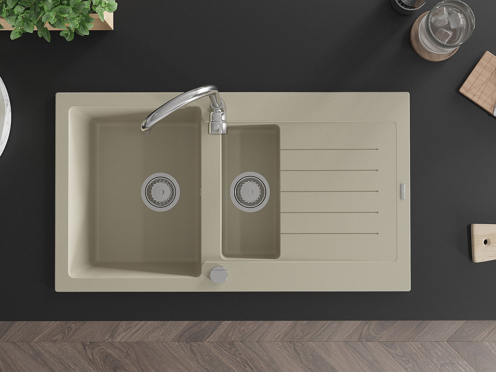 Mexen Matias zlewozmywak granitowy 1,5-komorowy z ociekaczem i baterią kuchenną Telma, beżowy - 6502-69-670200-00