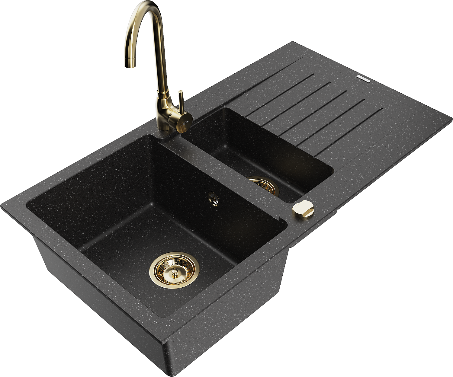Mexen Matias zlewozmywak granitowy 1,5-komorowy z ociekaczem i baterią kuchenną Telma, czarny/srebrny - 6502-73-670200-50