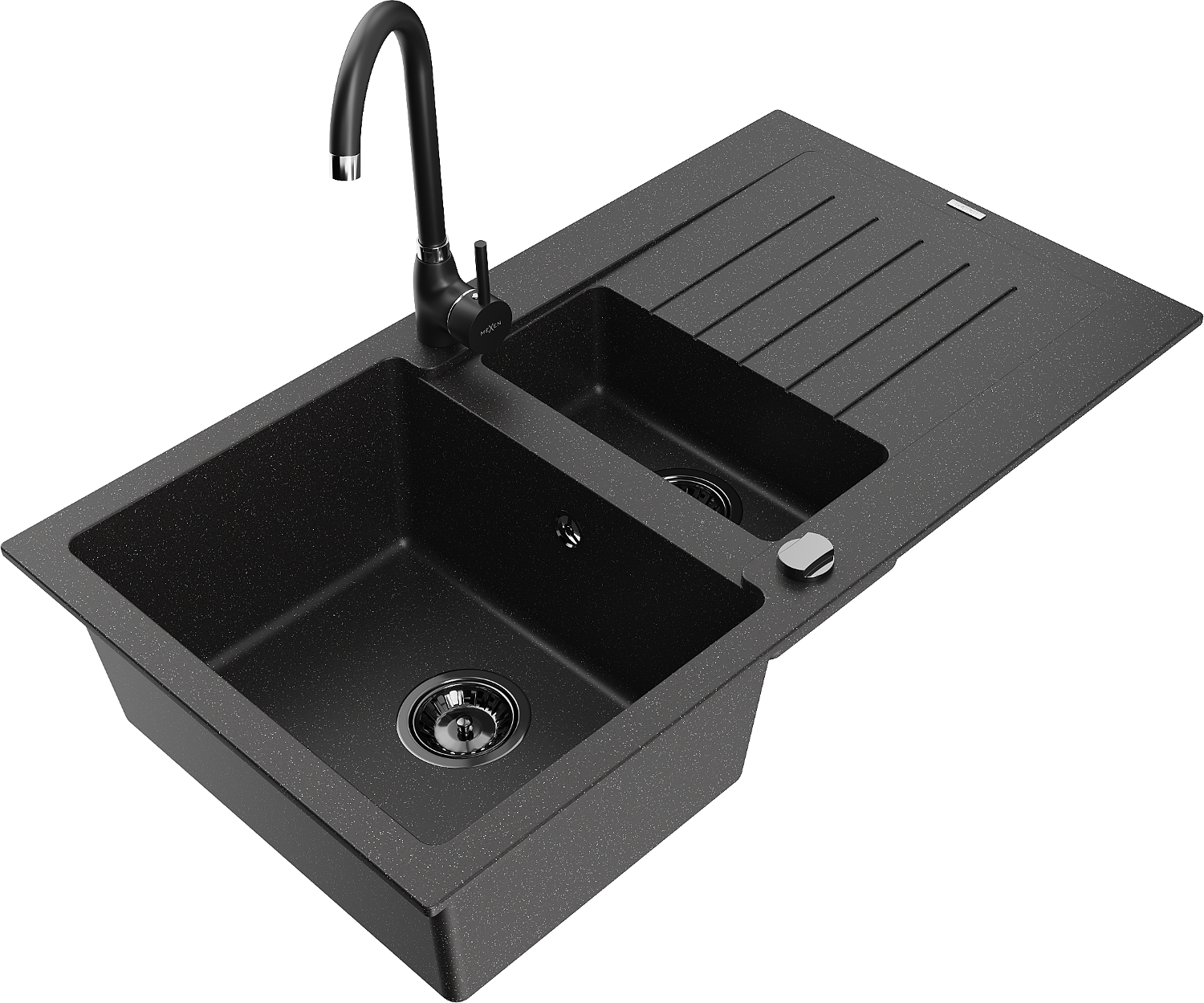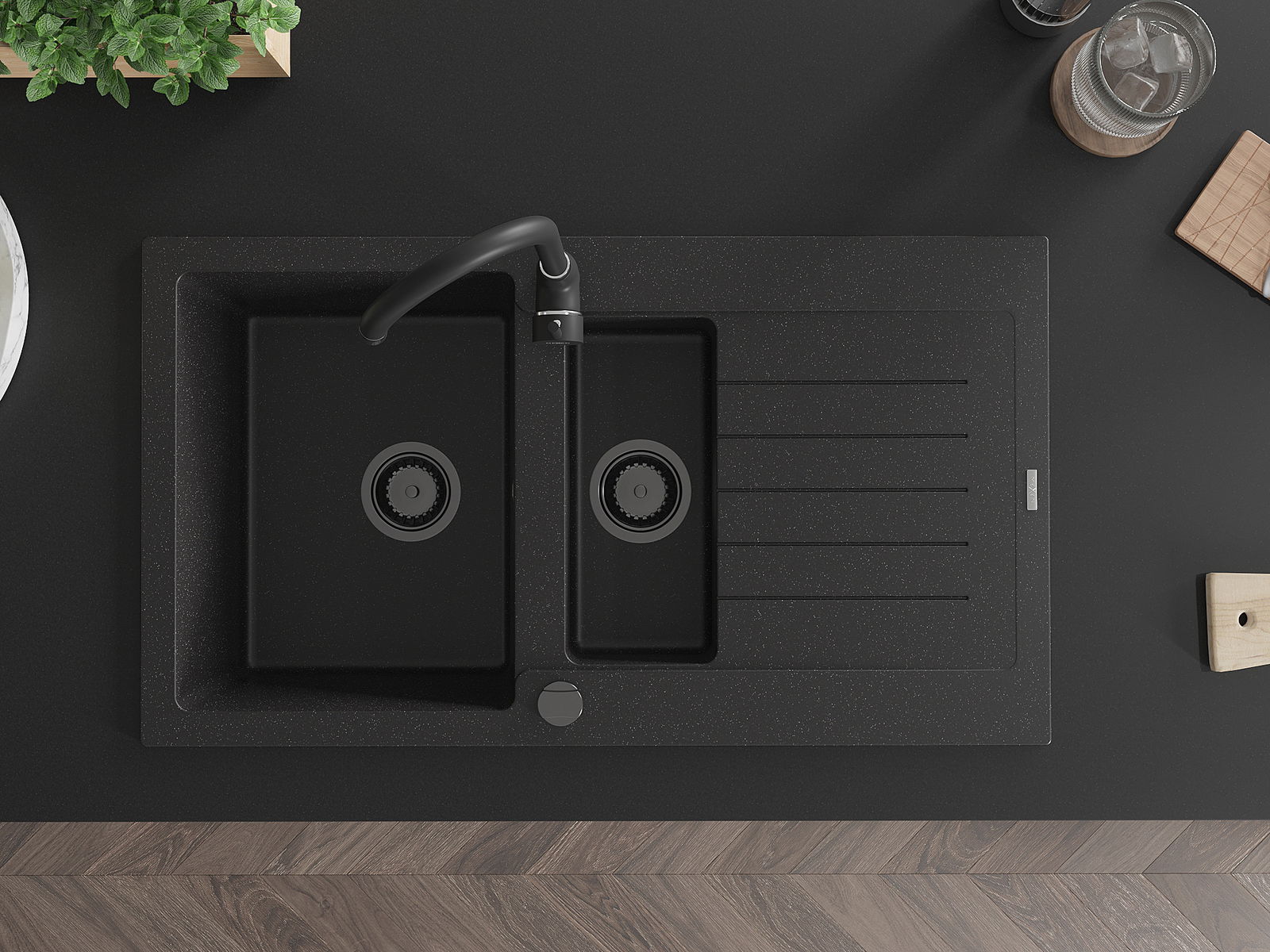 Mexen Matias zlewozmywak granitowy 1,5-komorowy z ociekaczem i baterią kuchenną Telma, czarny/srebrny - 6502-73-670200-70-B
