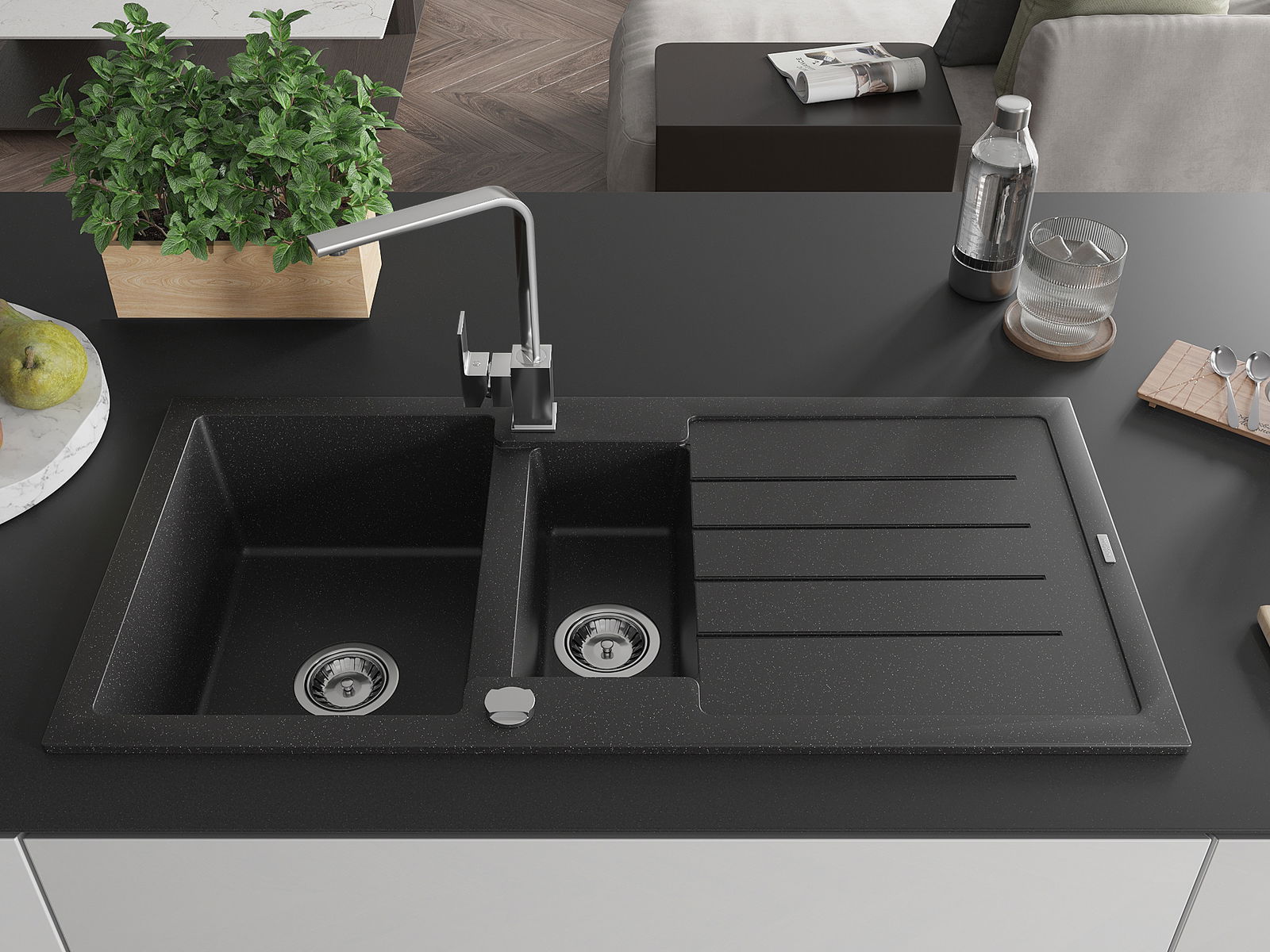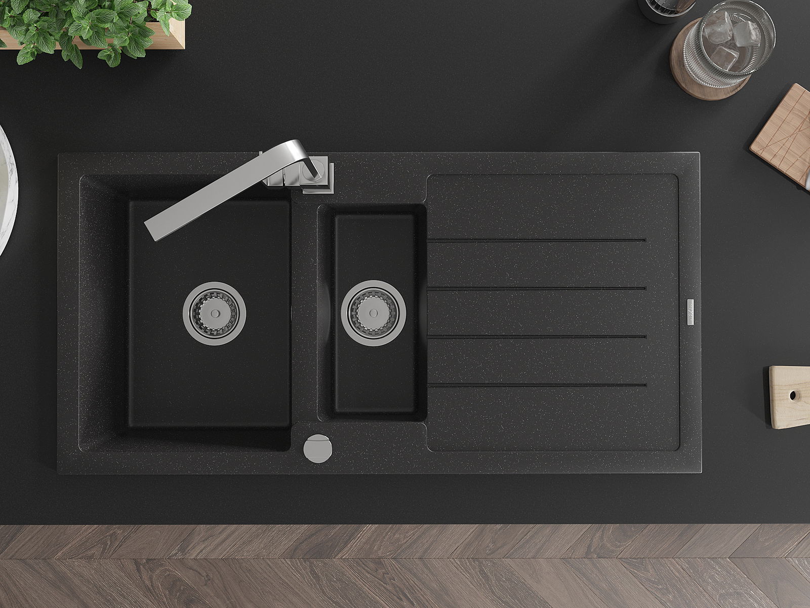 Mexen Andres zlewozmywak granitowy 1,5-komorowy z ociekaczem i baterią kuchenną Rita, czarny/srebrny metalik - 6515-73-670300-00