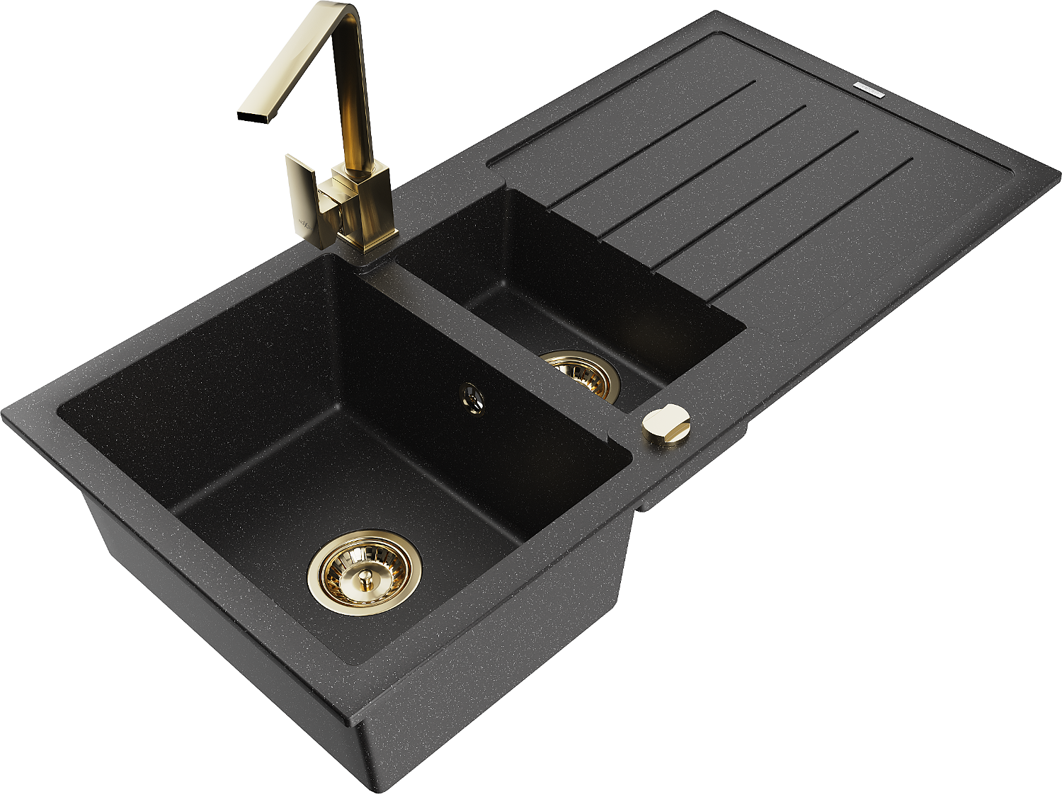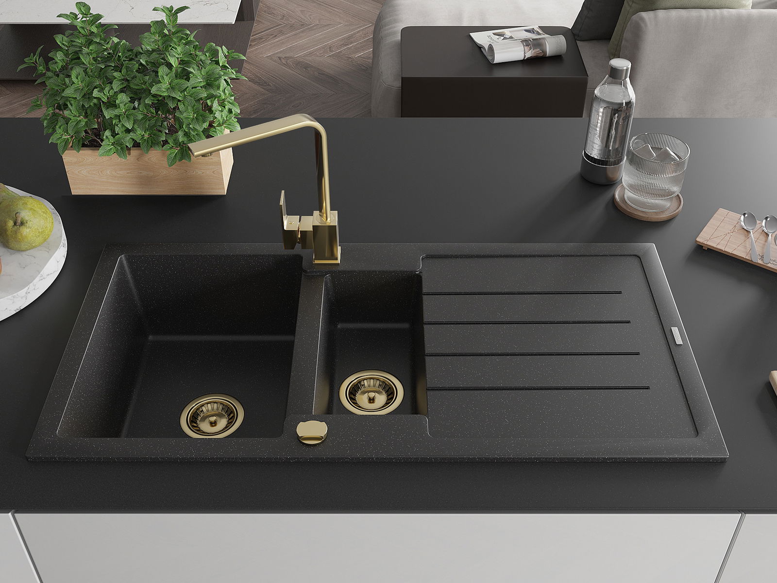 Mexen Andres zlewozmywak granitowy 1,5-komorowy z ociekaczem i baterią kuchenną Rita, czarny/srebrny metalik - 6515-73-670300-50